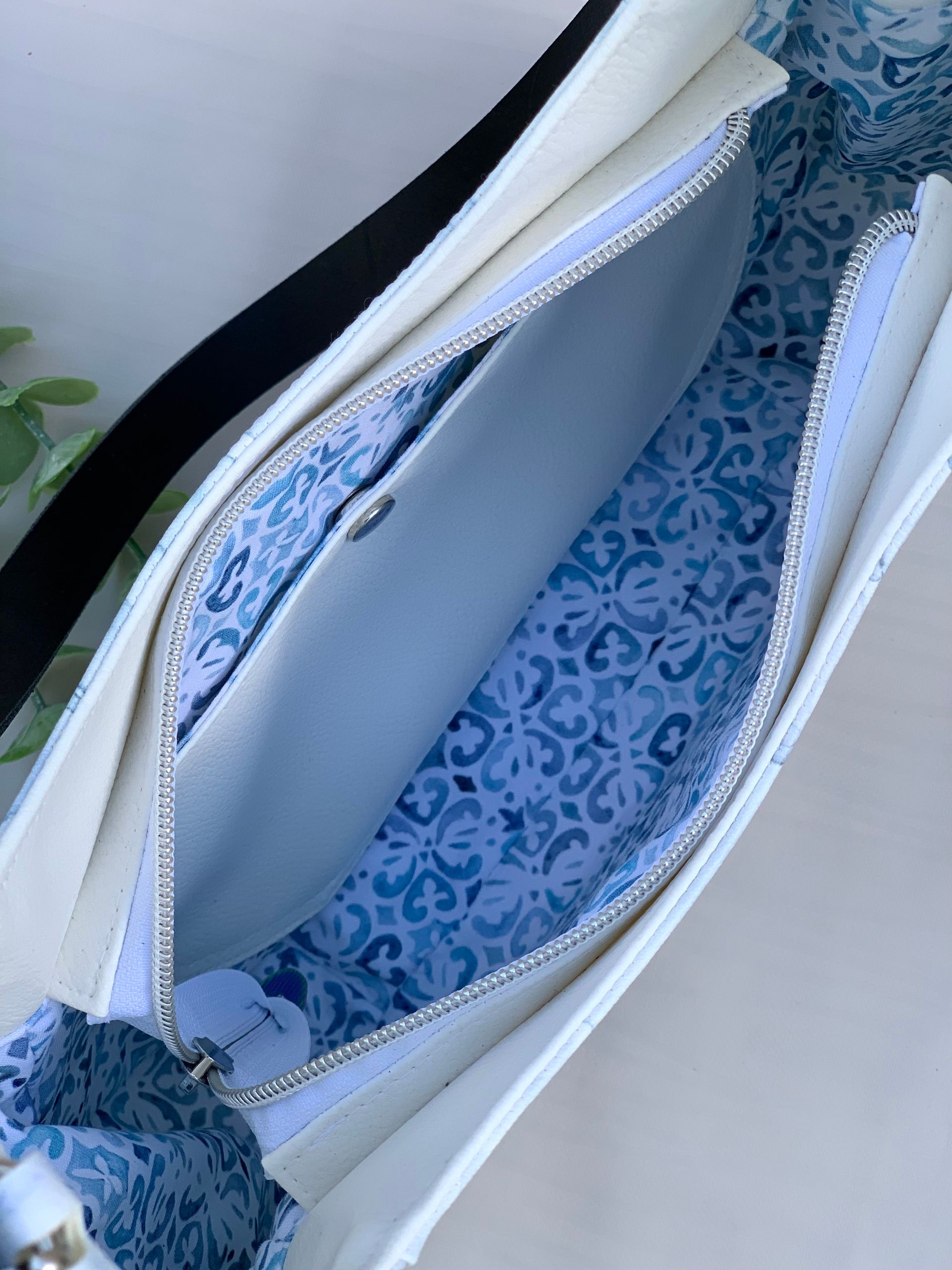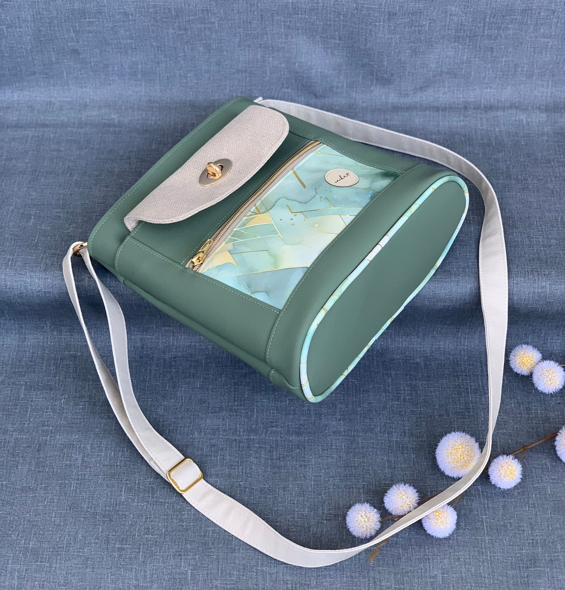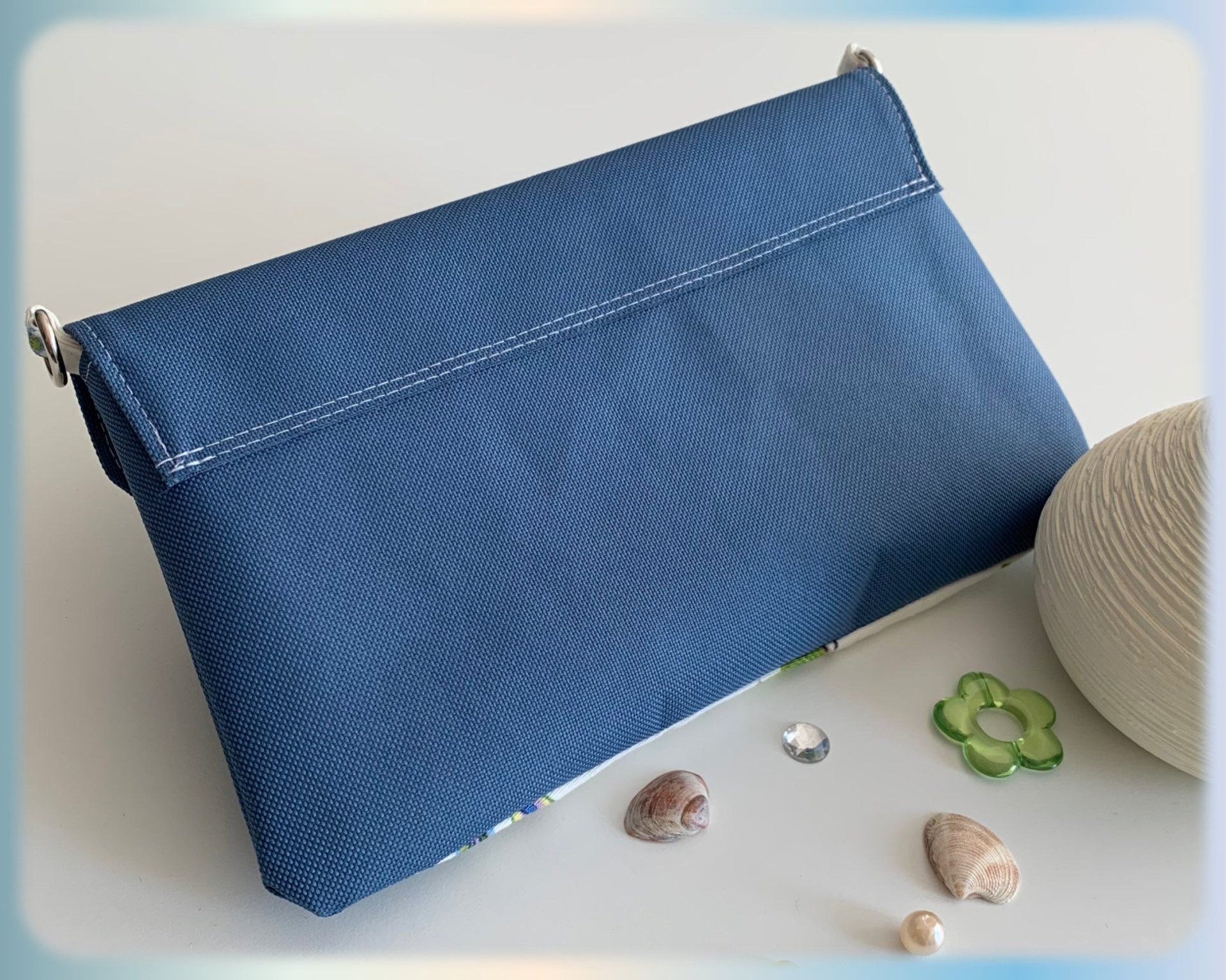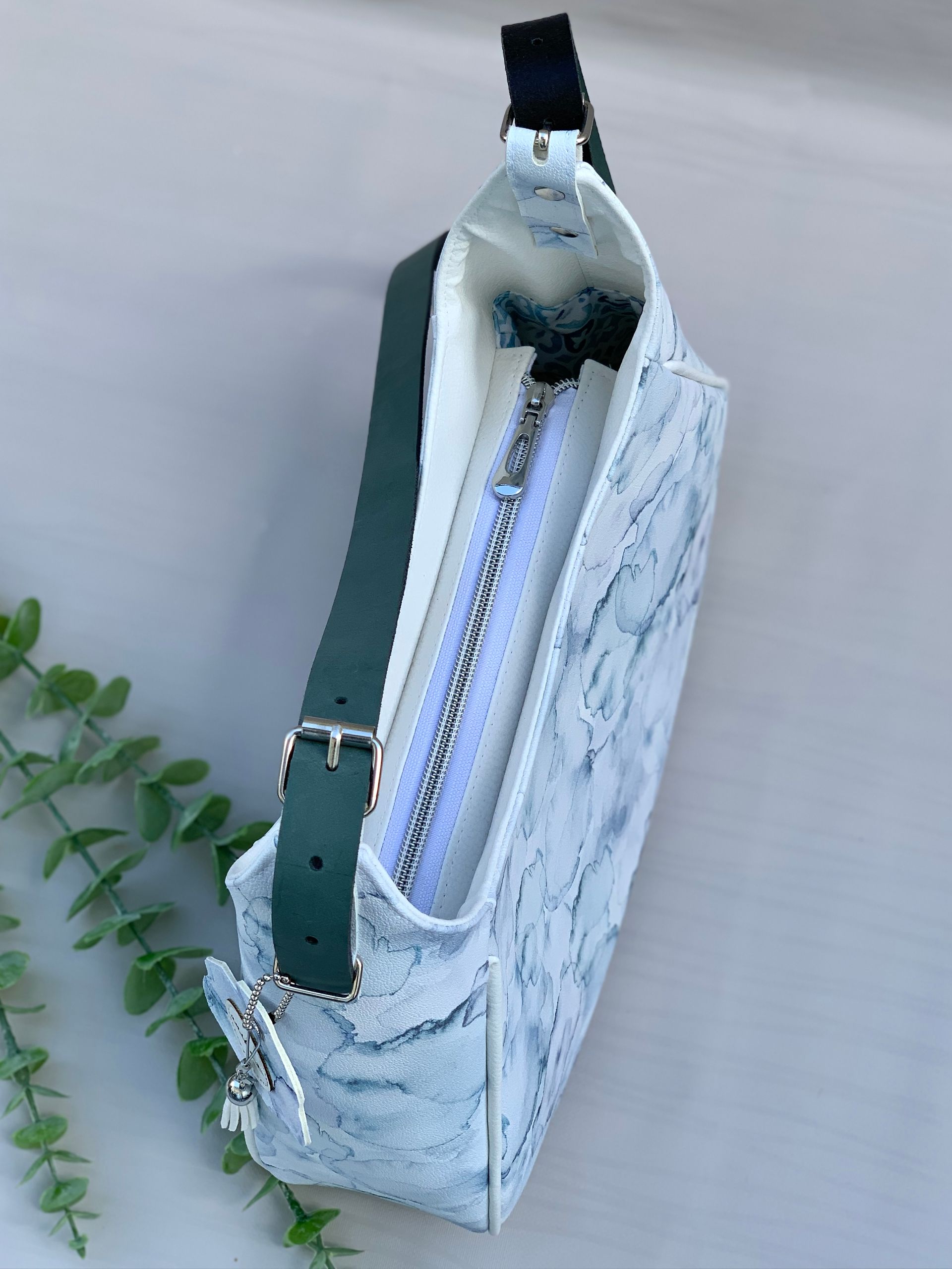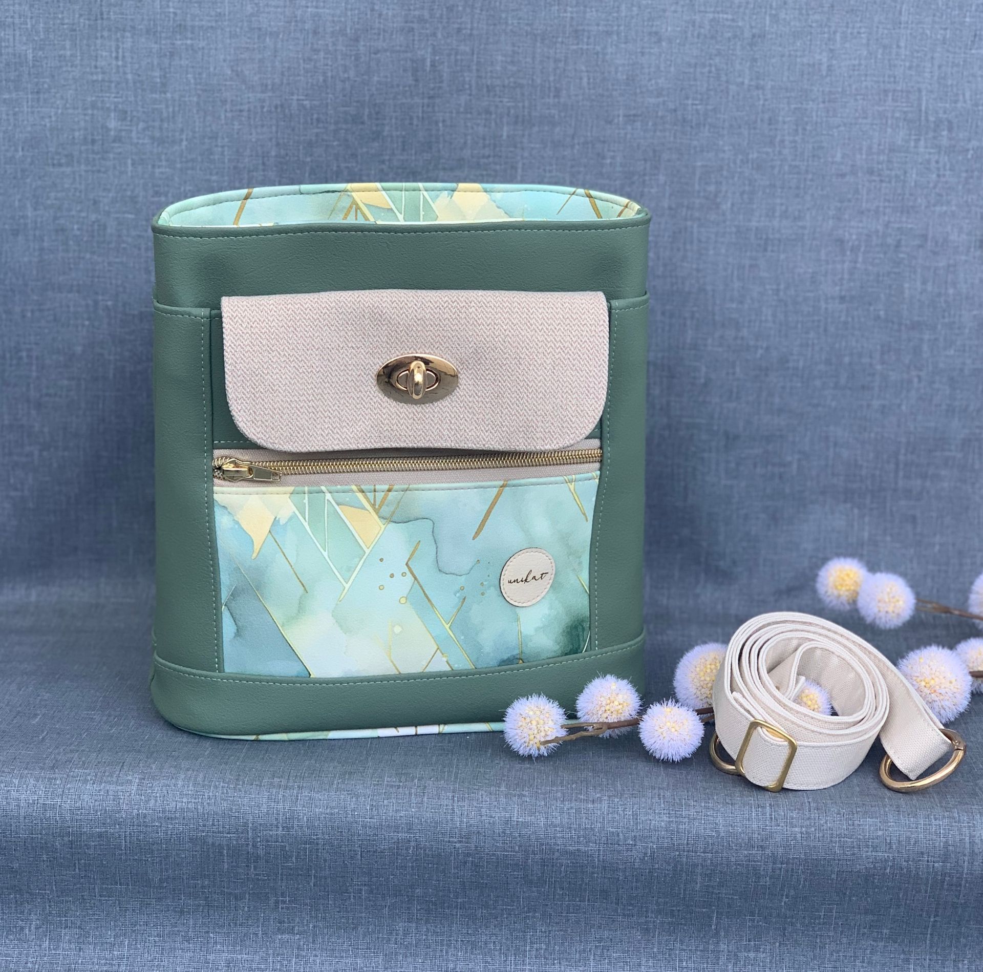 - Material: Kunstleder (Weiß-Watercolor Blau Grün), Baumwolle/Canvas (innen: Weiß-Blau gemustert)