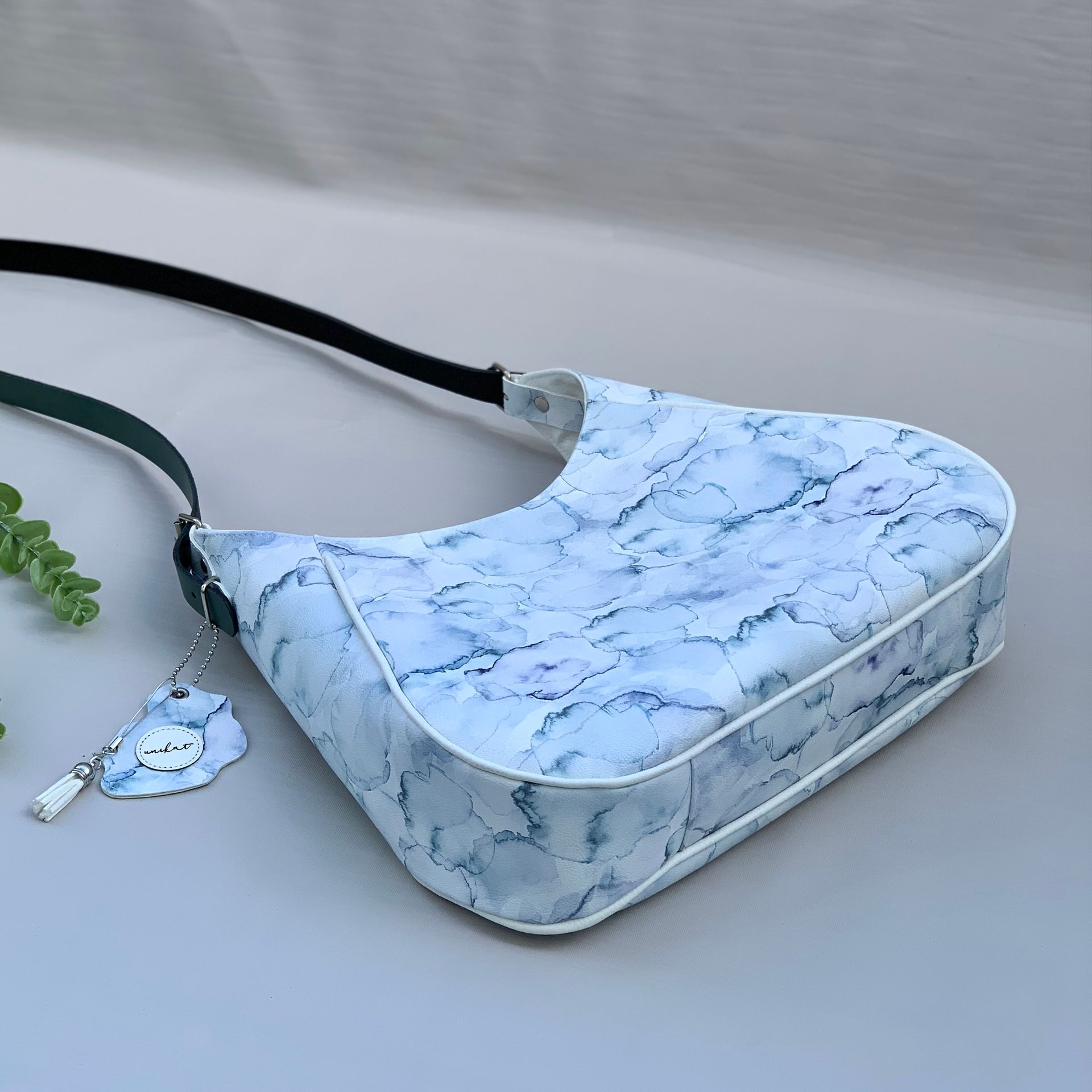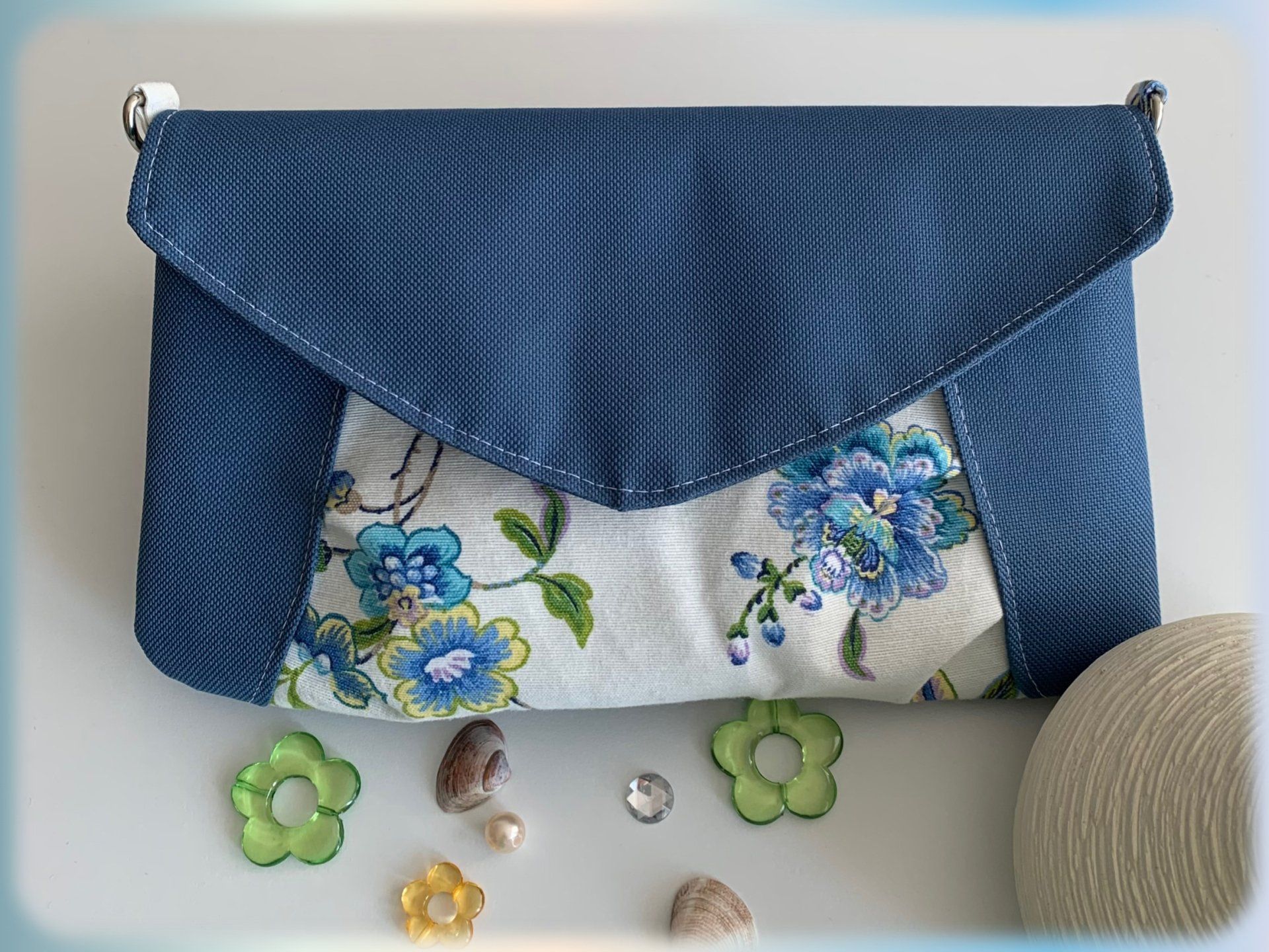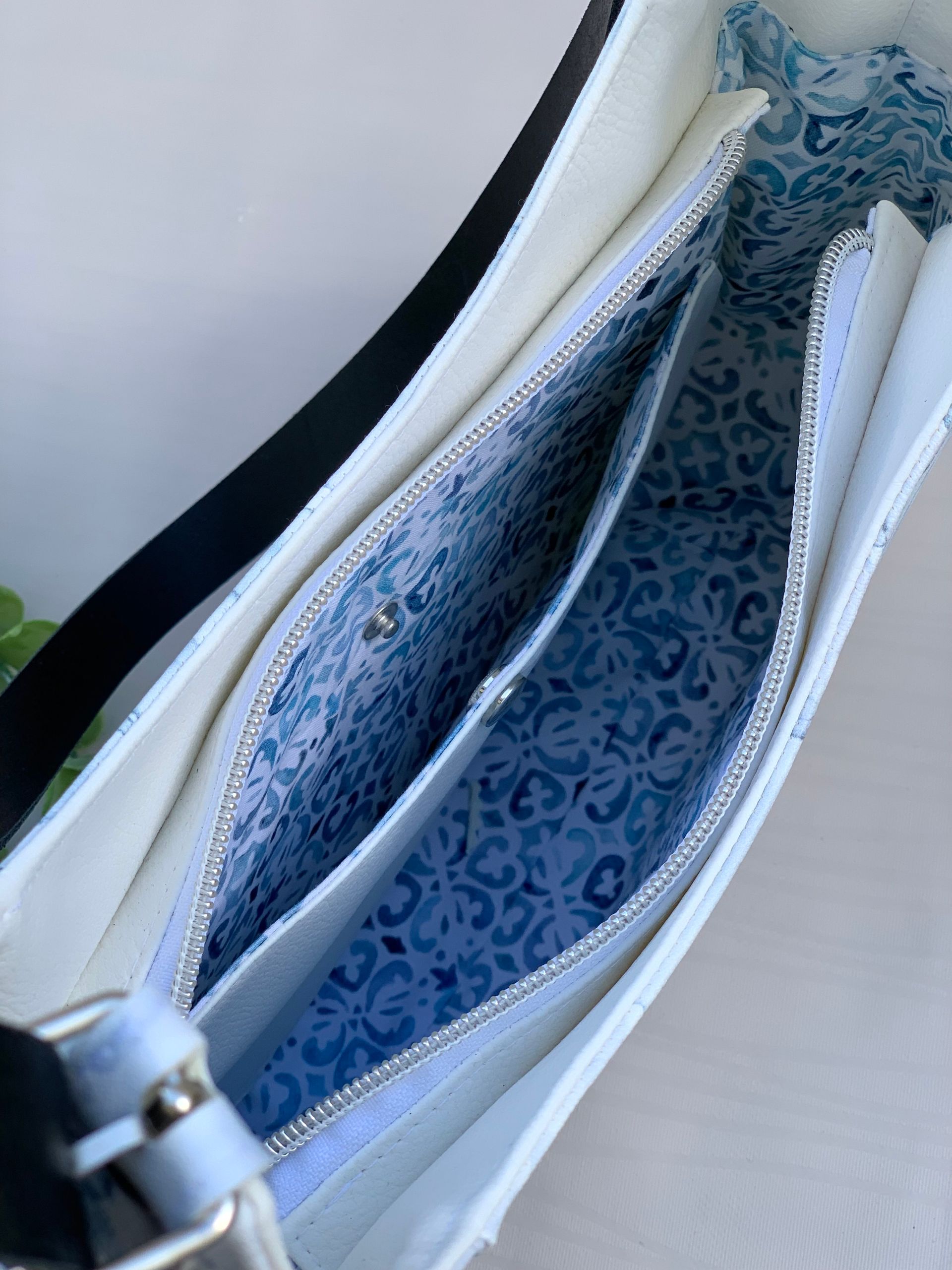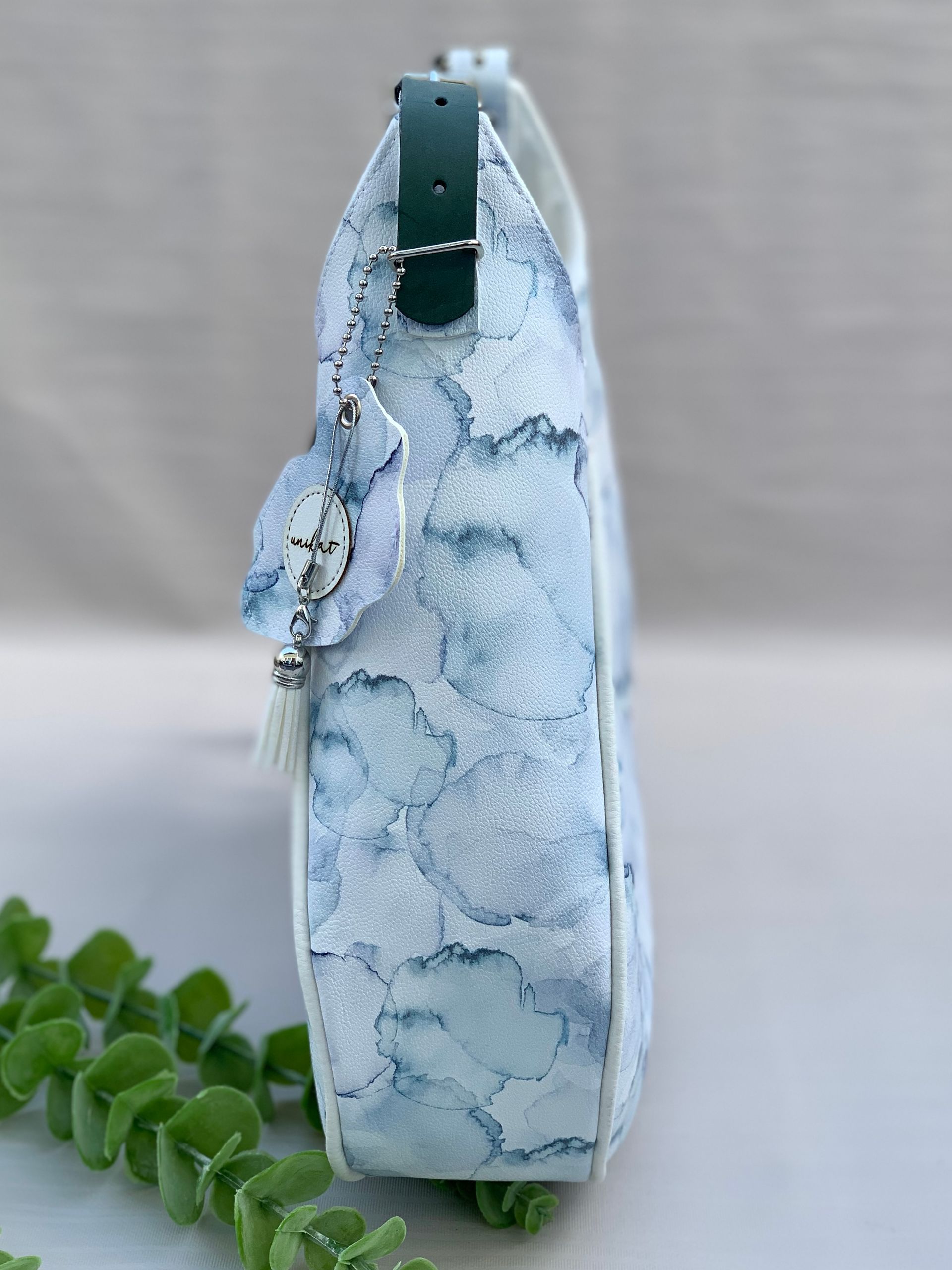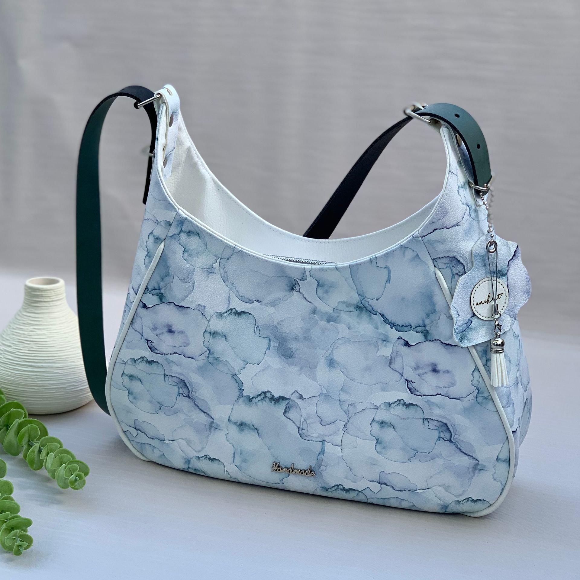 - Material: Kunstleder (Weiß-Watercolor Blau Grün), Baumwolle/Canvas (innen: Weiß-Blau gemustert)