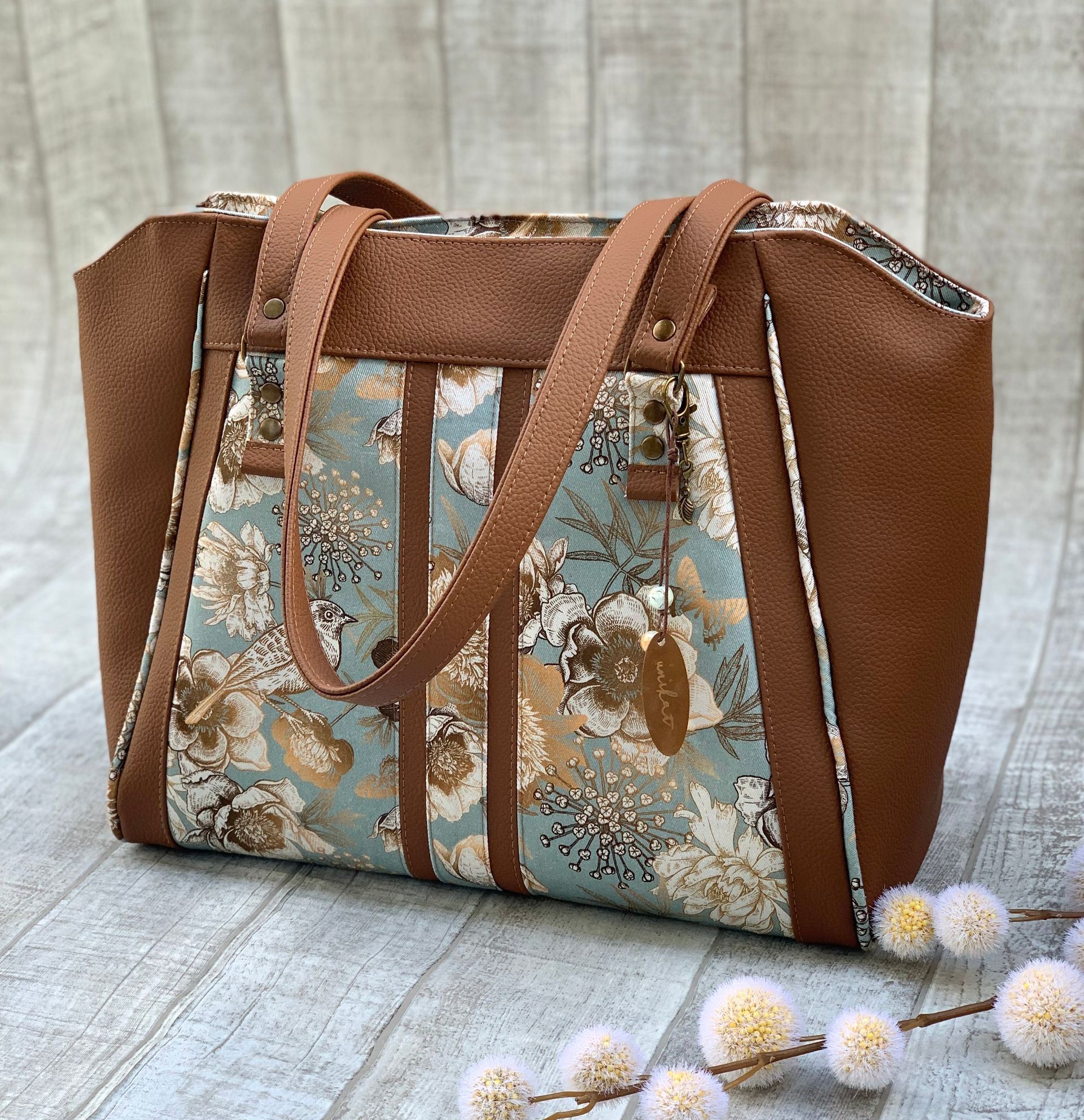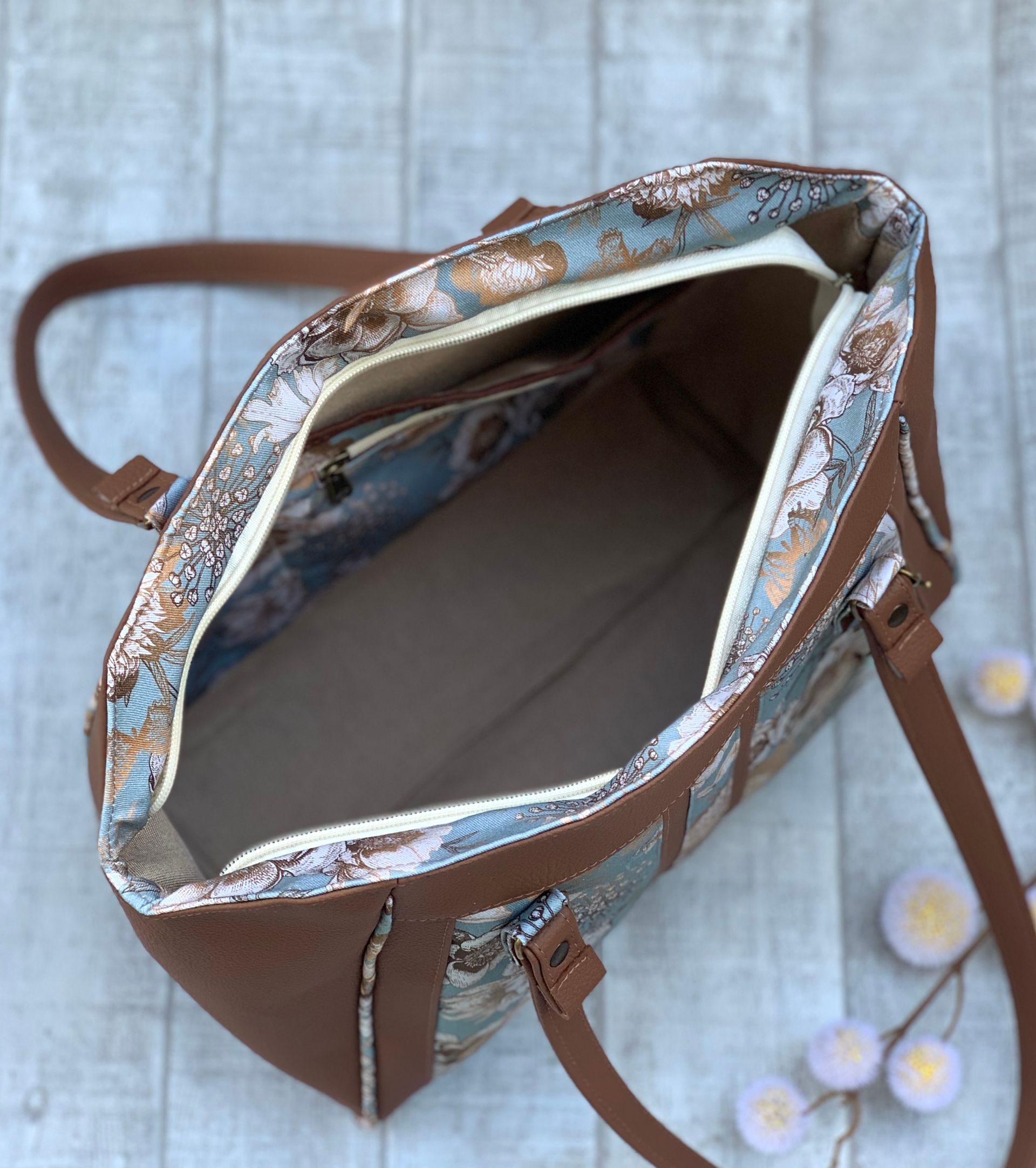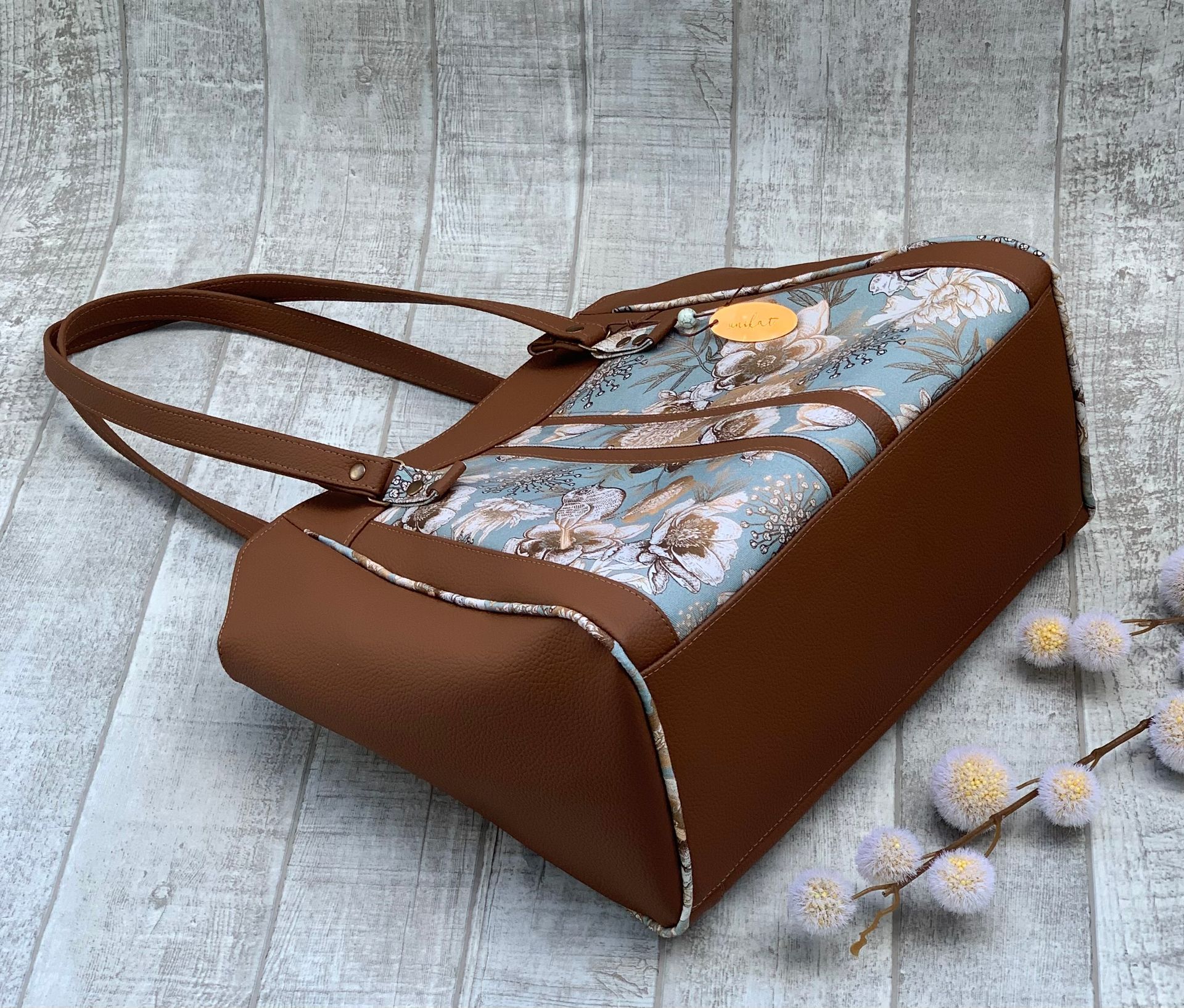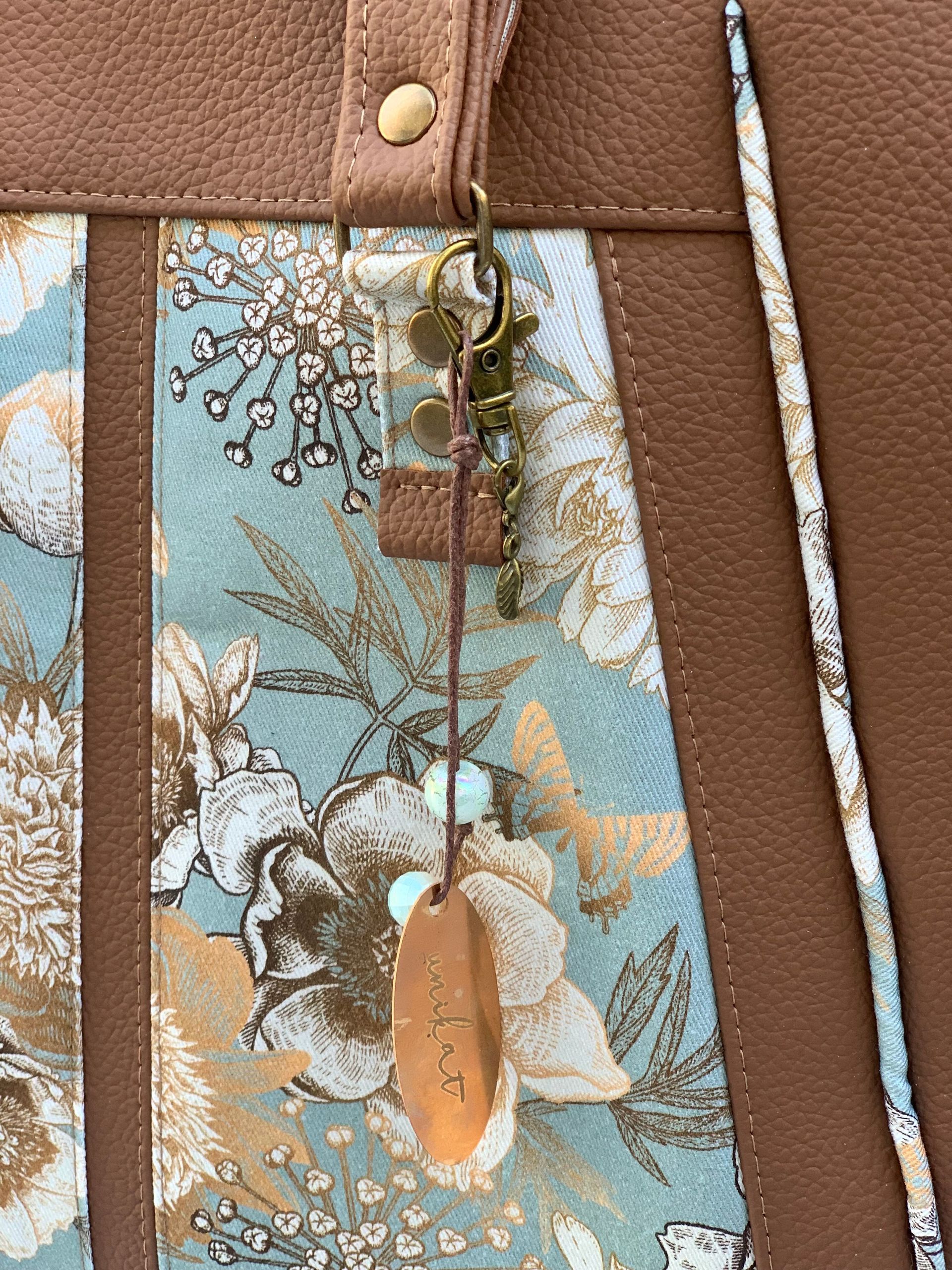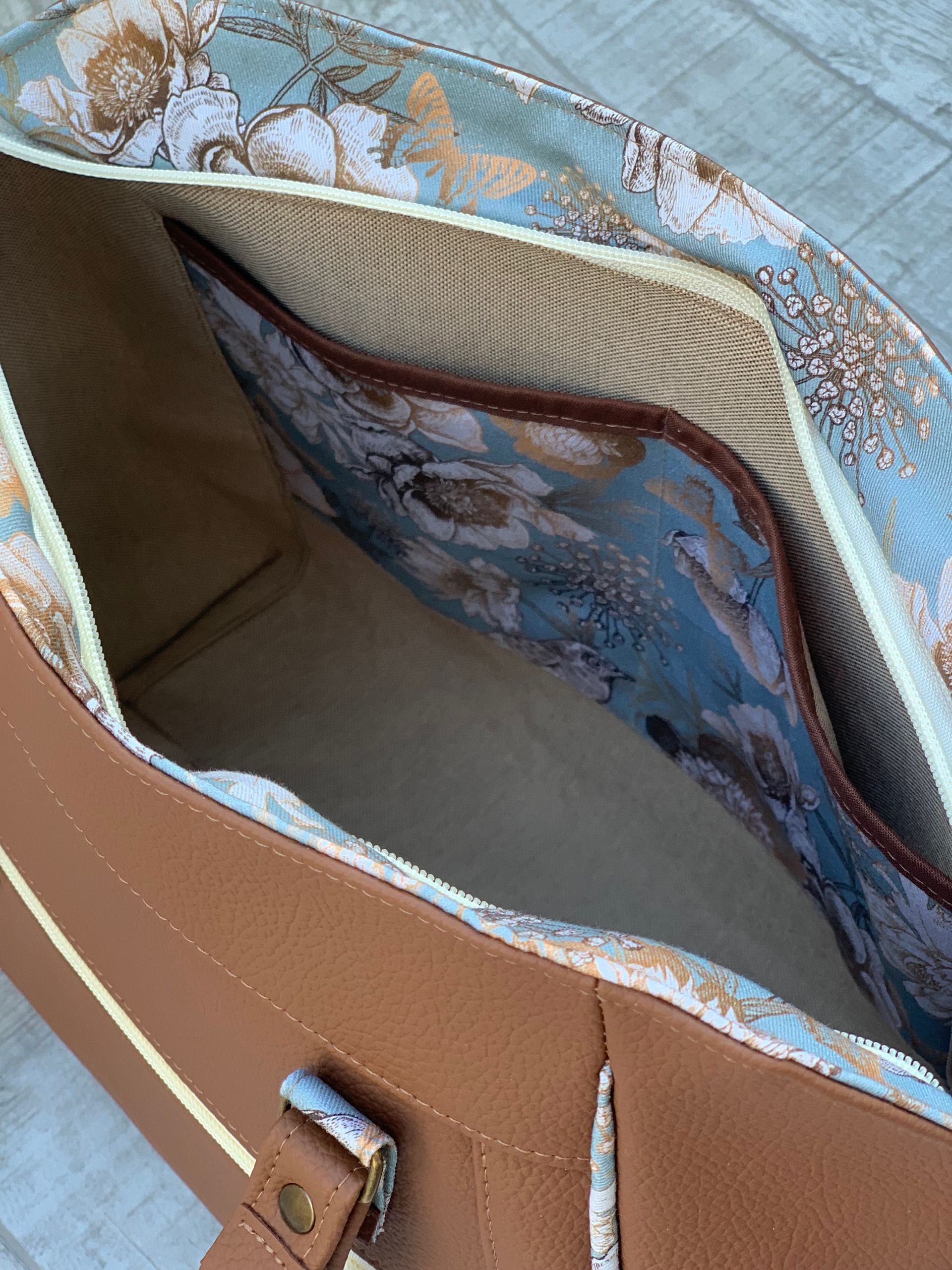 - Material: robustes Lederimitat (Braun), feste Baumwolle/Gabardine (Türkis-Bronze Blüten und Vogel), wasserabweisendes Leinenimitat (innen; unifarben Cappuccino), verschiedene Baumwollstoffe (innen)