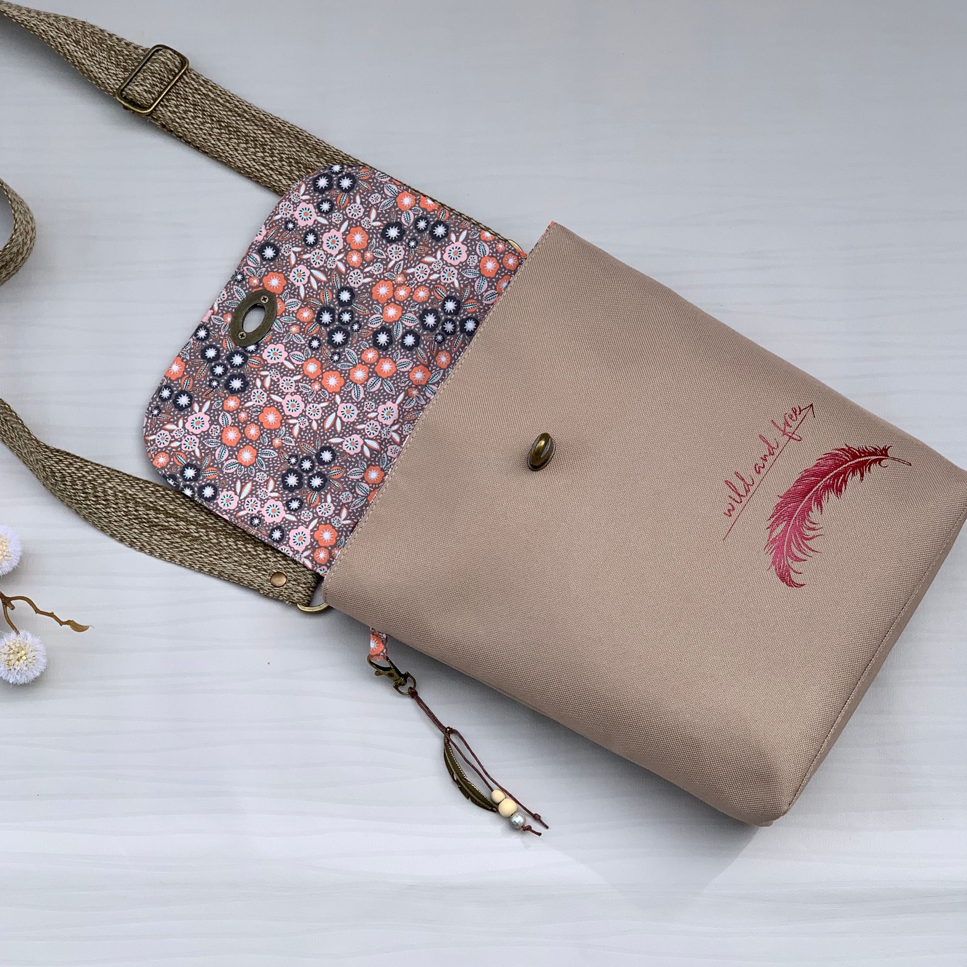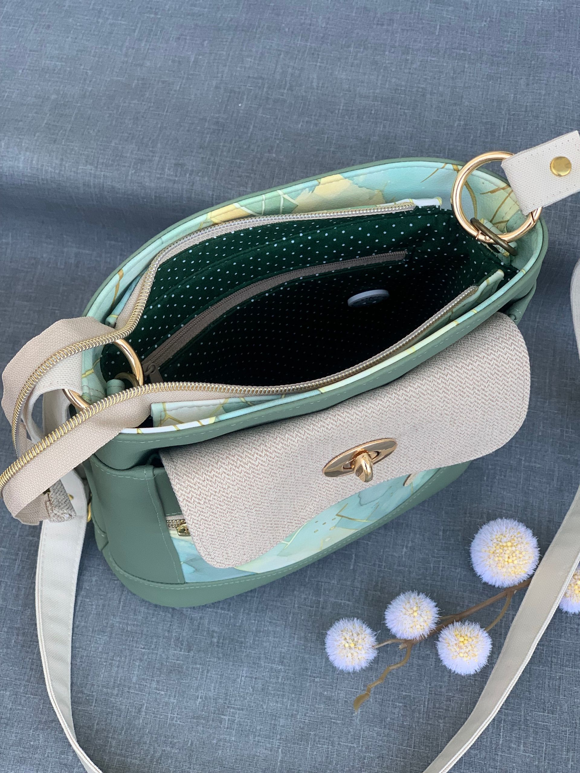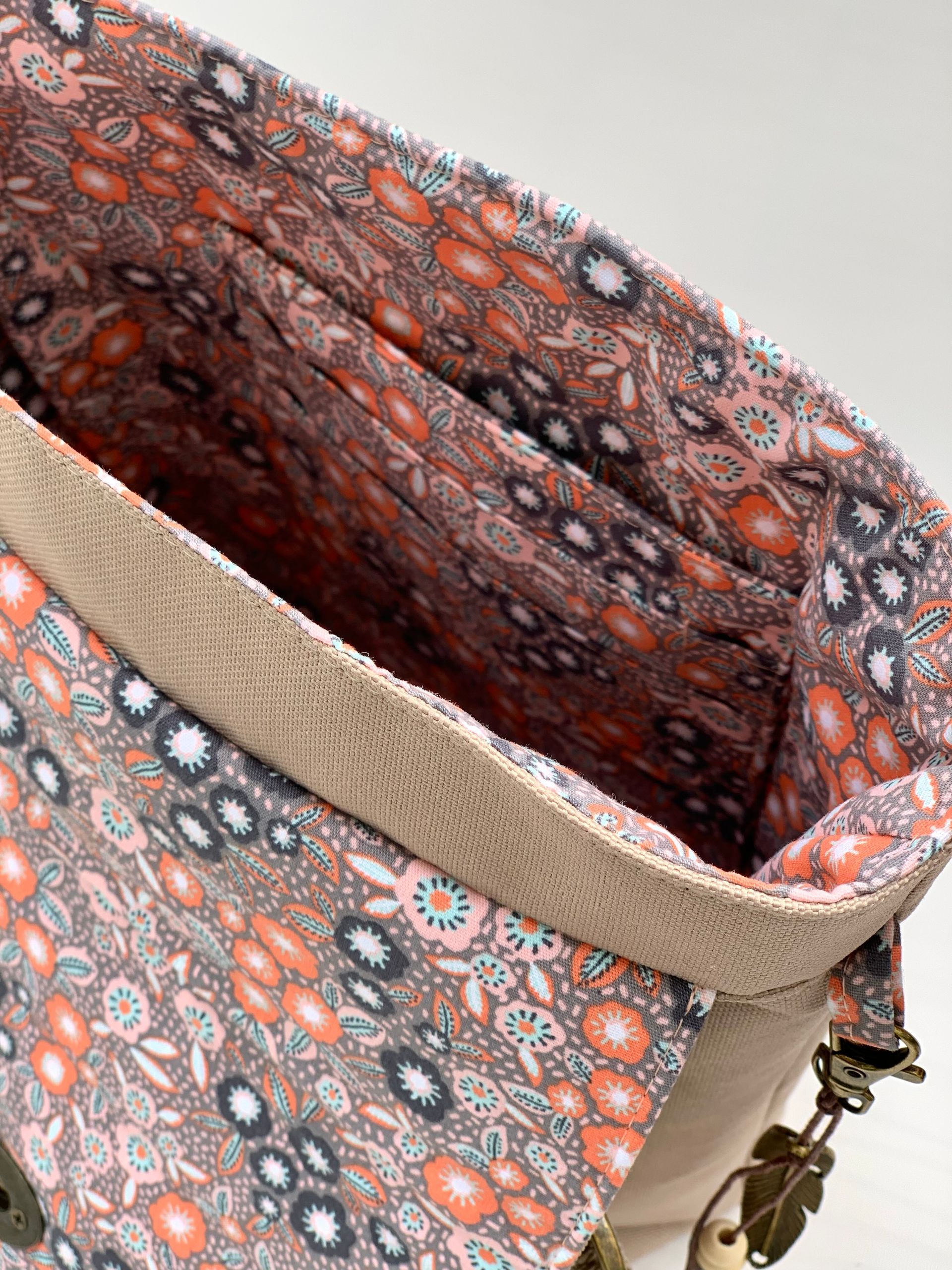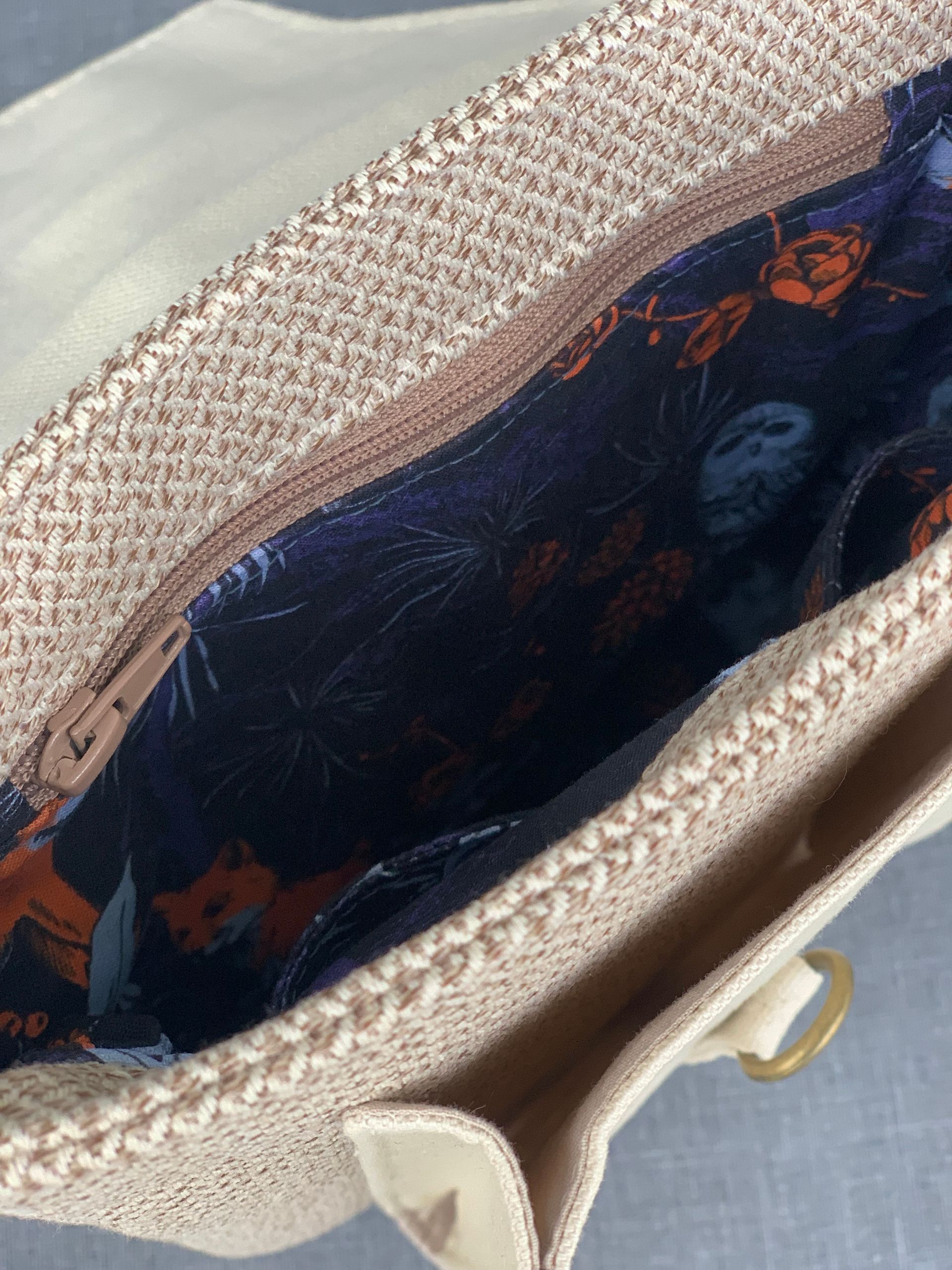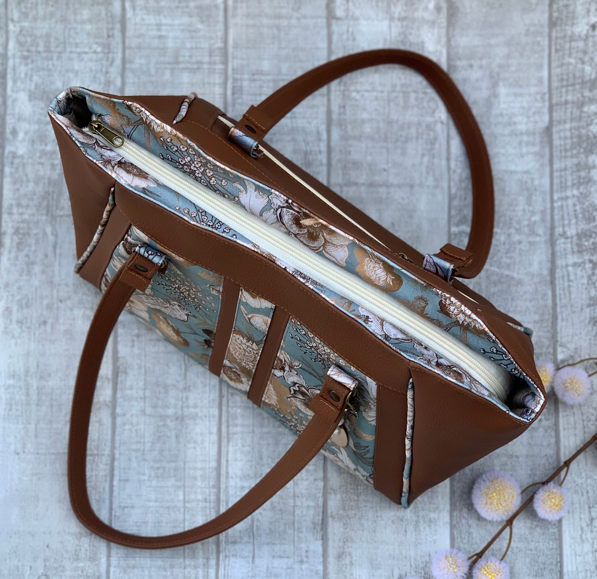 - Material: robustes Lederimitat (Braun), feste Baumwolle/Gabardine (Türkis-Bronze Blüten und Vogel), wasserabweisendes Leinenimitat (innen; unifarben Cappuccino), verschiedene Baumwollstoffe (innen)