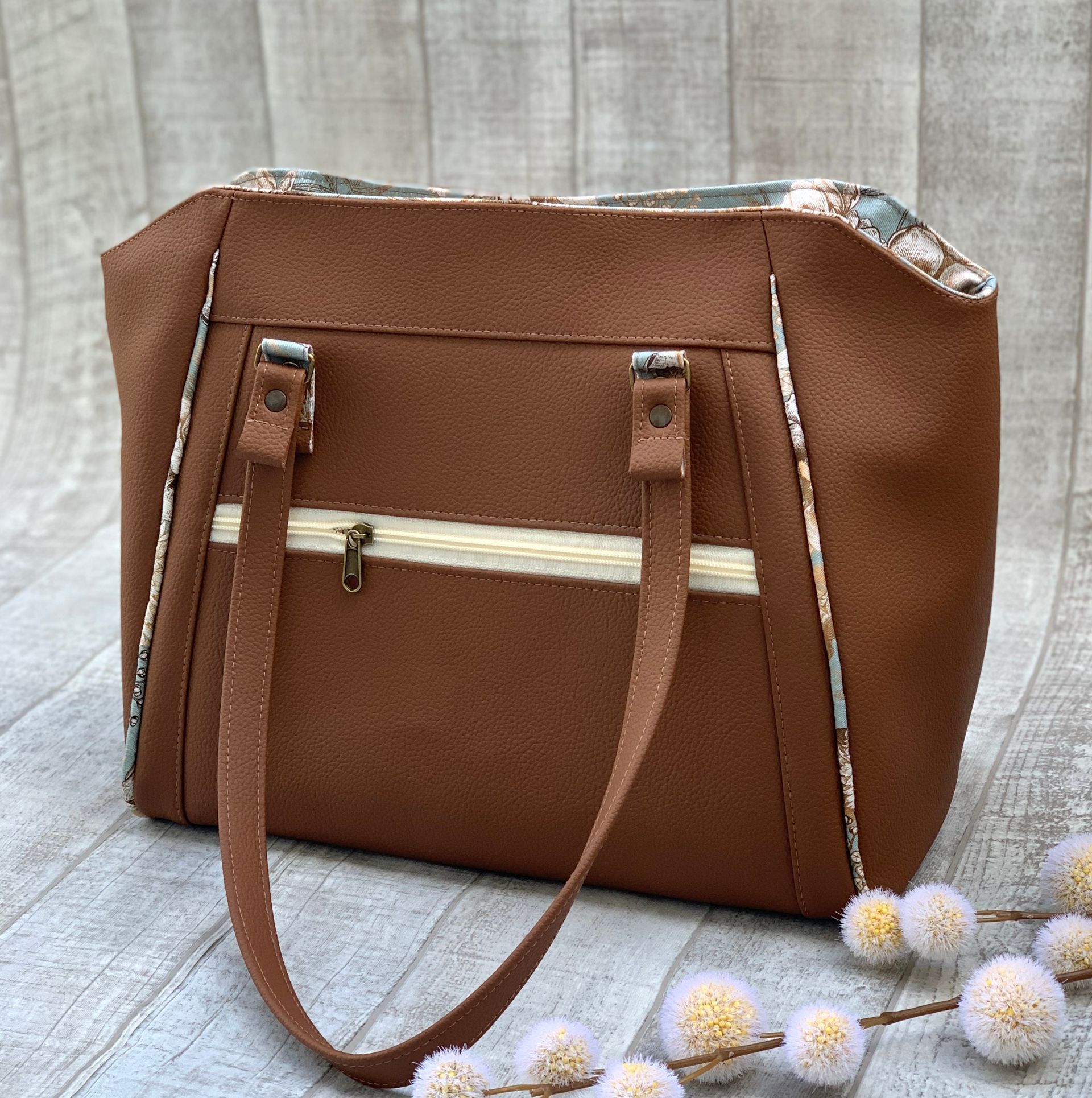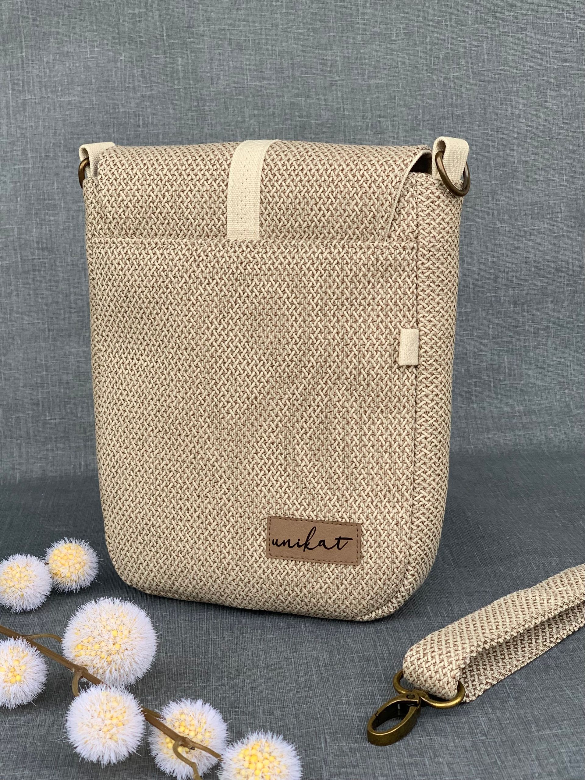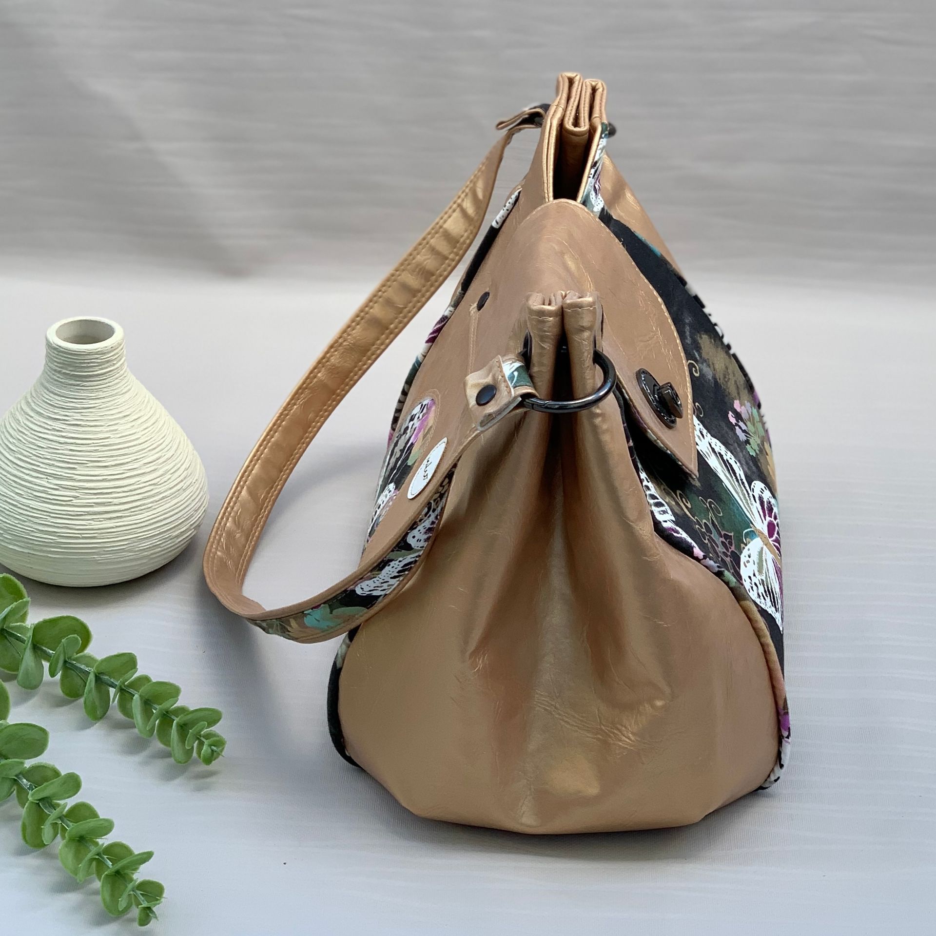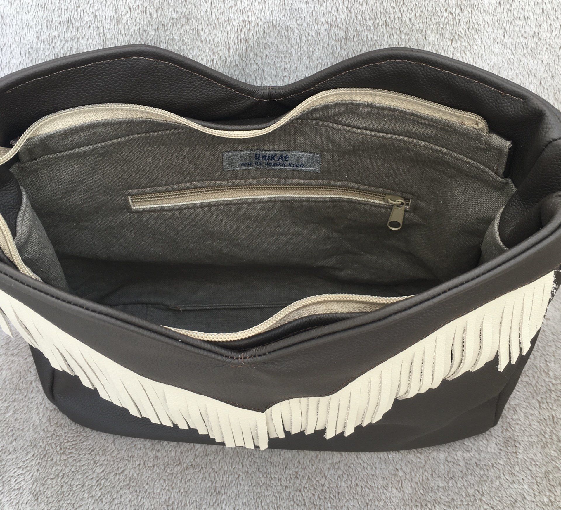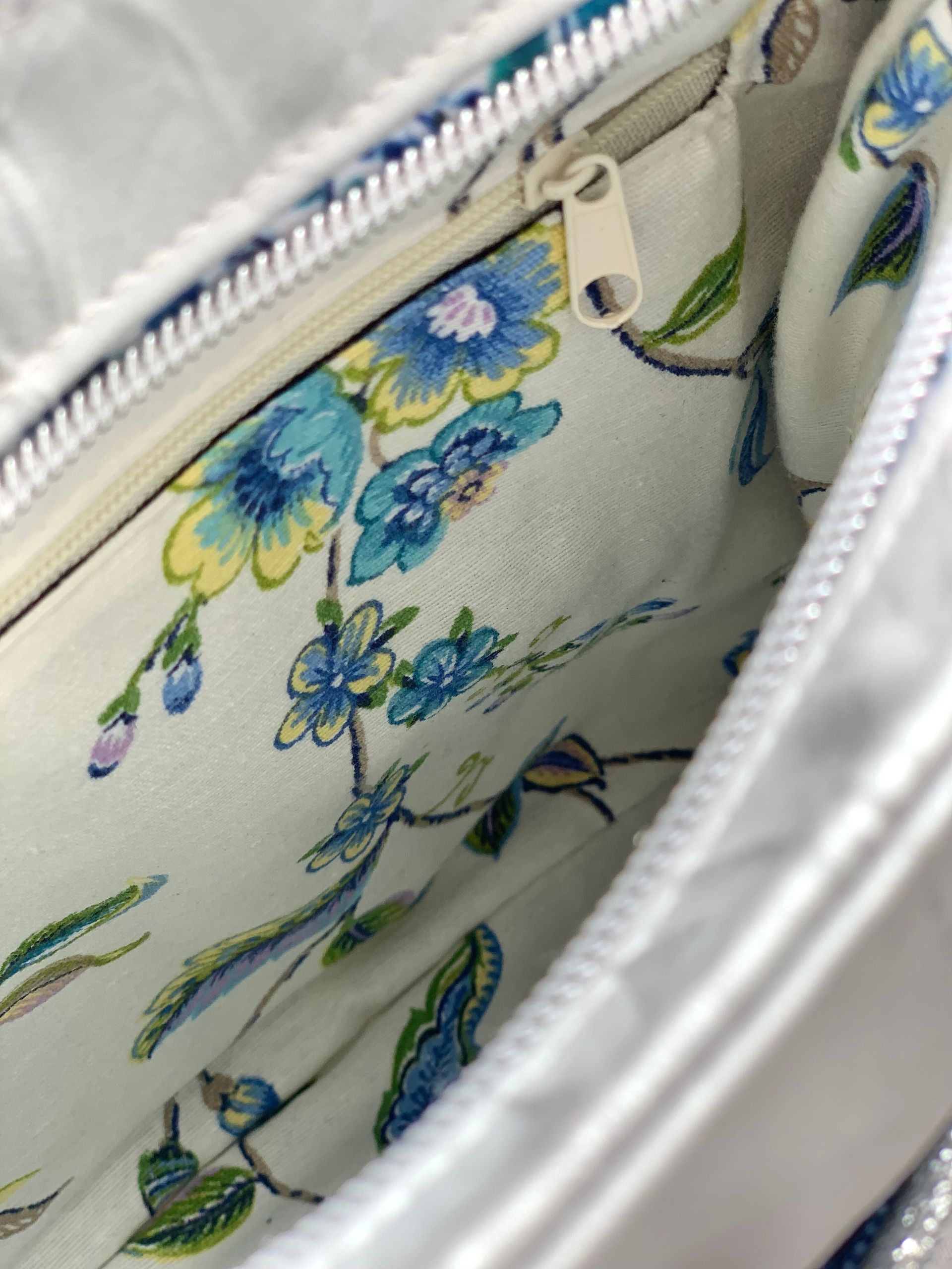 - Material: robustes Lederimitat (Braun), feste Baumwolle/Gabardine (Türkis-Bronze Blüten und Vogel), wasserabweisendes Leinenimitat (innen; unifarben Cappuccino), verschiedene Baumwollstoffe (innen)