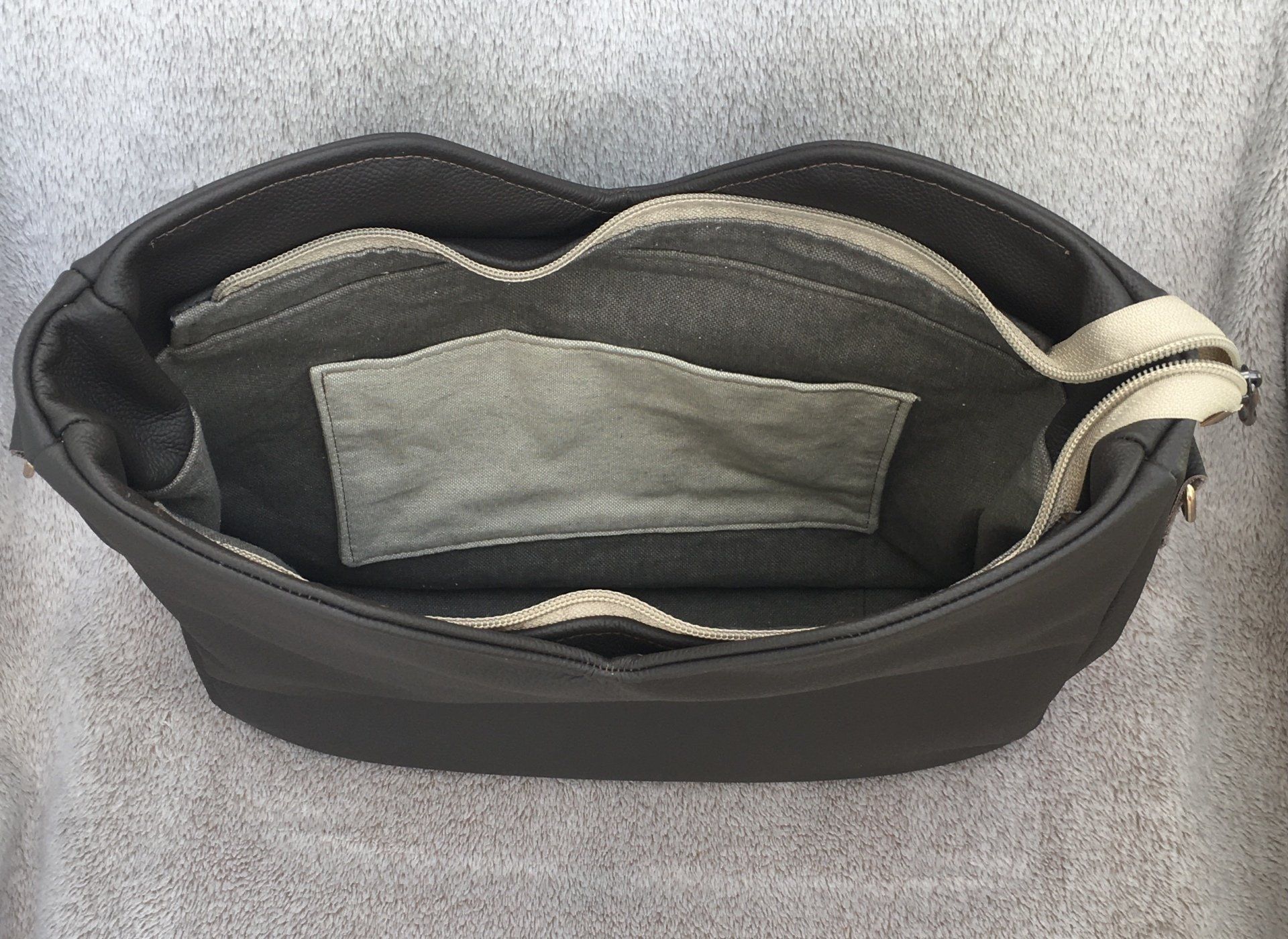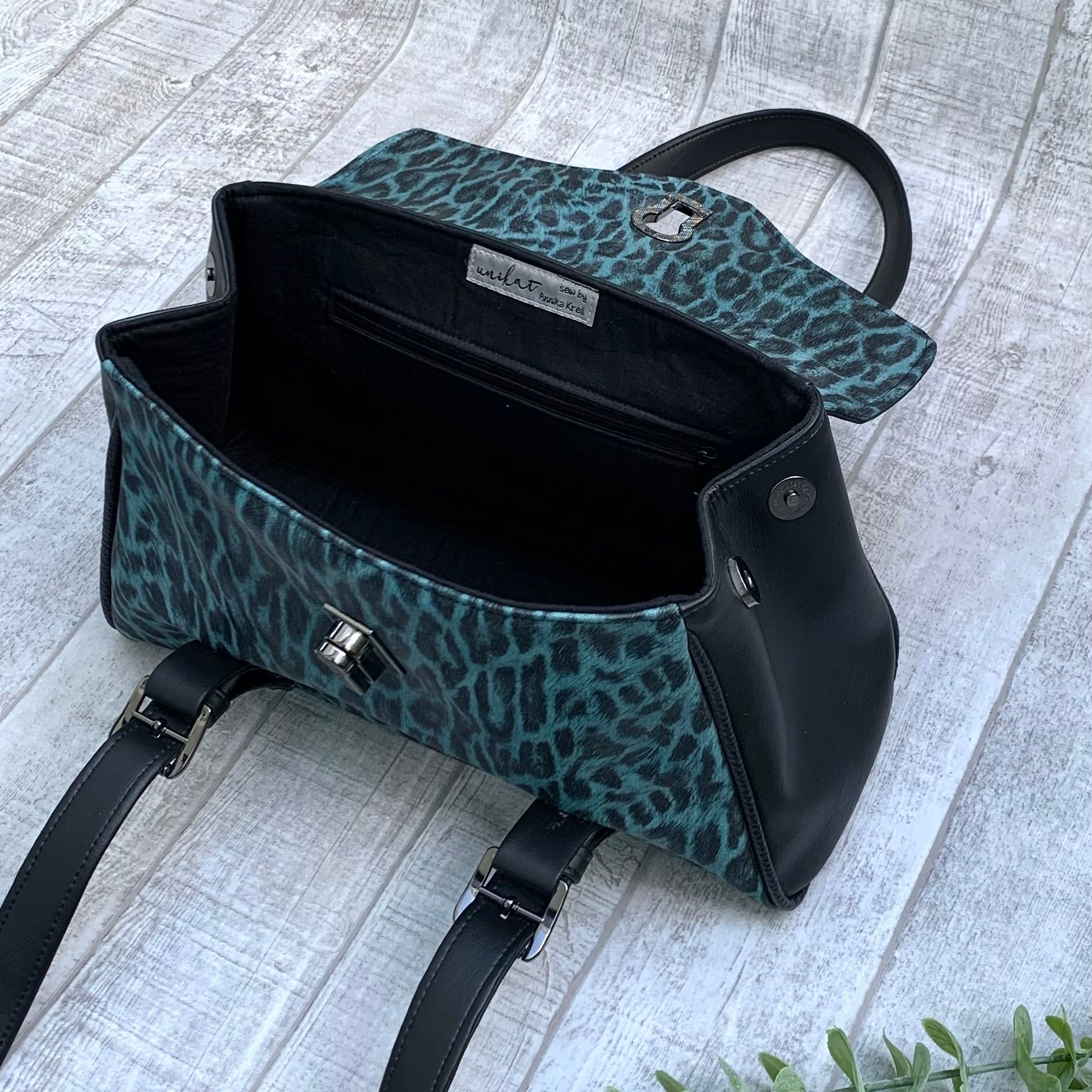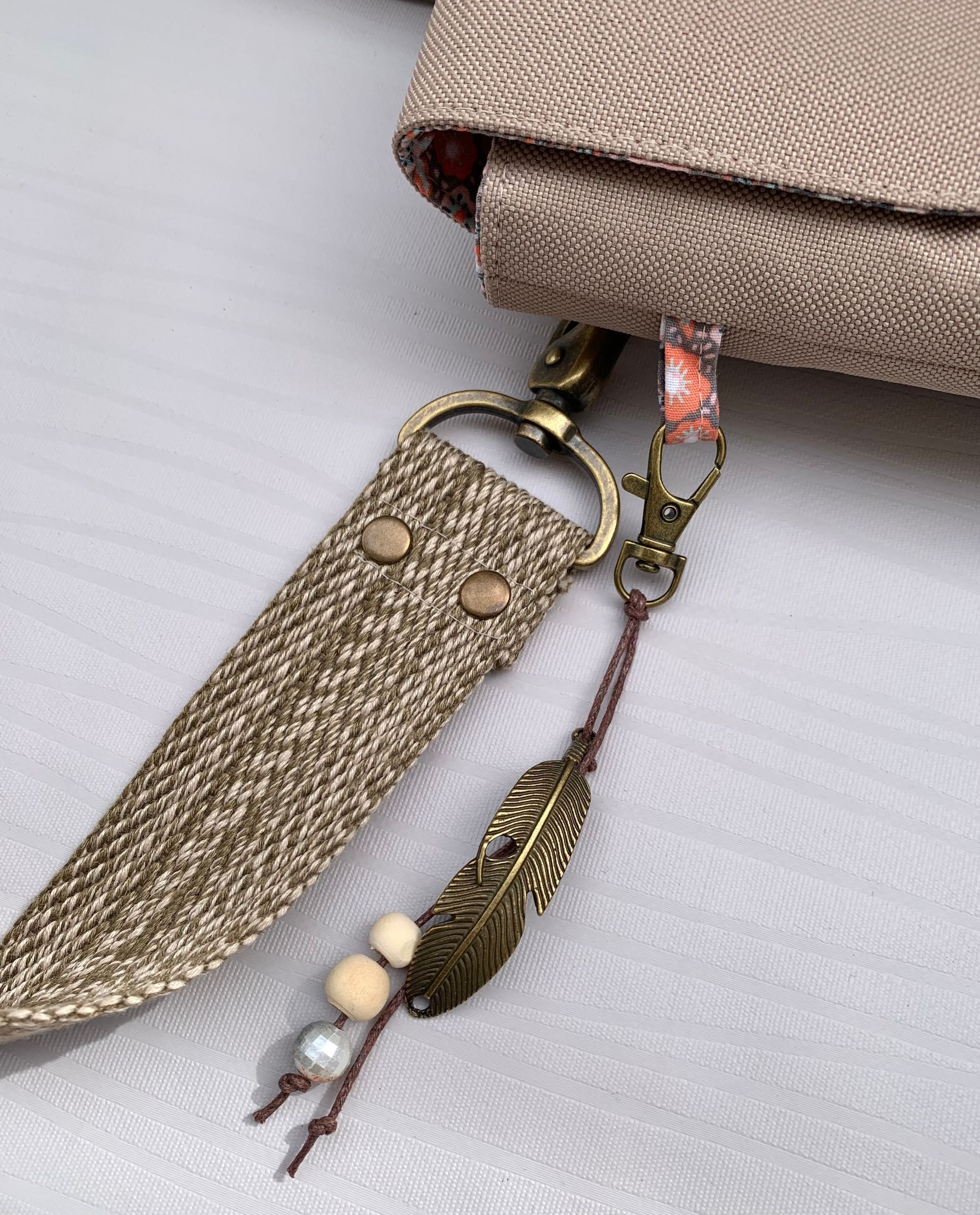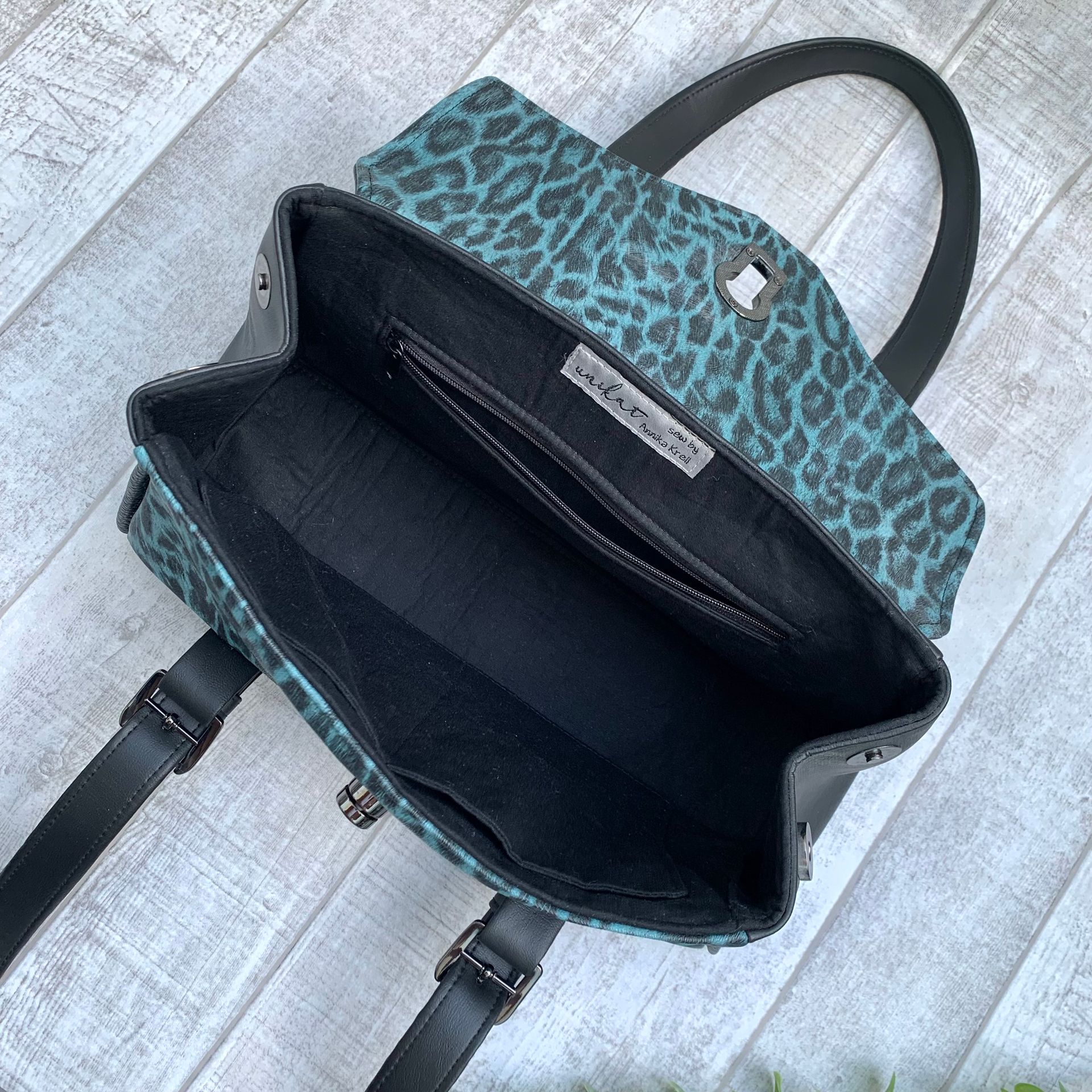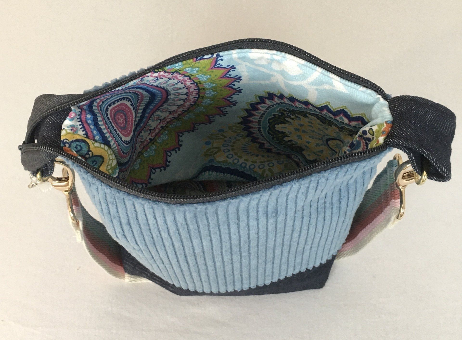 - Material: robustes Lederimitat (Braun), feste Baumwolle/Gabardine (Türkis-Bronze Blüten und Vogel), wasserabweisendes Leinenimitat (innen; unifarben Cappuccino), verschiedene Baumwollstoffe (innen)