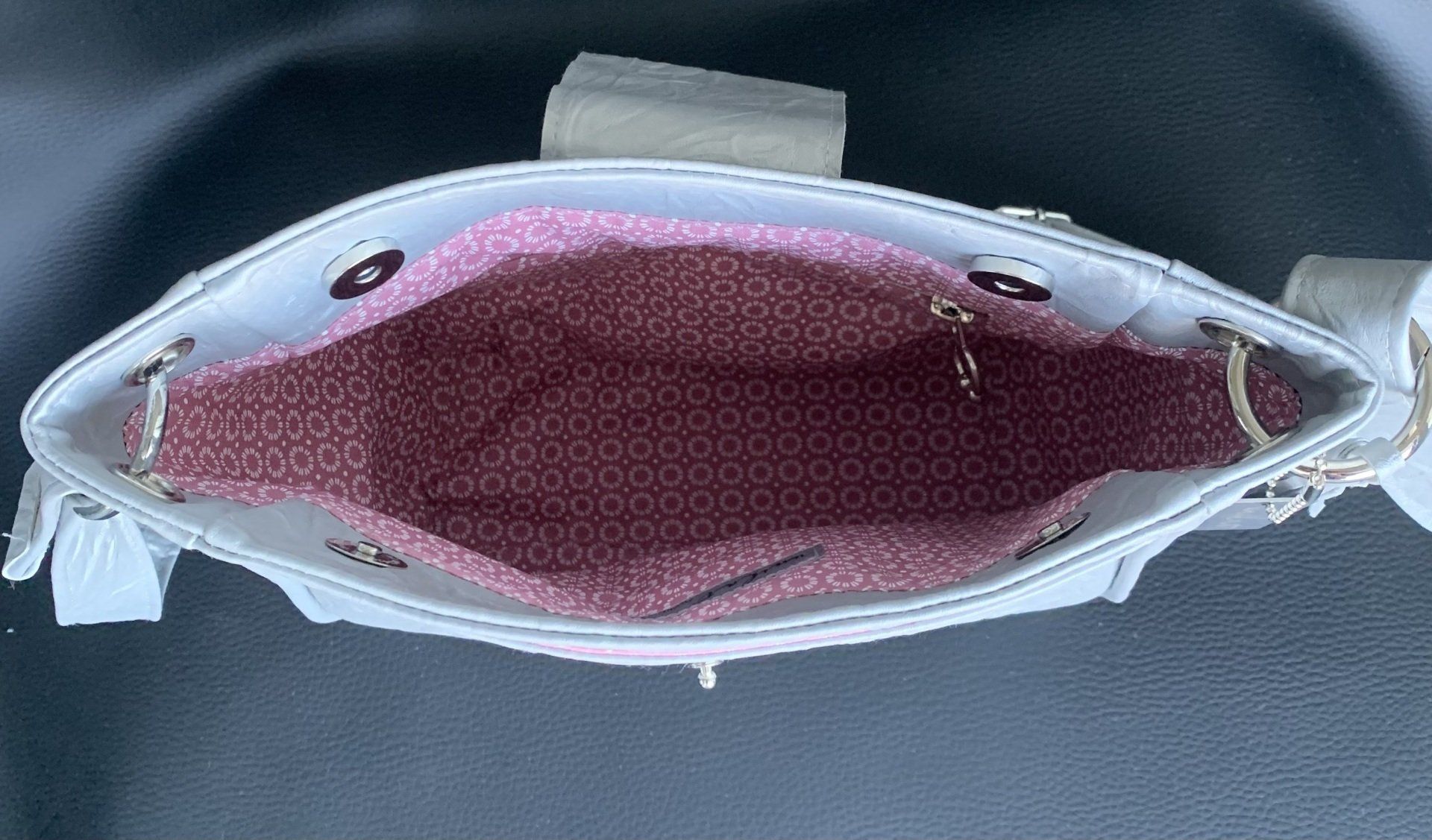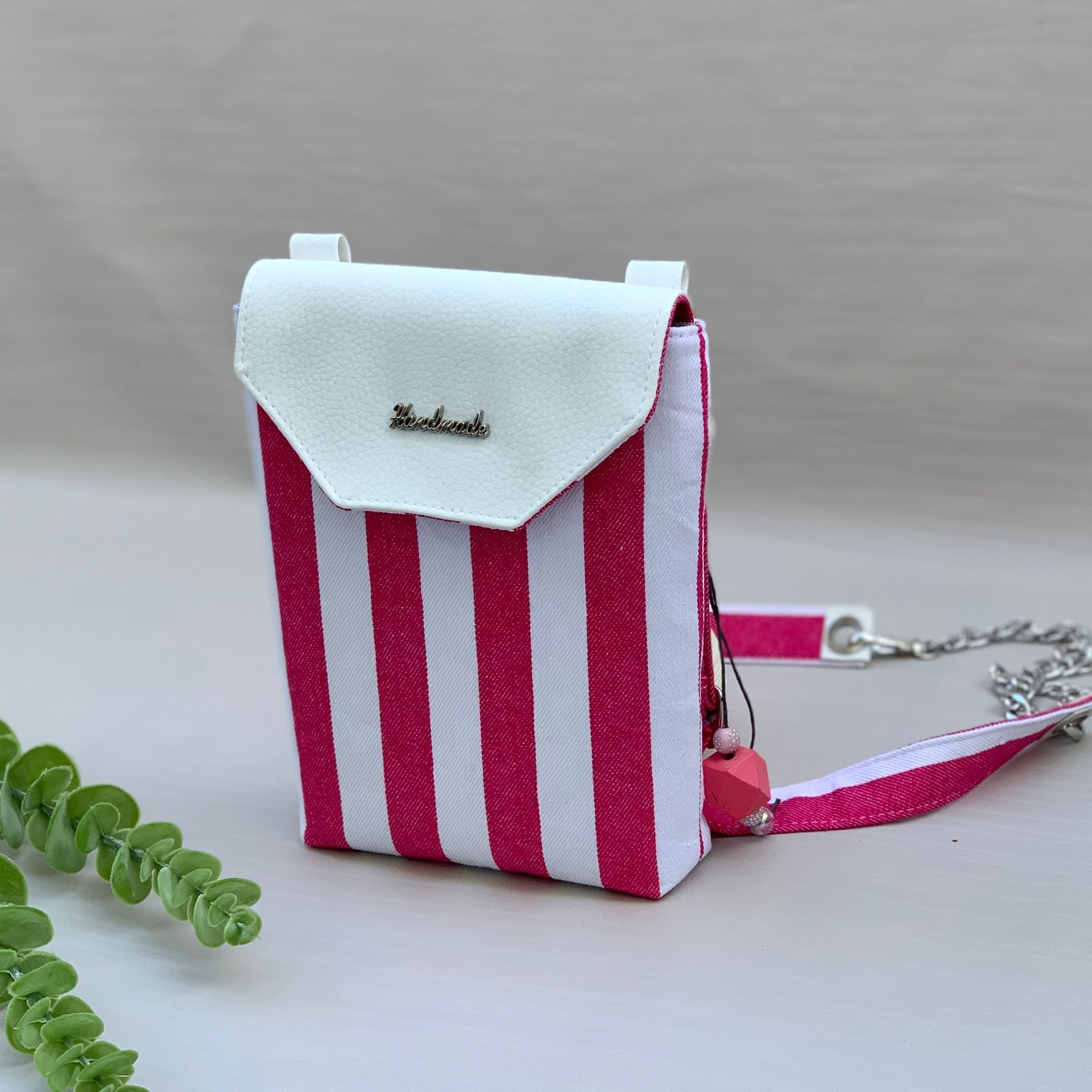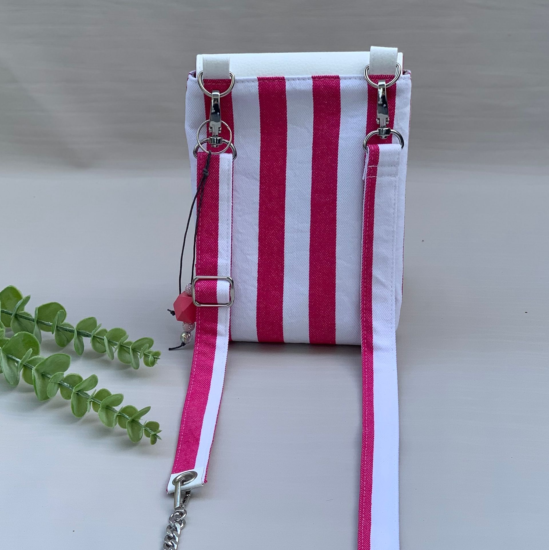 - Material: Jeansstoff (Weiß-Pink gestreift), Lederimitat (Weiß), beschichteter Canvas (Hellgrau)