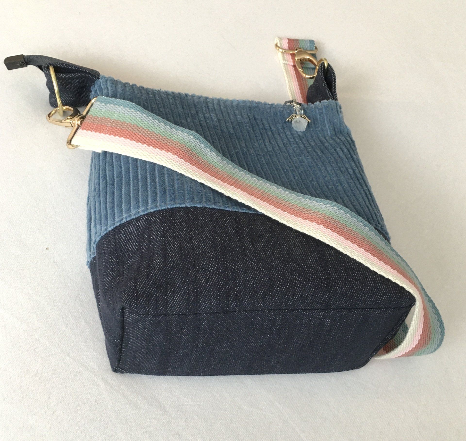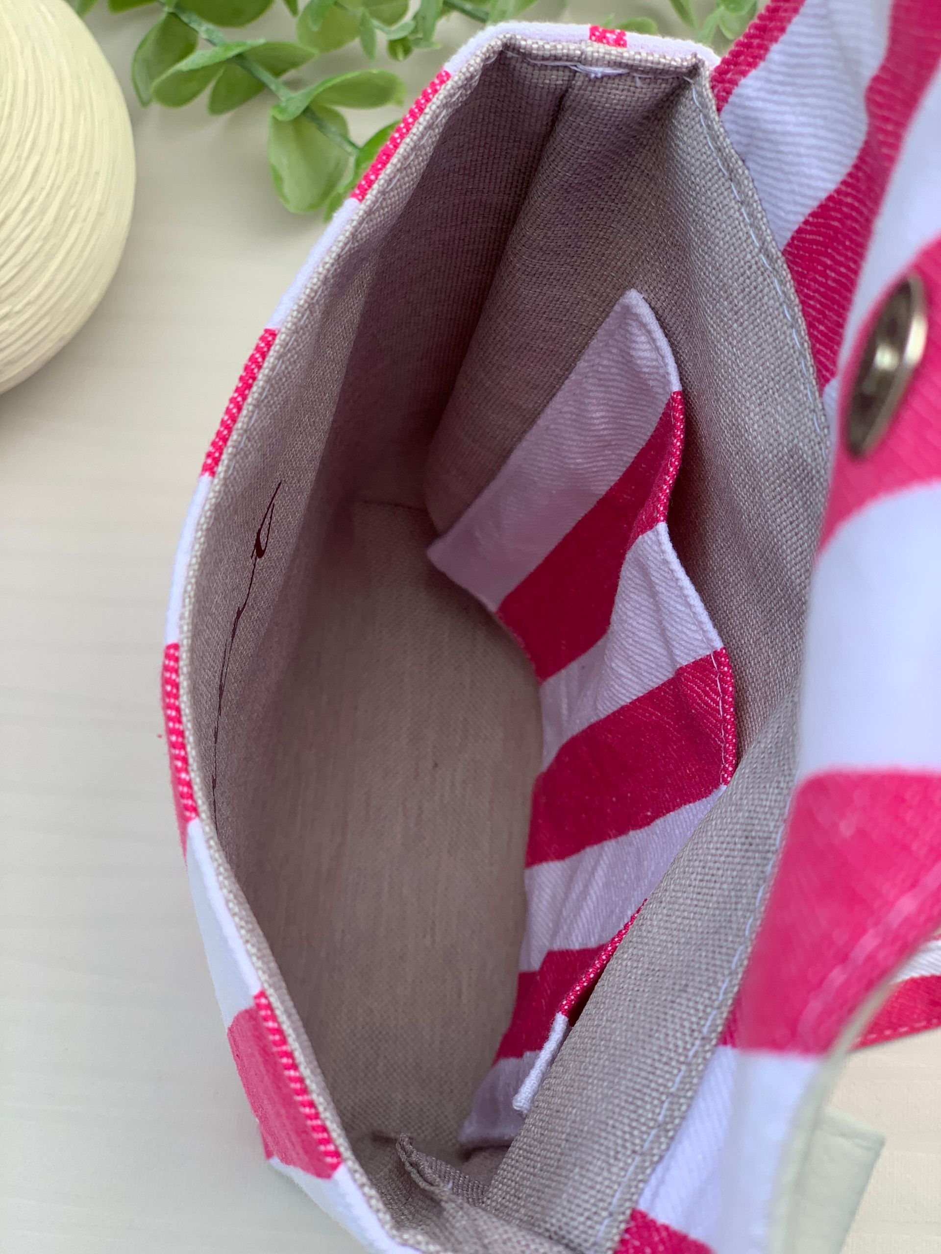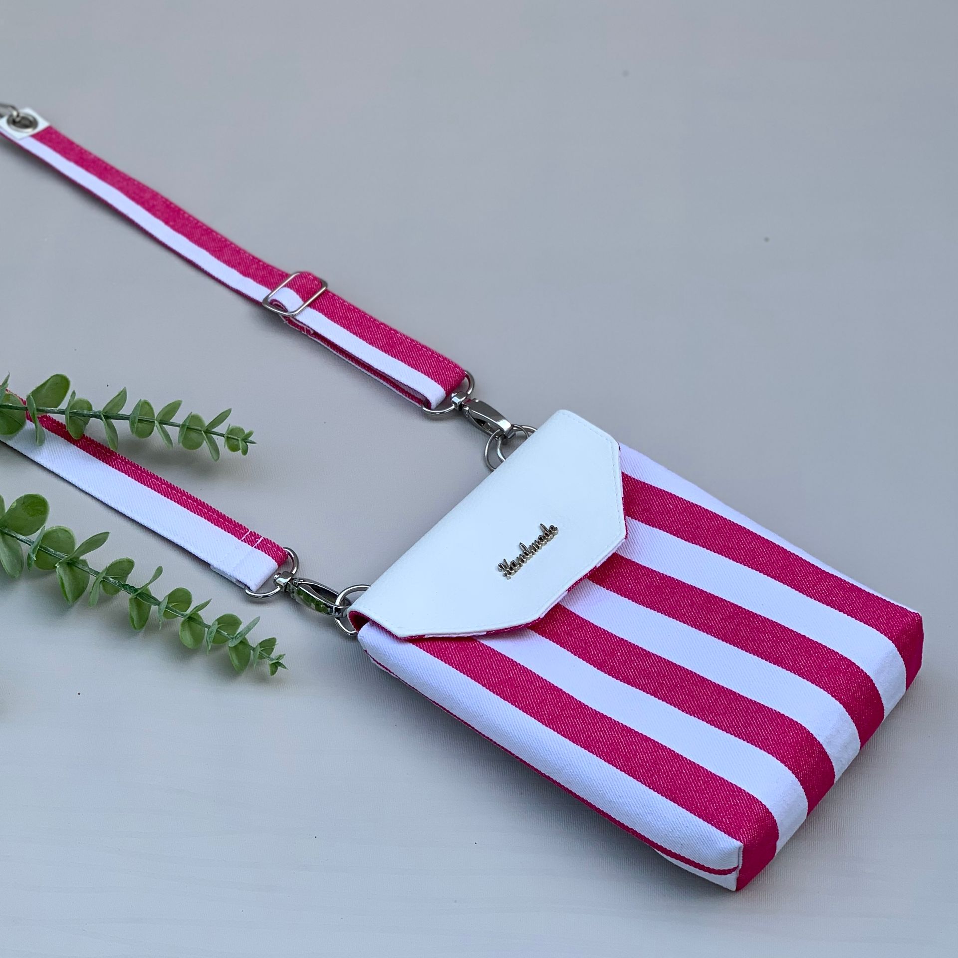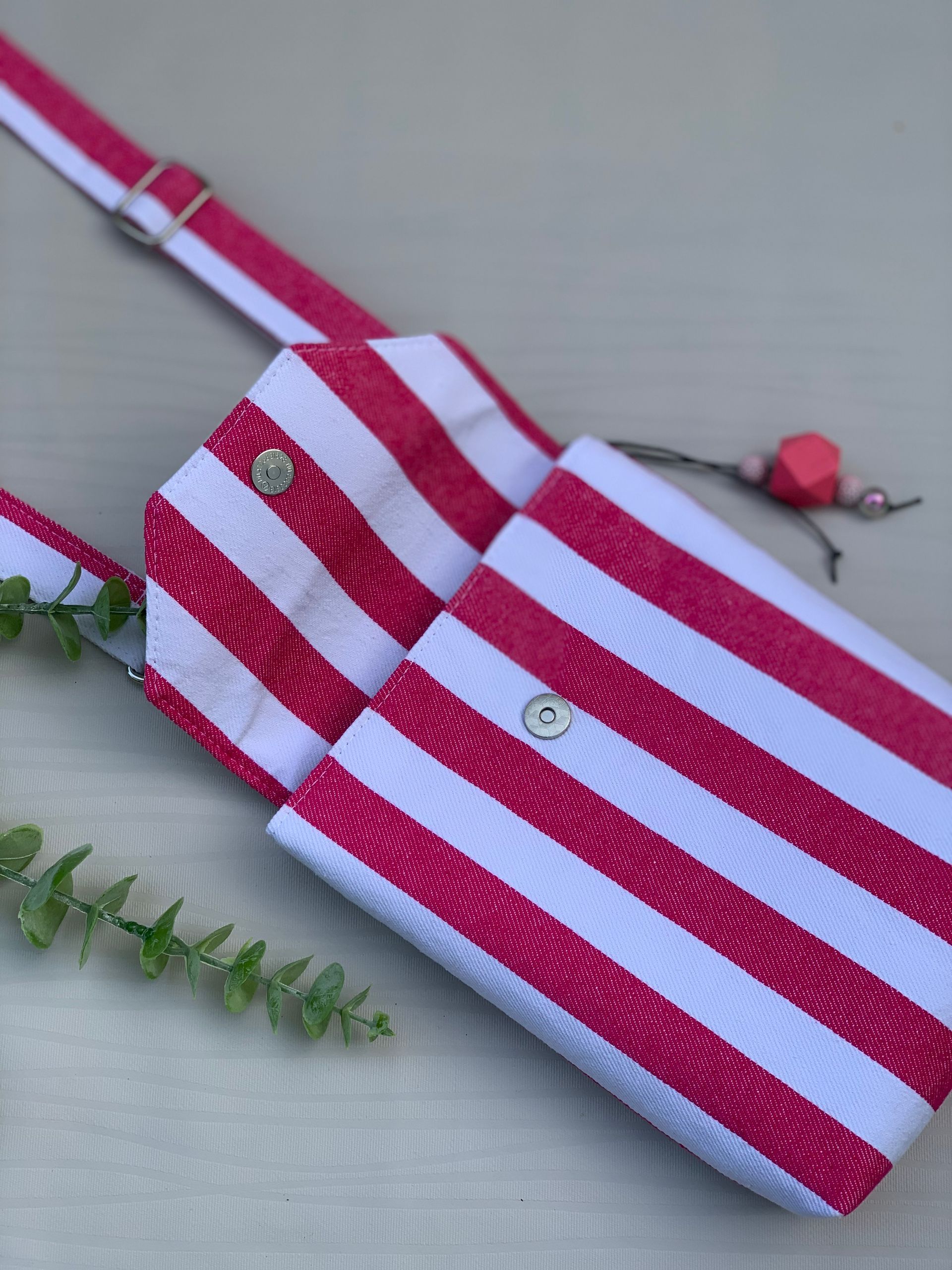 - Material: Jeansstoff (Weiß-Pink gestreift), Lederimitat (Weiß), beschichteter Canvas (Hellgrau)