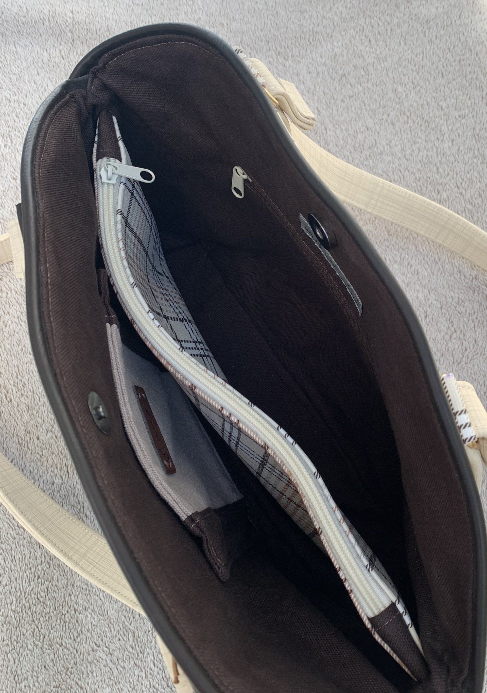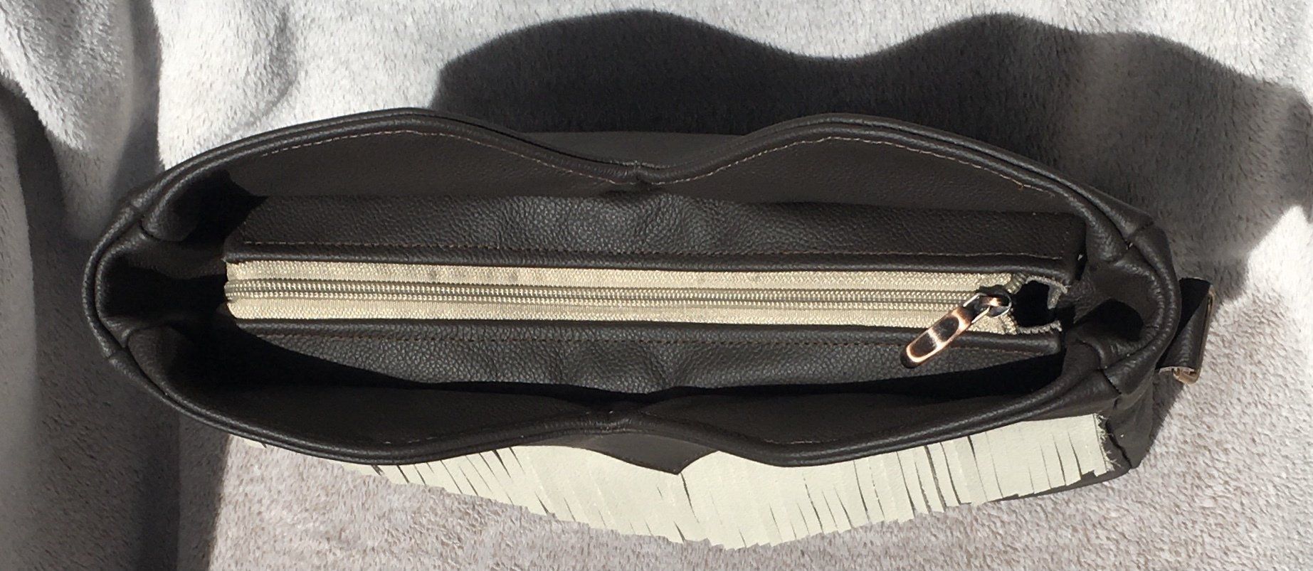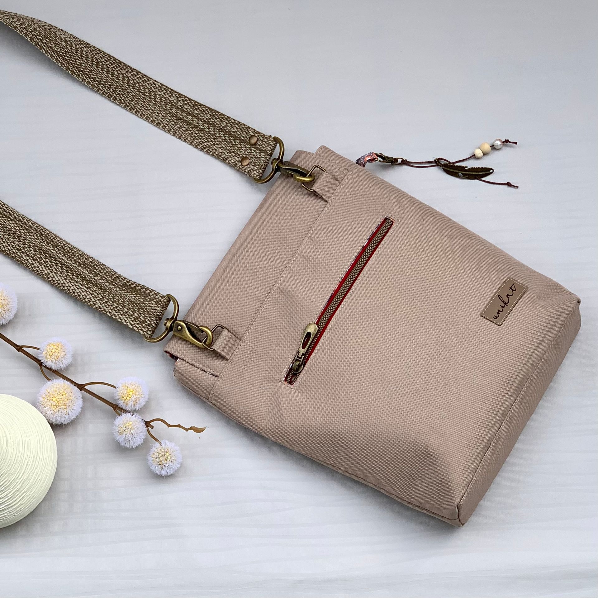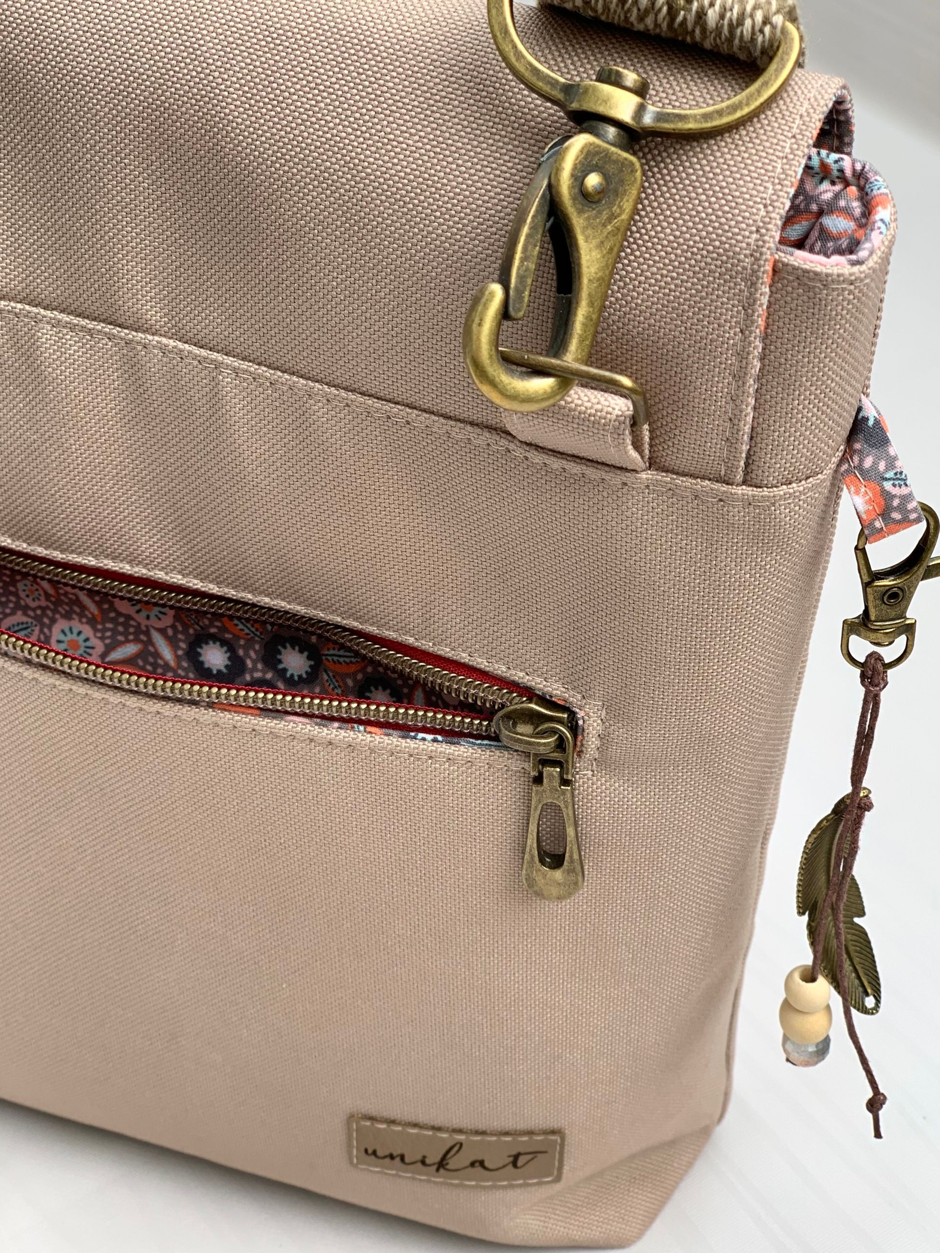 - Taschenverschluss: Reißverschluss (cremefarben mit messingfarbenem Zipper)