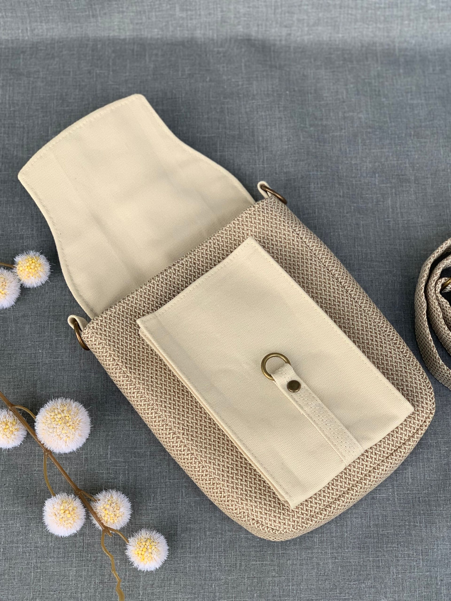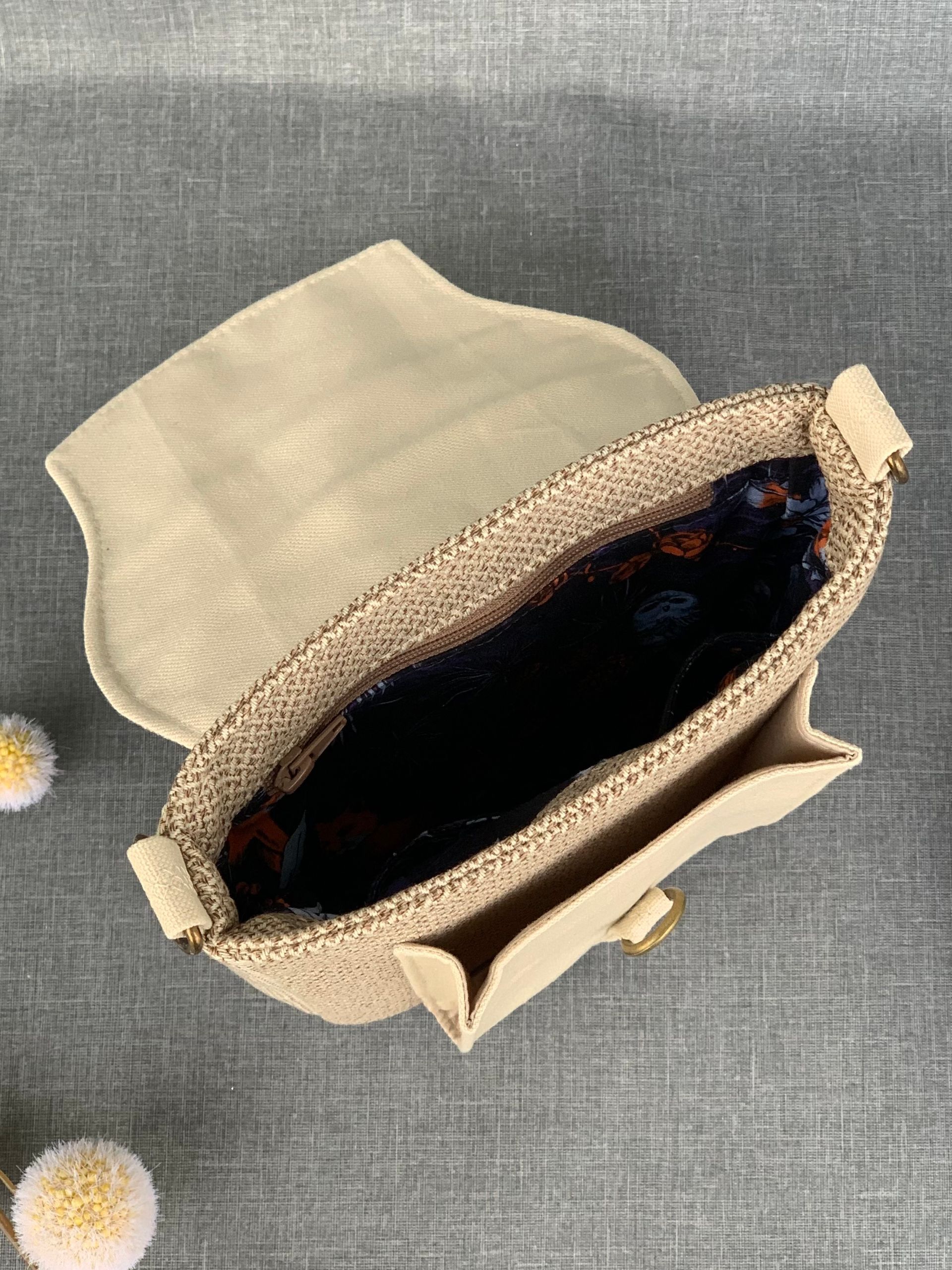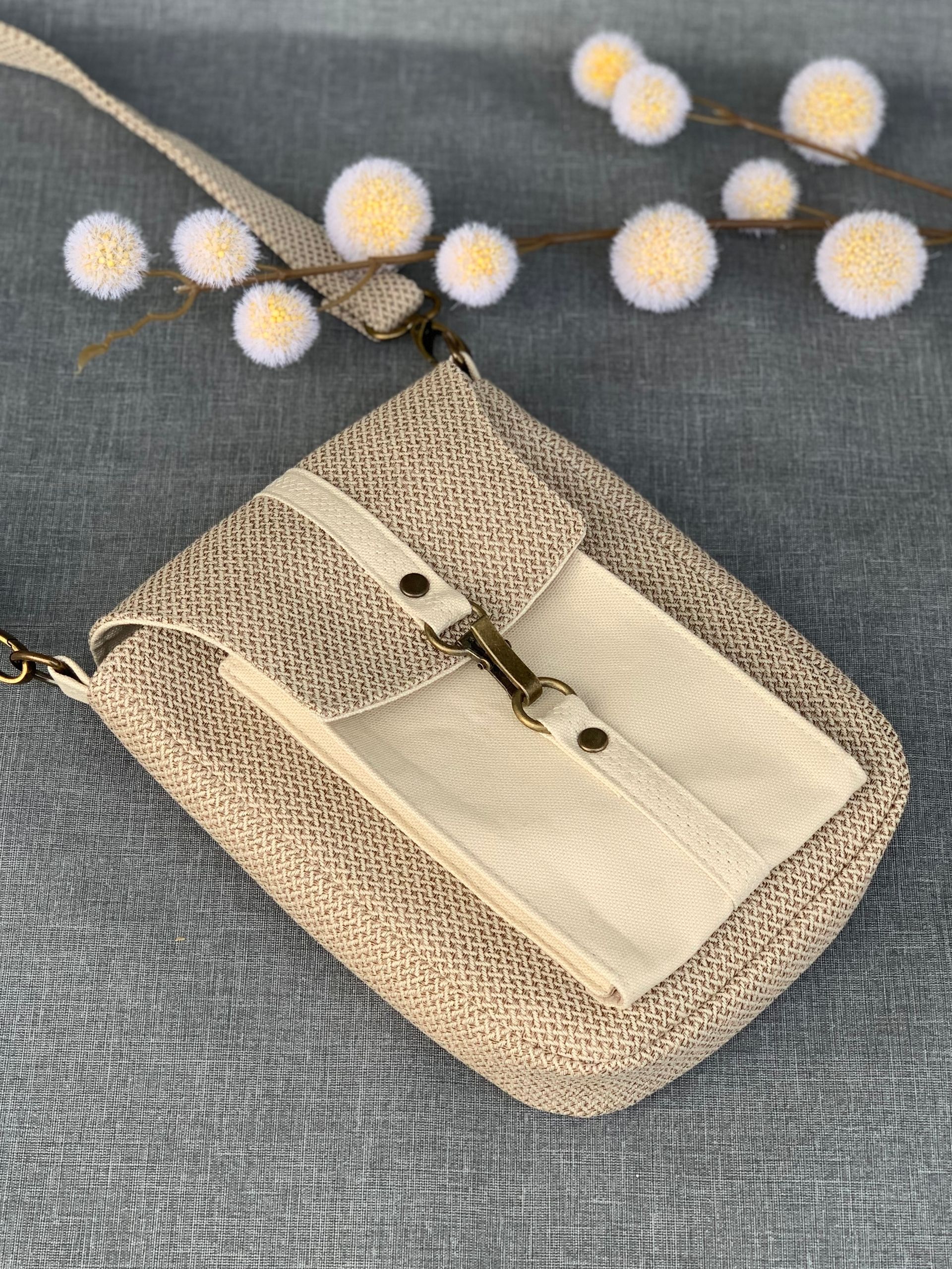 - Taschenverschluss: Reißverschluss (cremefarben mit messingfarbenem Zipper)