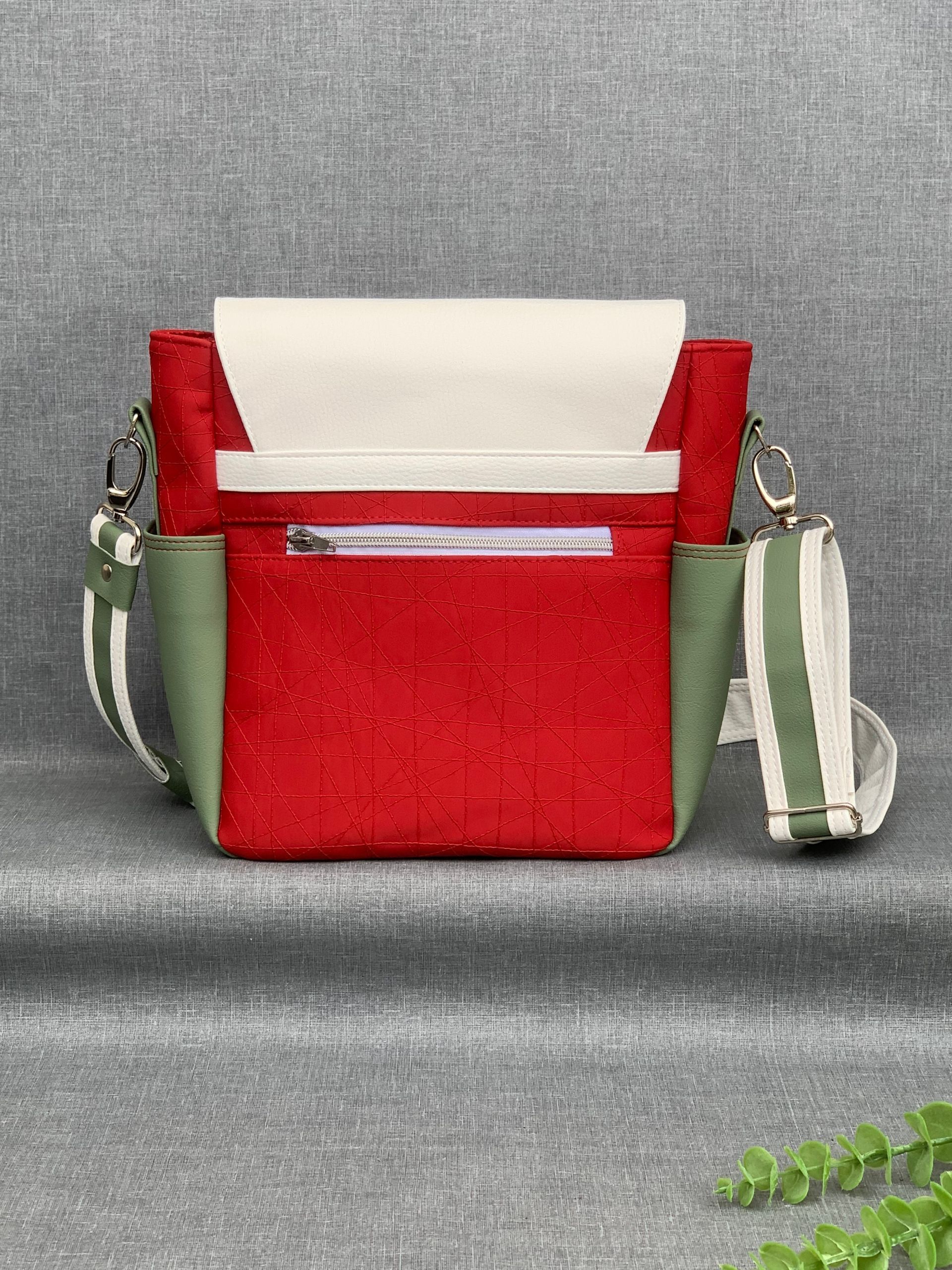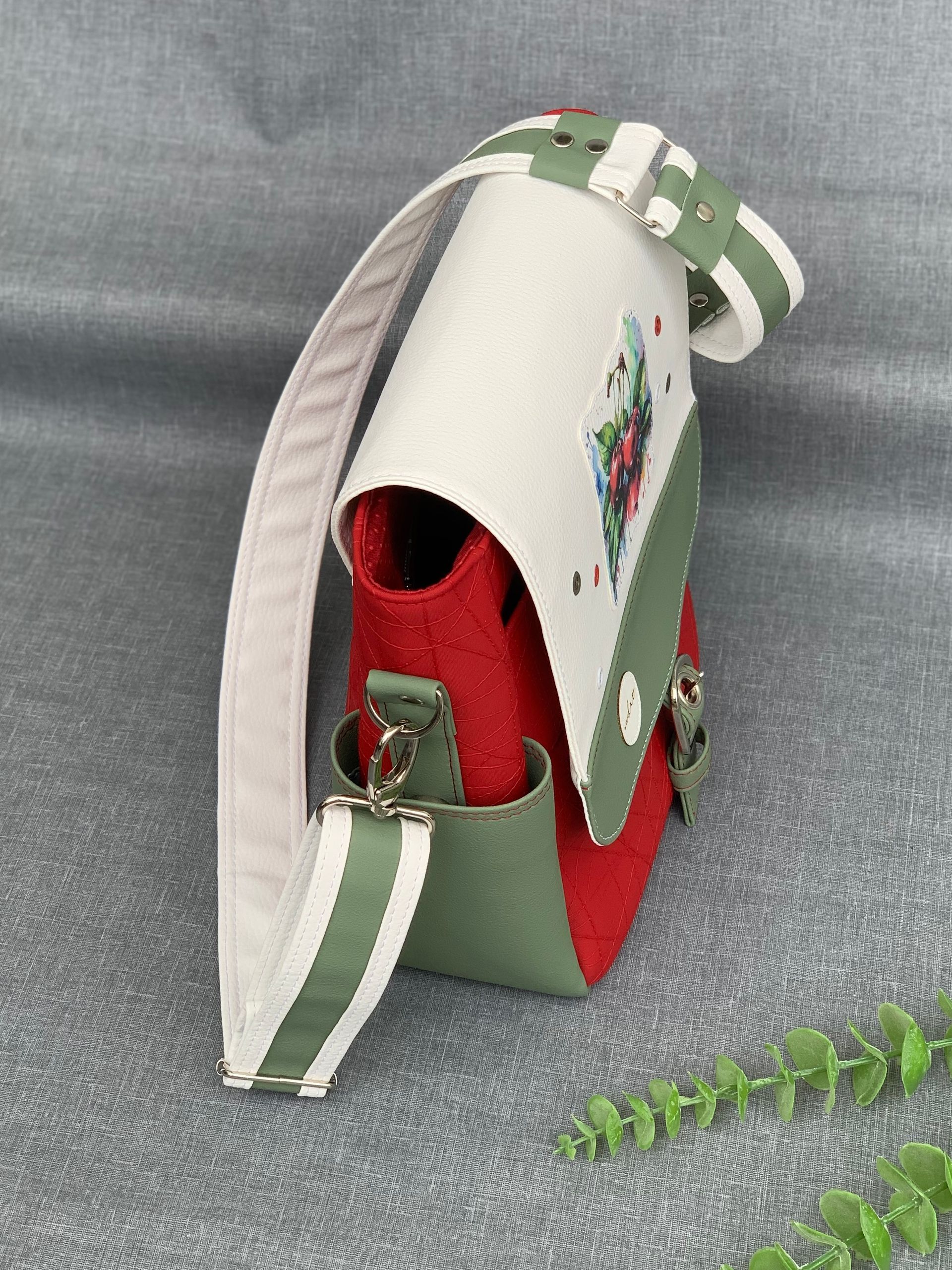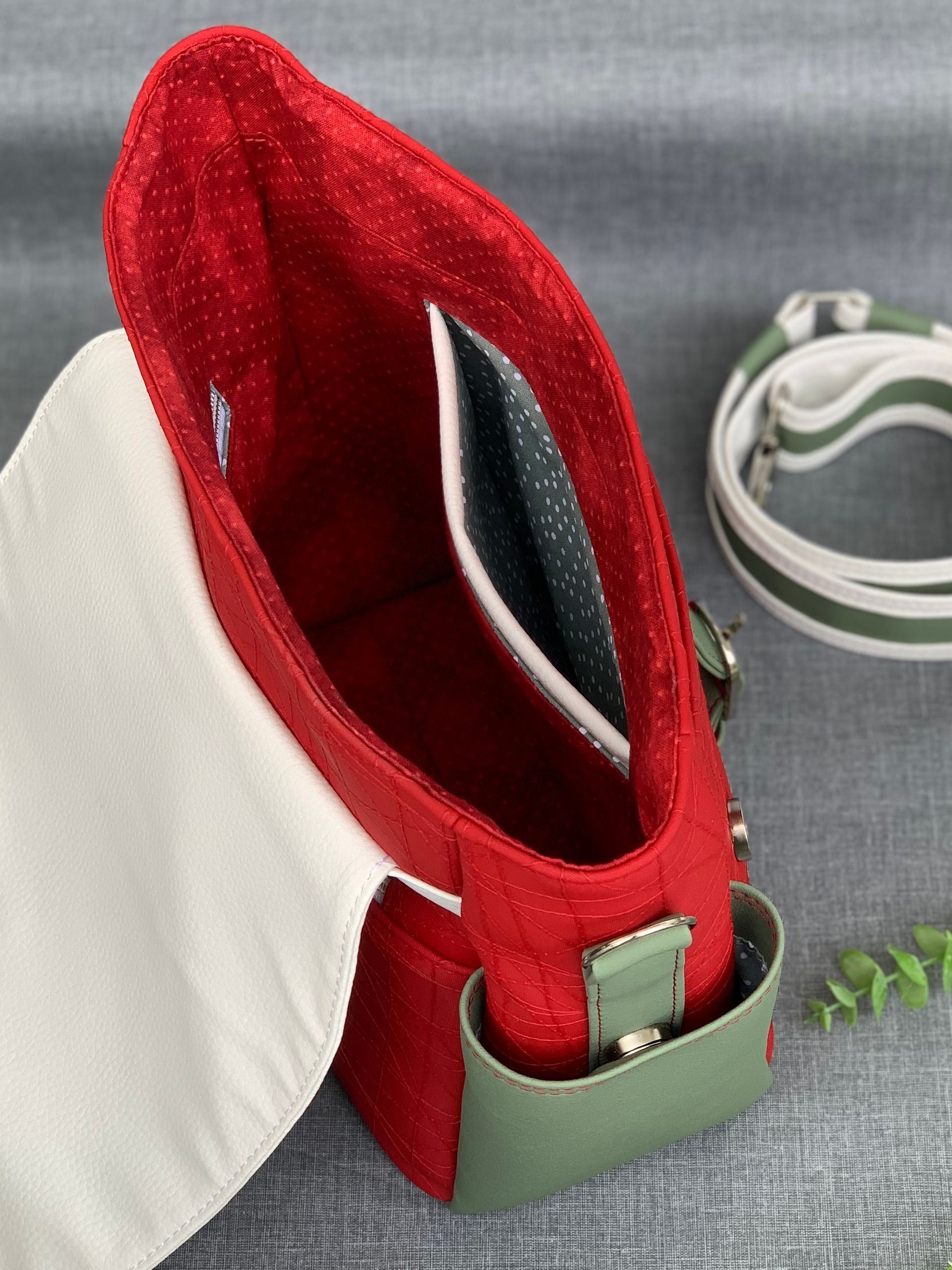 - Material: hochwertiges Lederimitat in Rot, Grün und Weiß; Baumwollstoffe (innen)