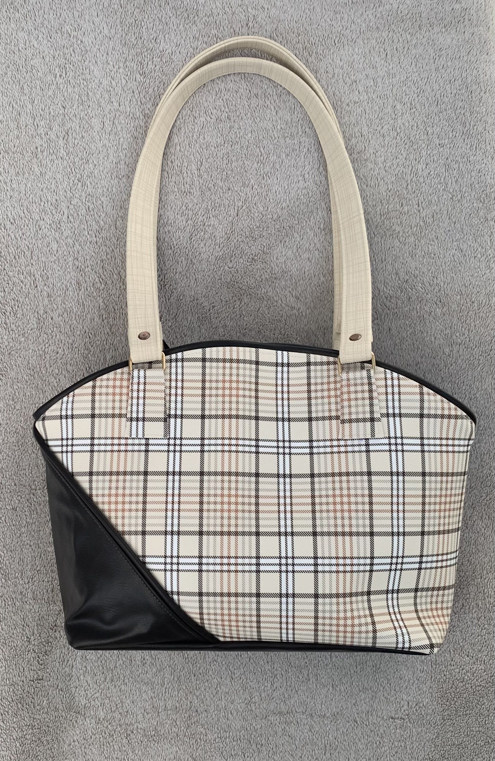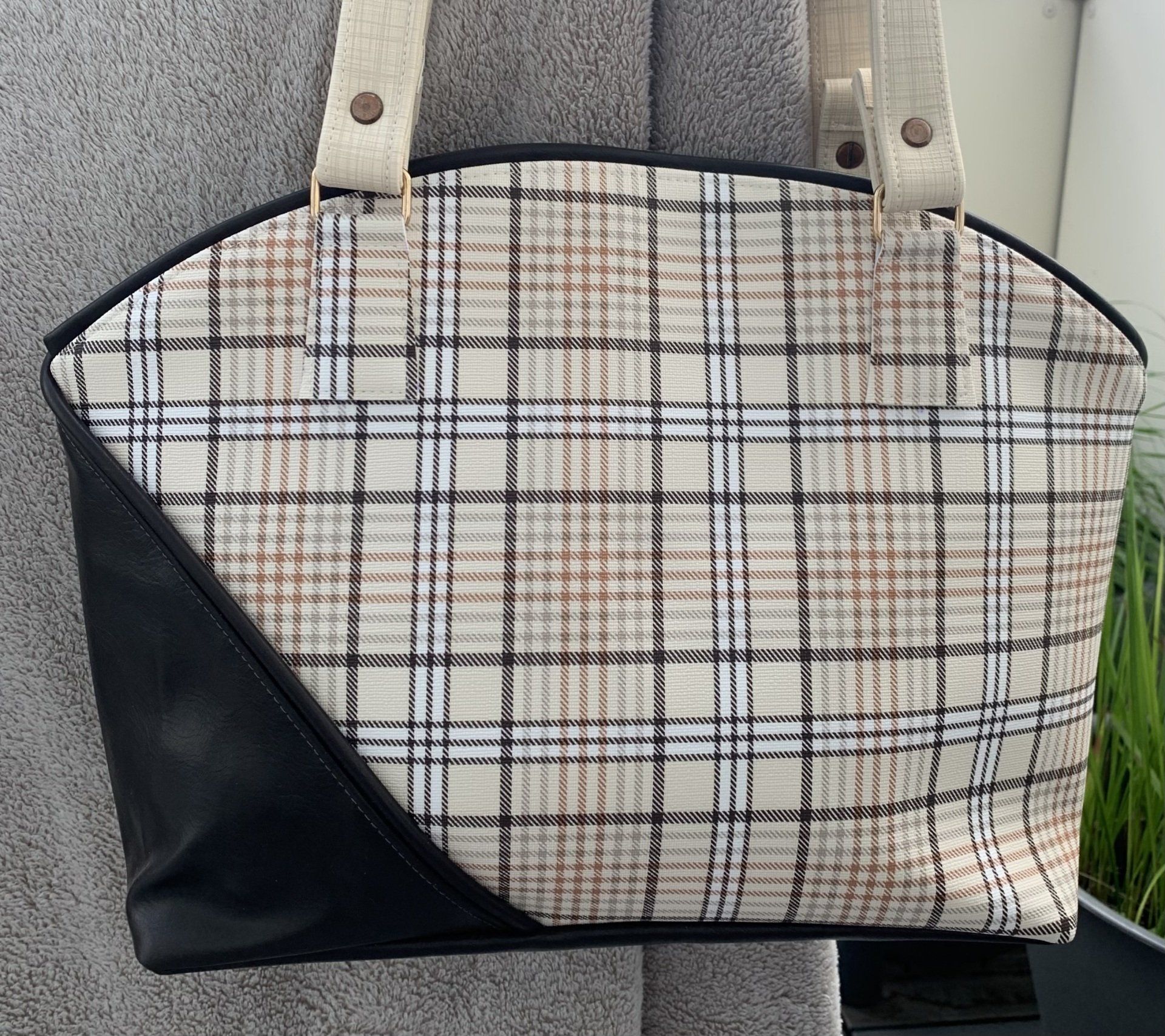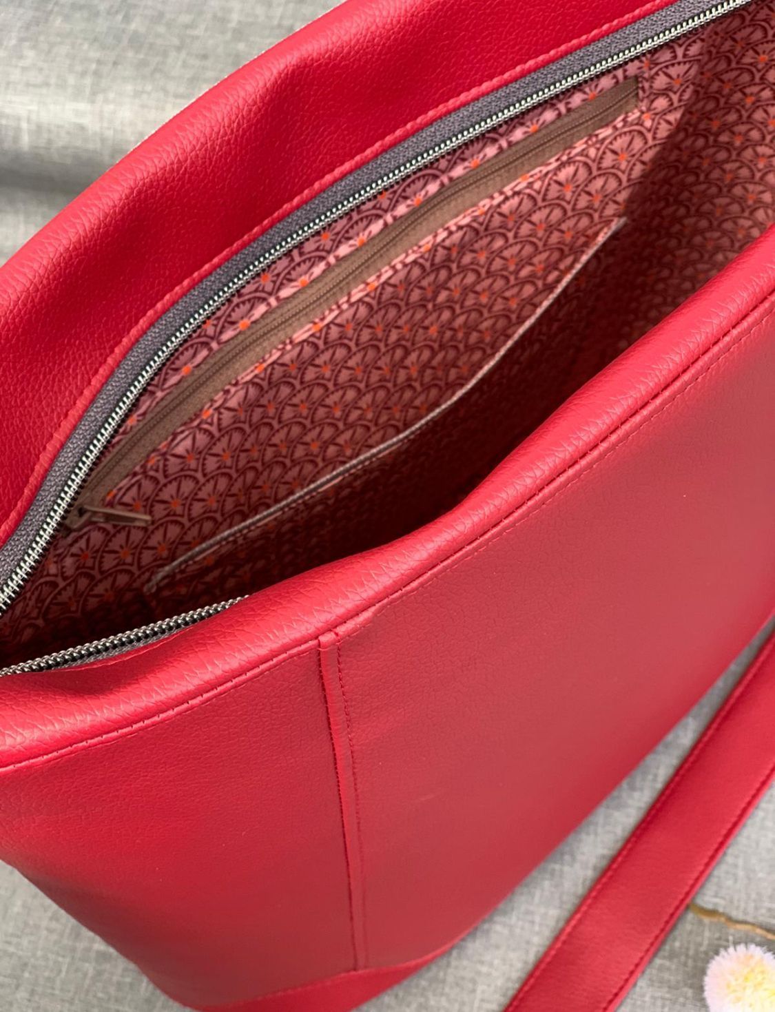 - Material: Kunstleder (Bordeauxrot), beschichtete Baumwolle (Taupe), Baumwollstoff (gemustert)