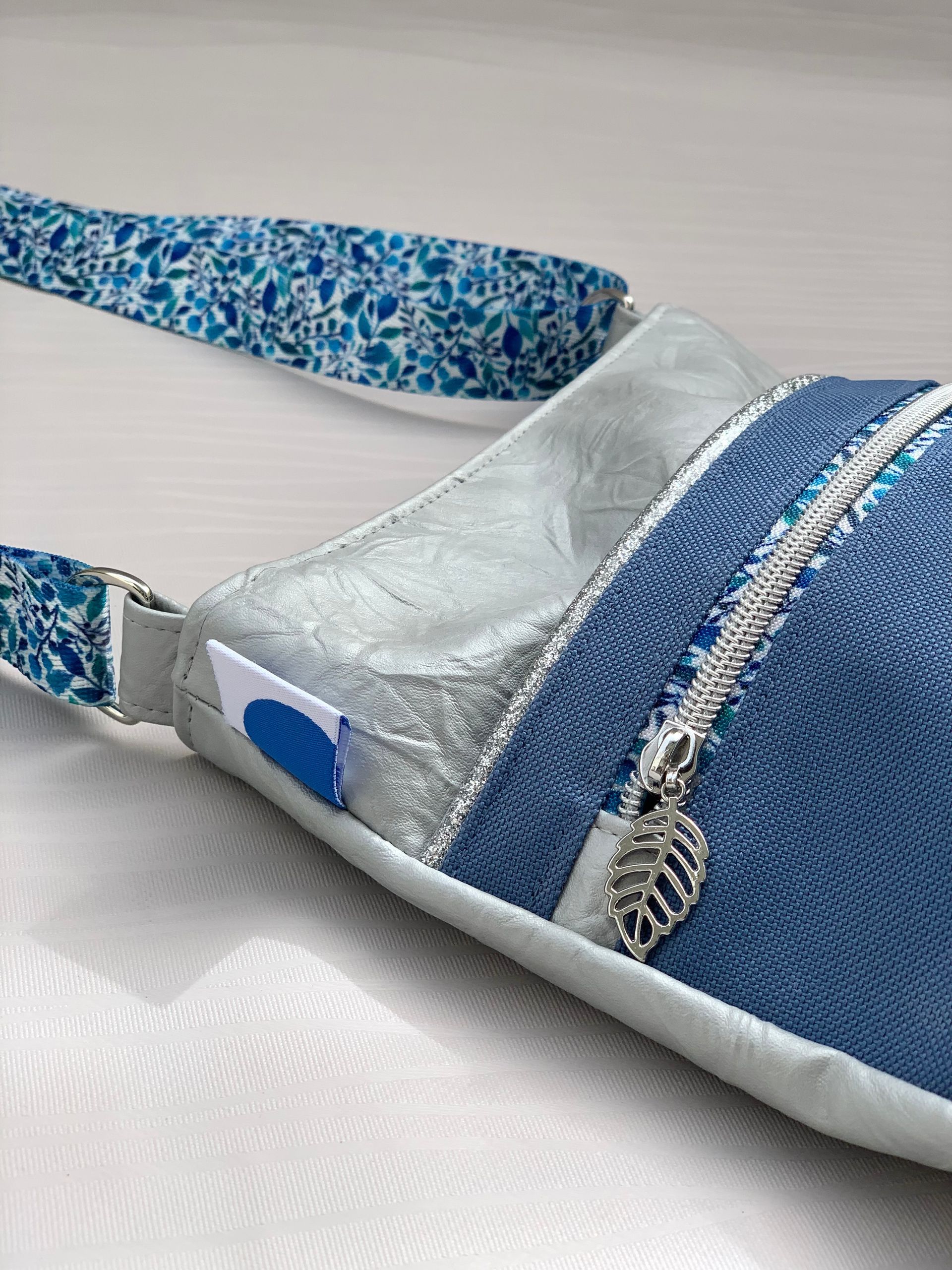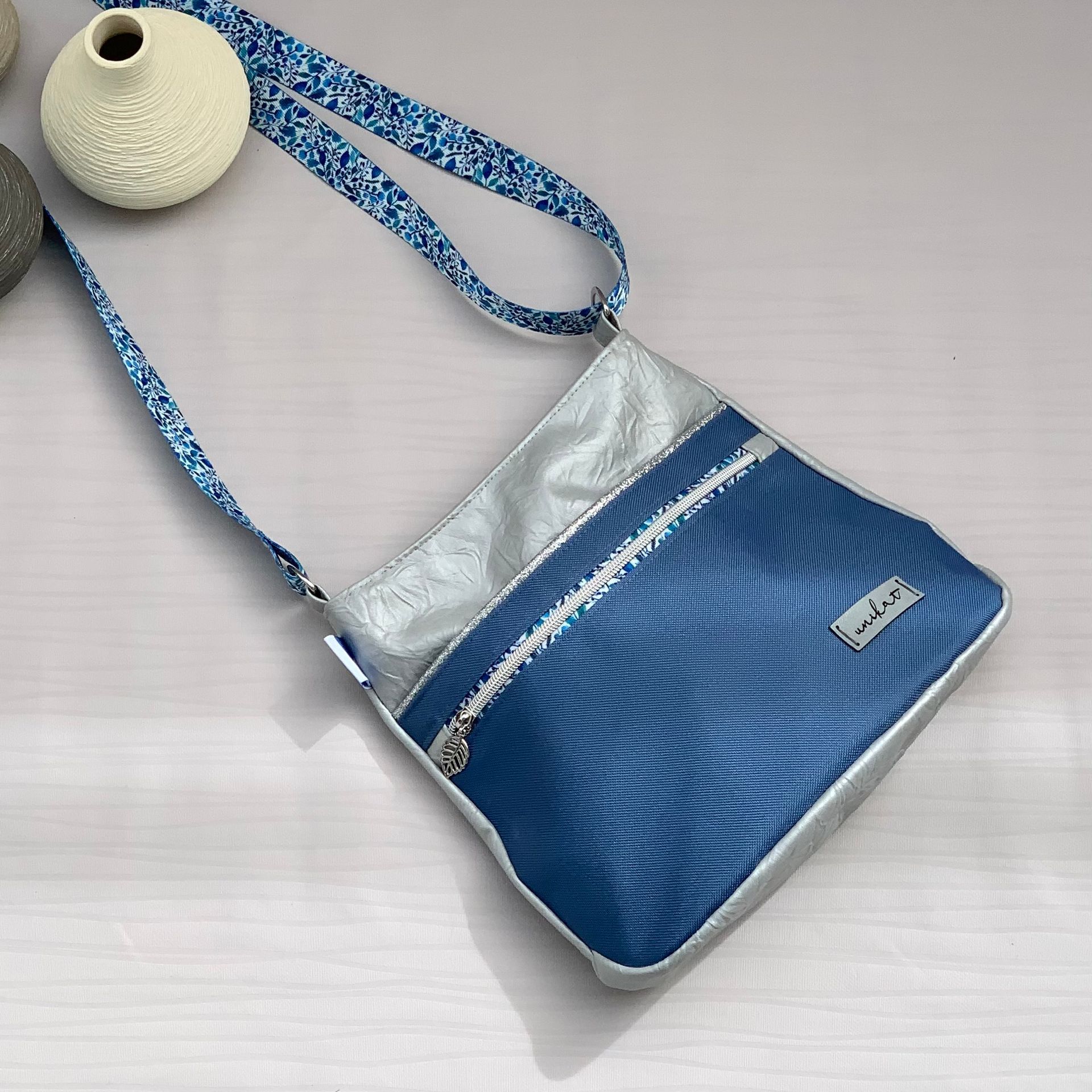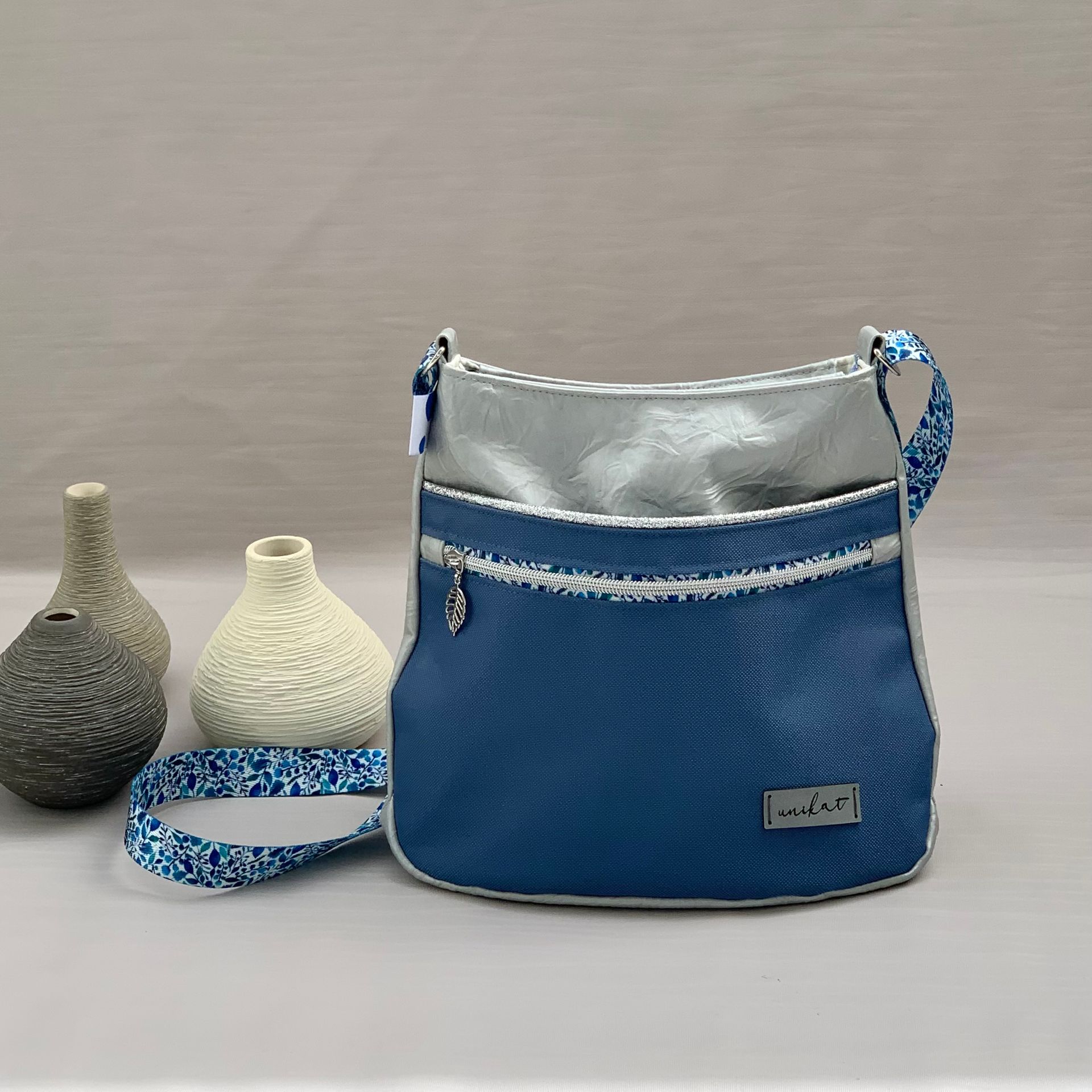 - Material: Lederimitat (Silbergrau), Oxfort600 (Blau), Canvas (innen)
