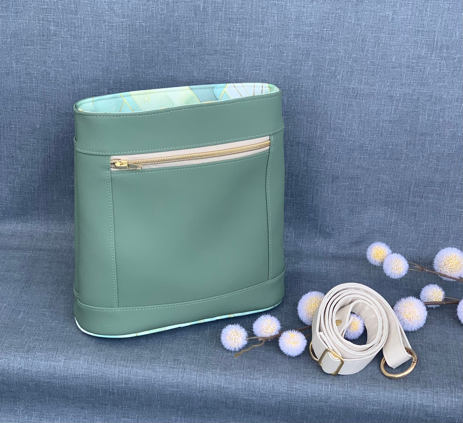 - Material: Kunstleder (Grün, Gemustert), wasserabweisender Teflonstoff (Beige), Baumwollstoff (Dunkelgrün mit Punkten)