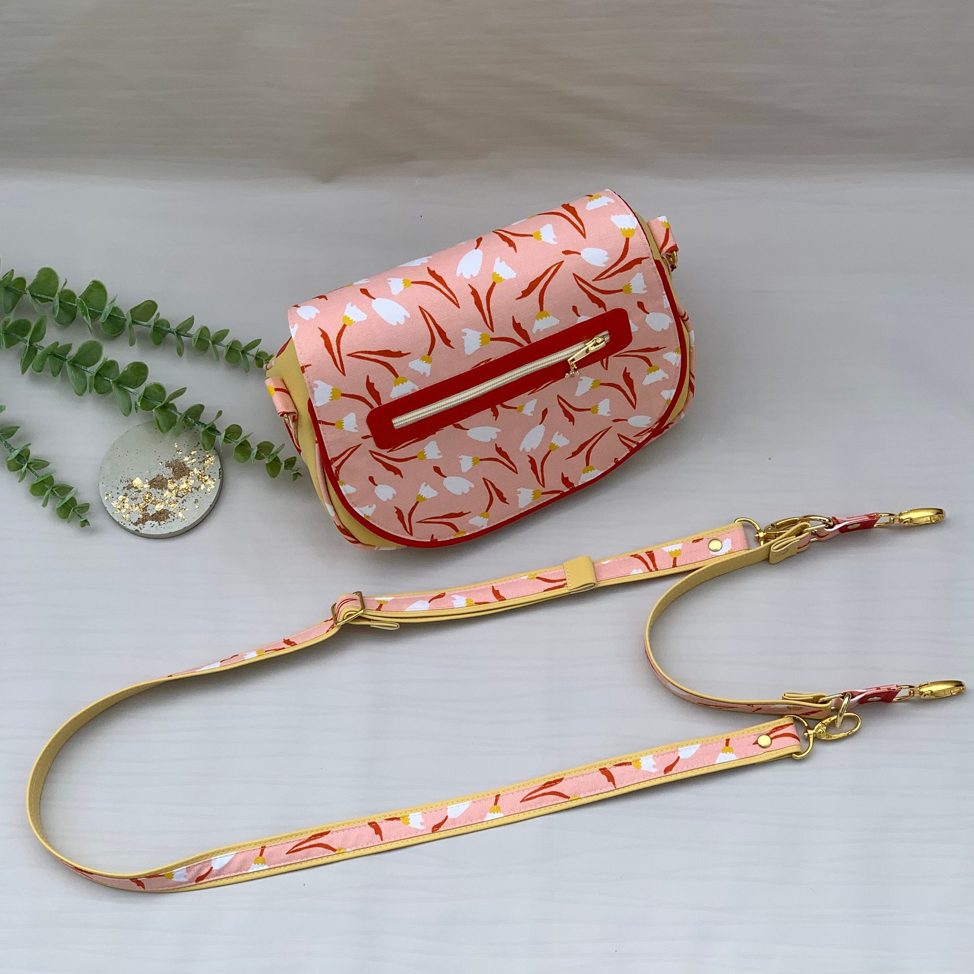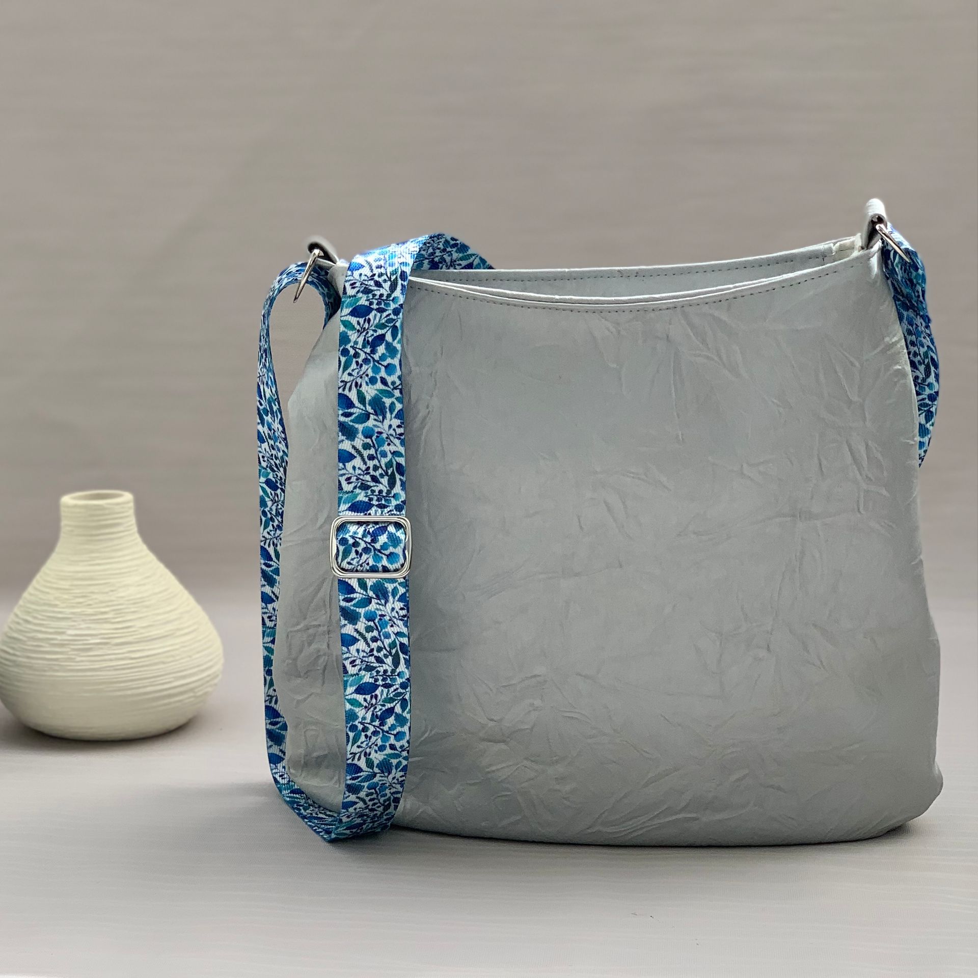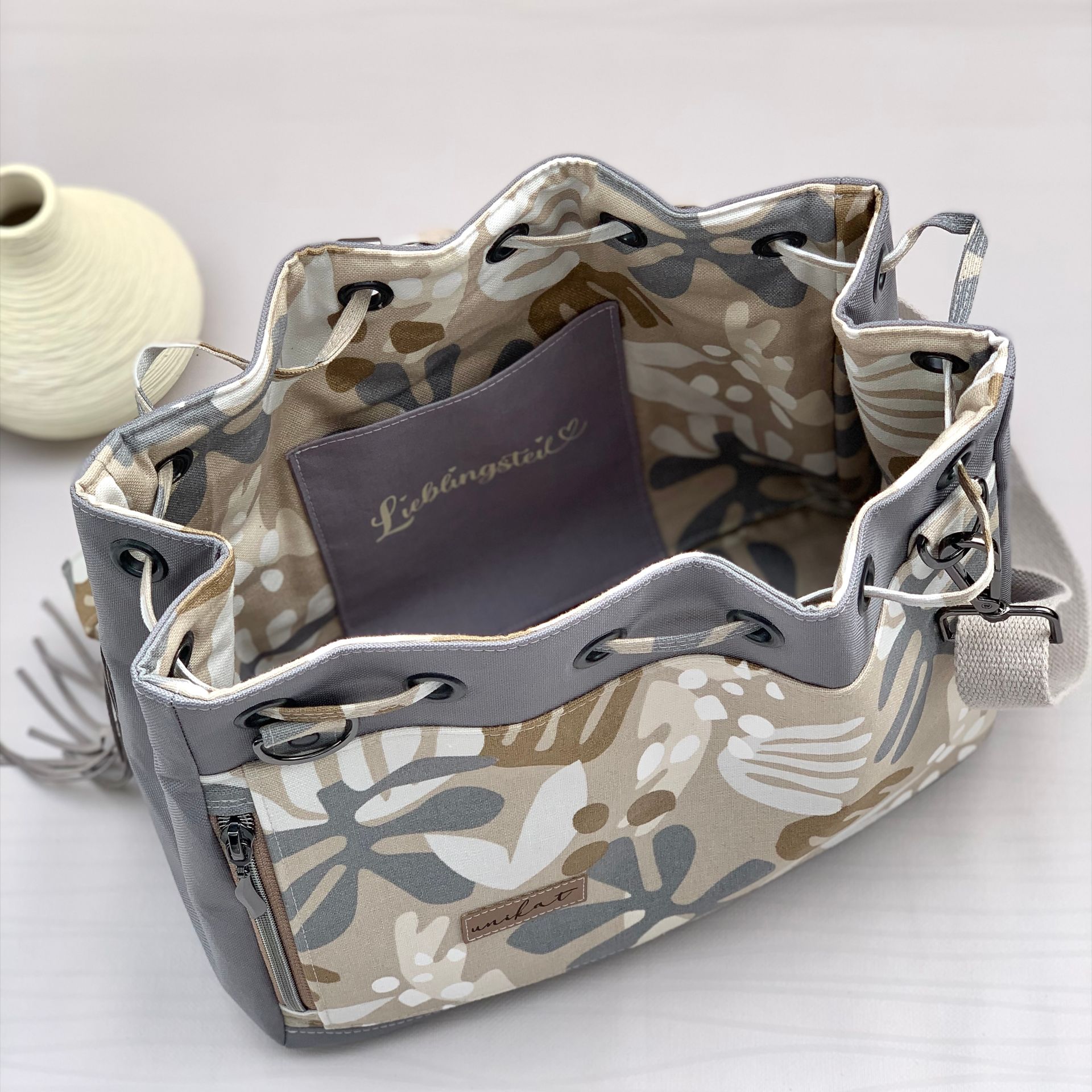 - Material: Canvas/ Gabardine ("Blumenwiese"), Kunstleder (Weiß, metallic), Canvas (unifarben Marsala), Echtlederriemen