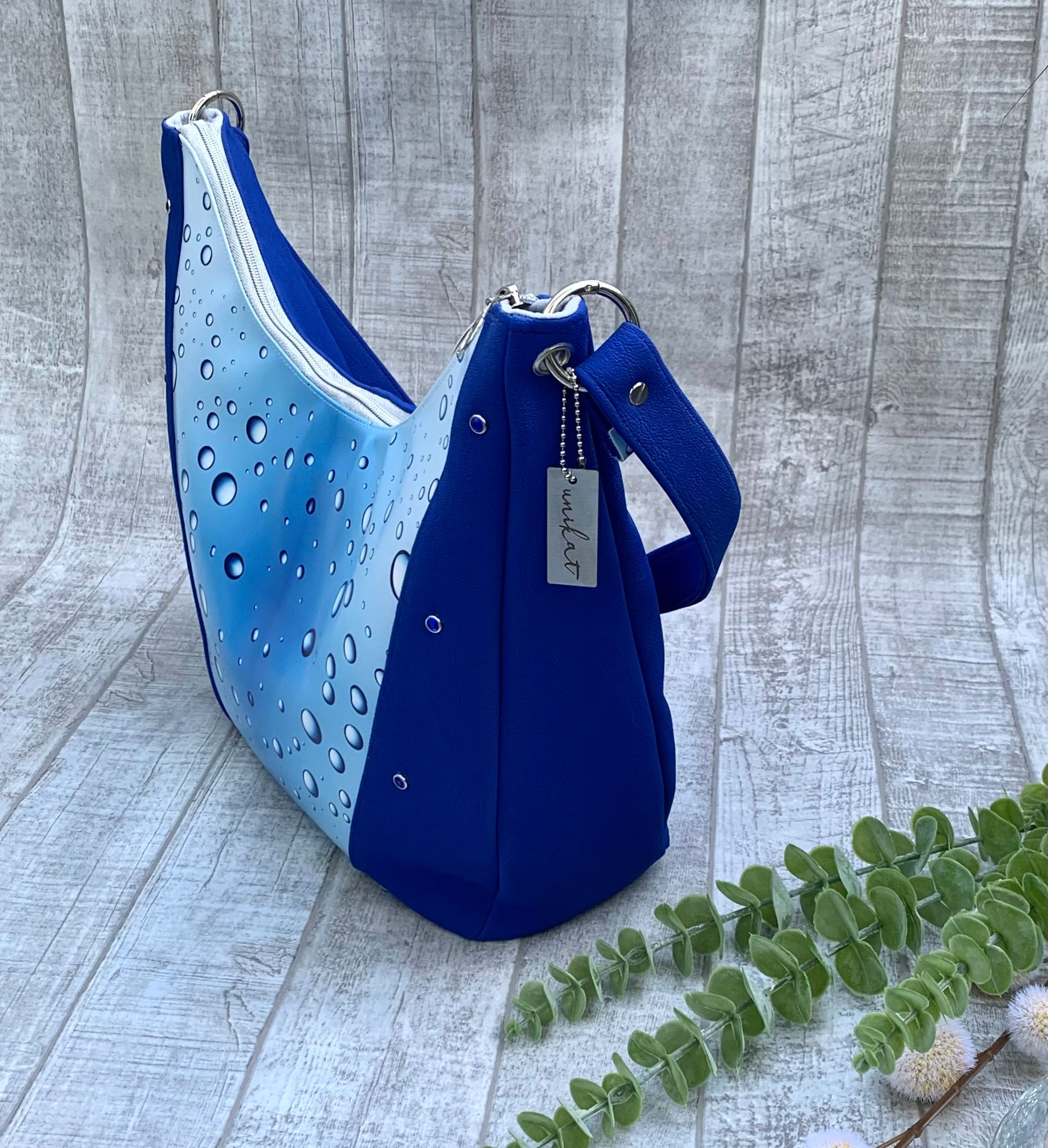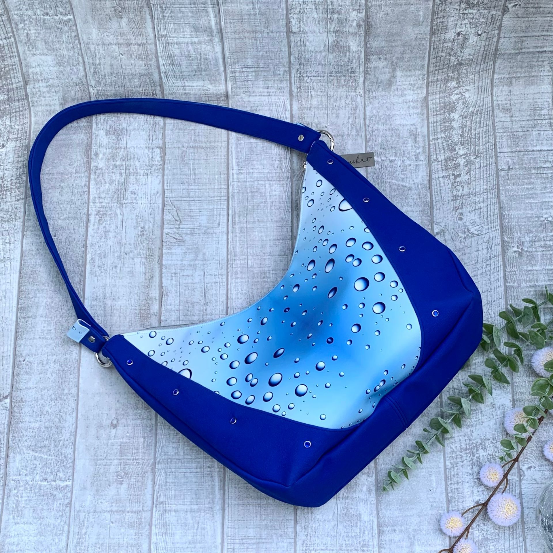 - Material: Lederimitat (Royalblau und "Wassertropfen"), Baumwolle (grau-weiß gepunktet)