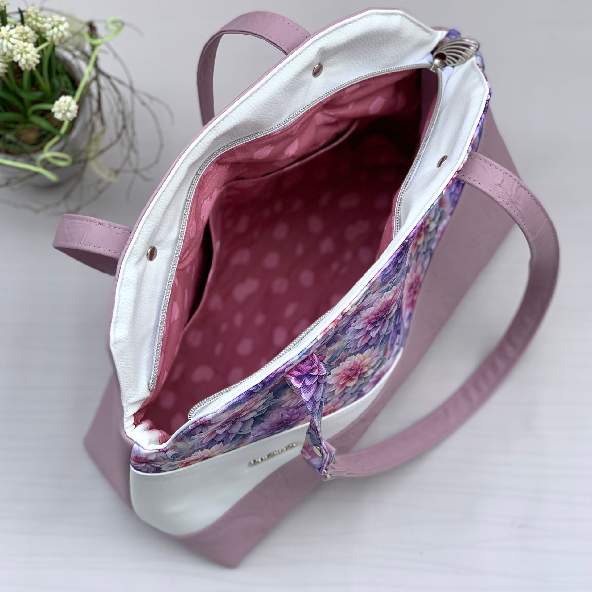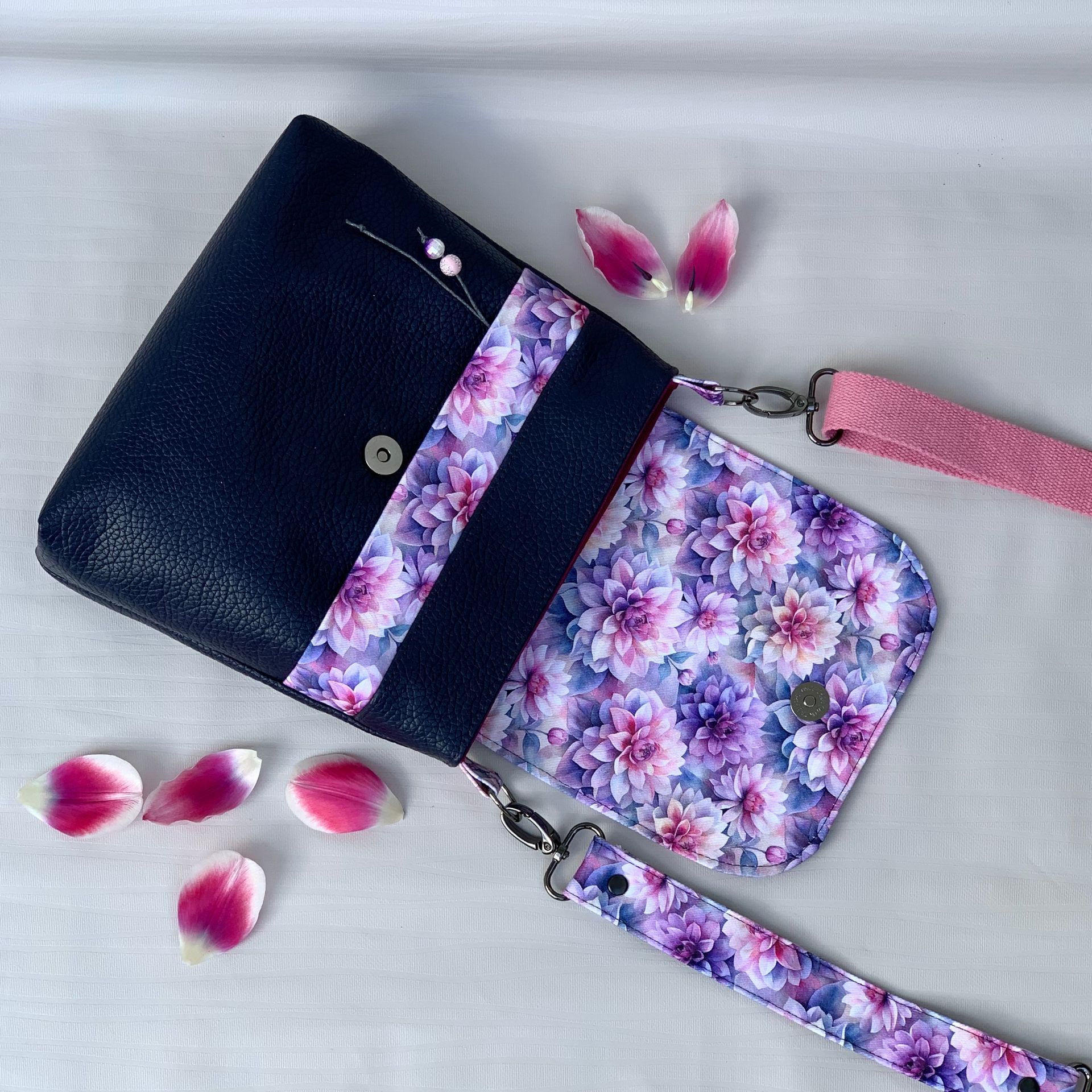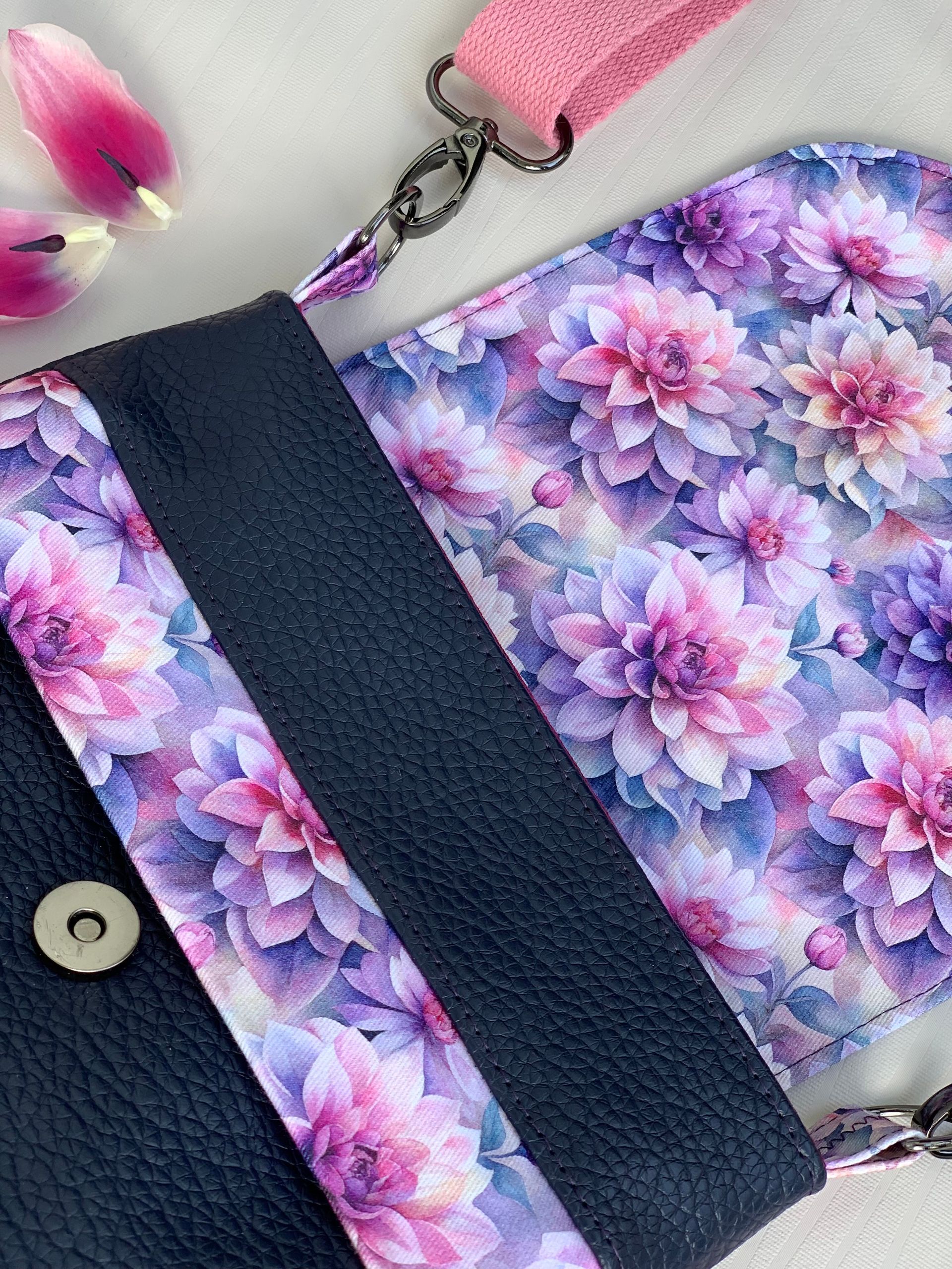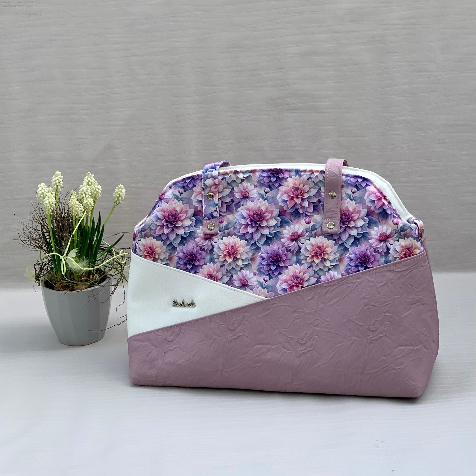 - Material: Kunstleder (Altrosa, Weiß), Canvas (Dahlien), Baumwollstoff (innen Rosa)