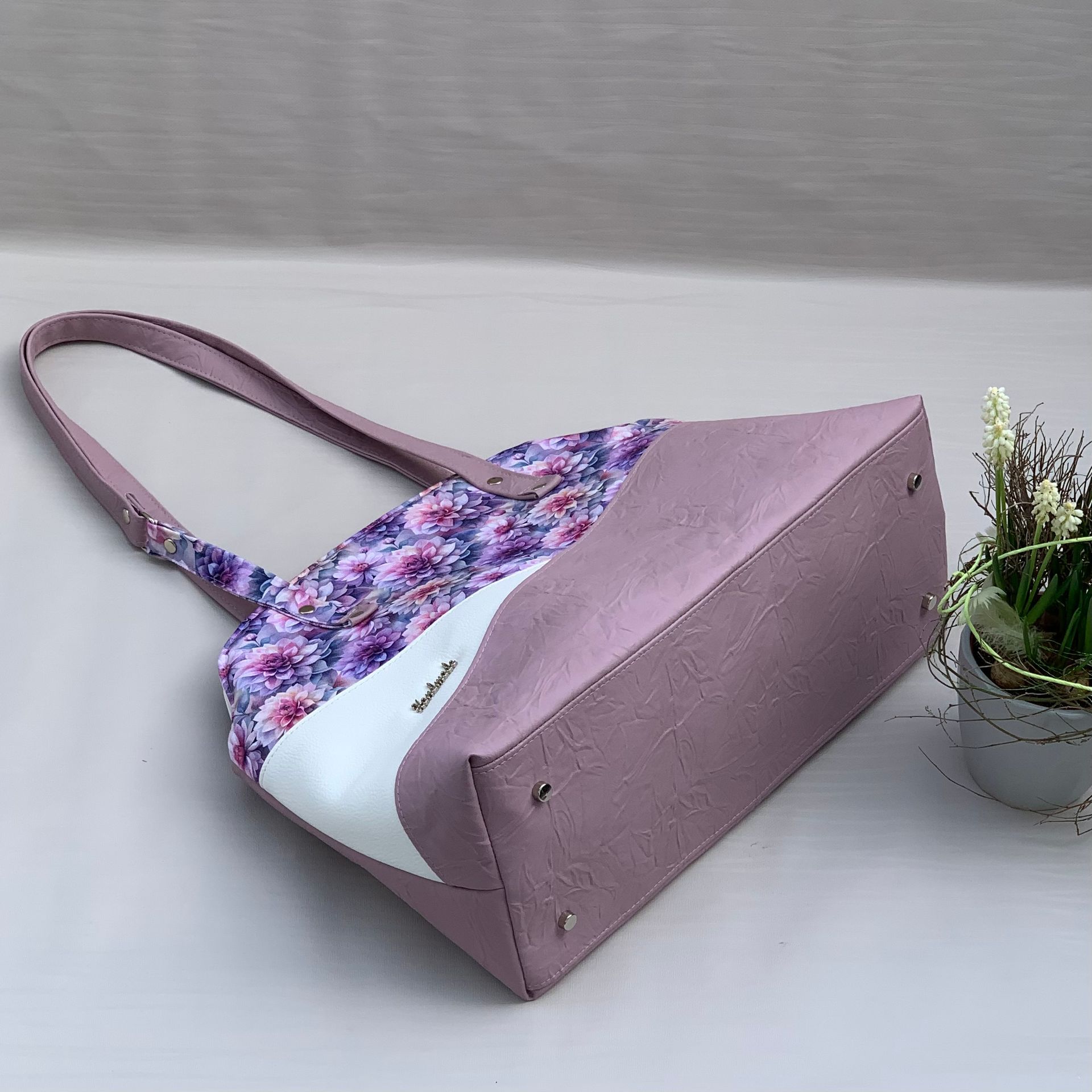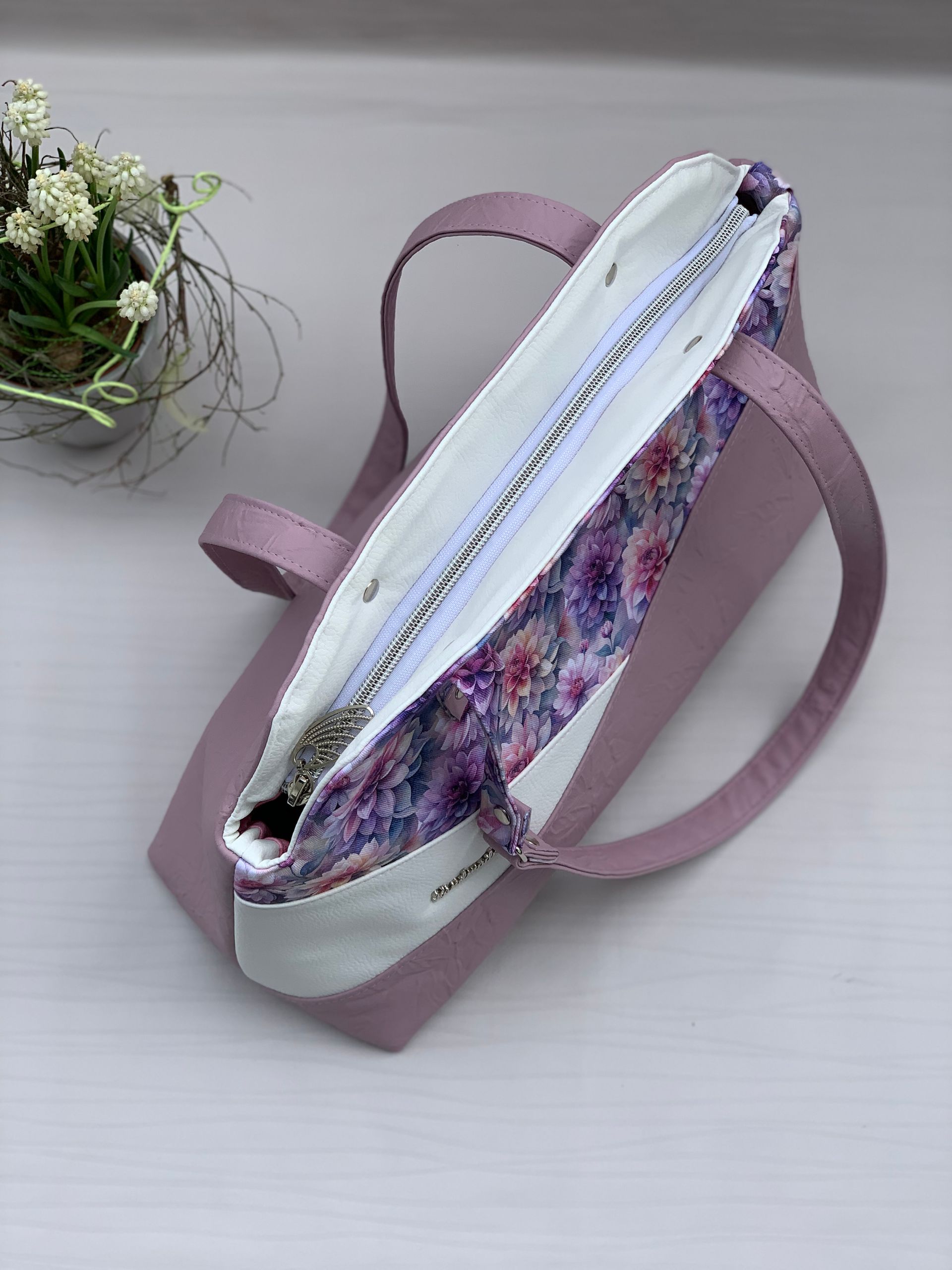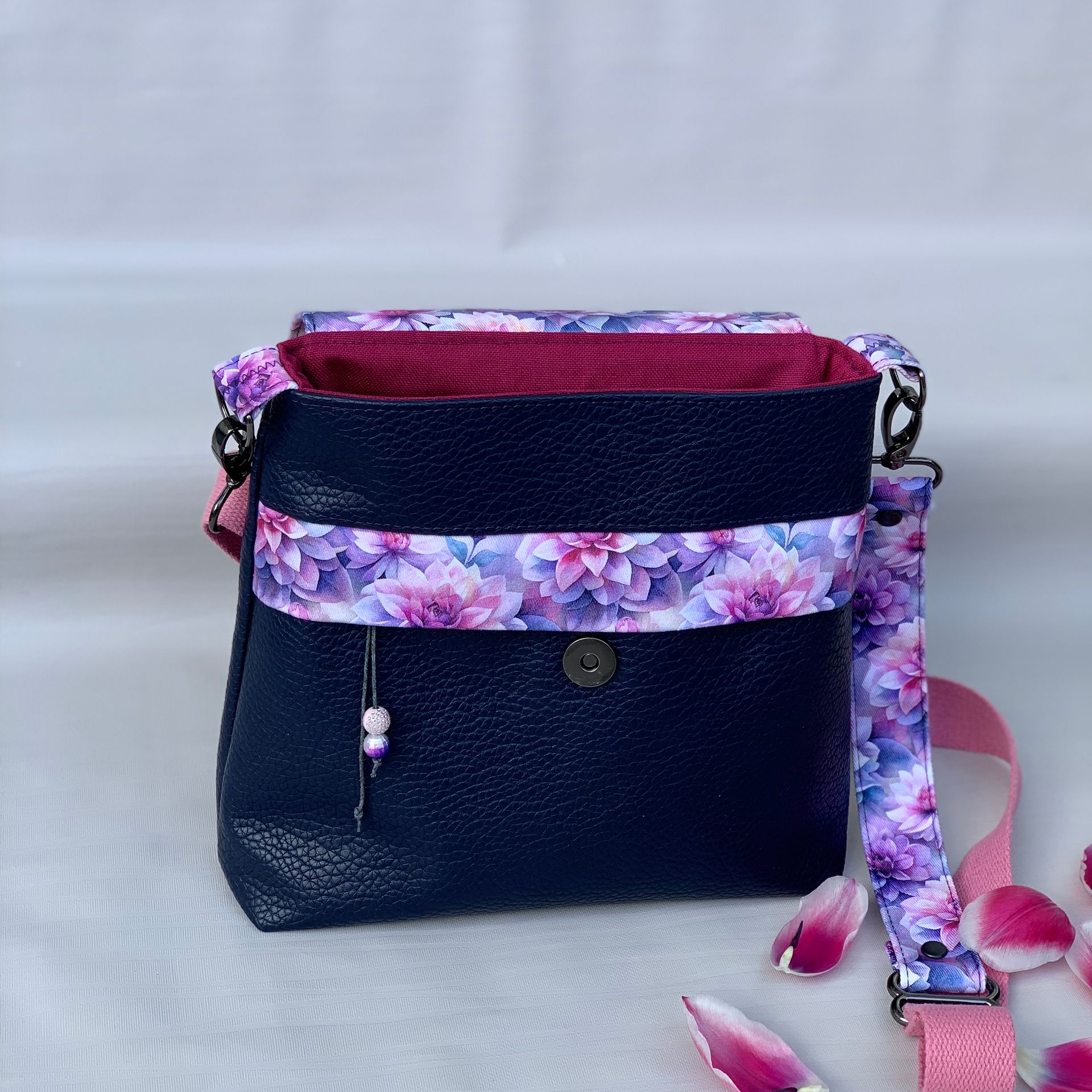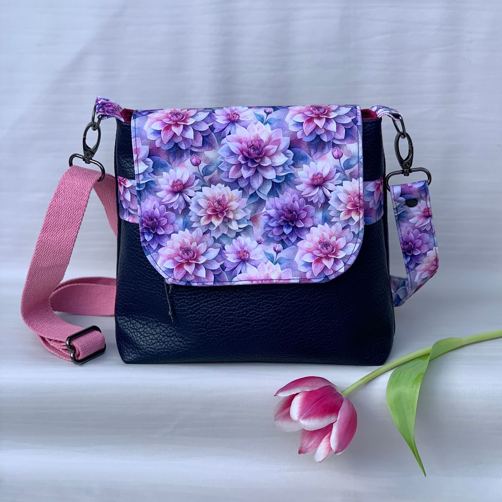 - Material: Kunstleder (Altrosa, Weiß), Canvas (Dahlien), Baumwollstoff (innen Rosa)