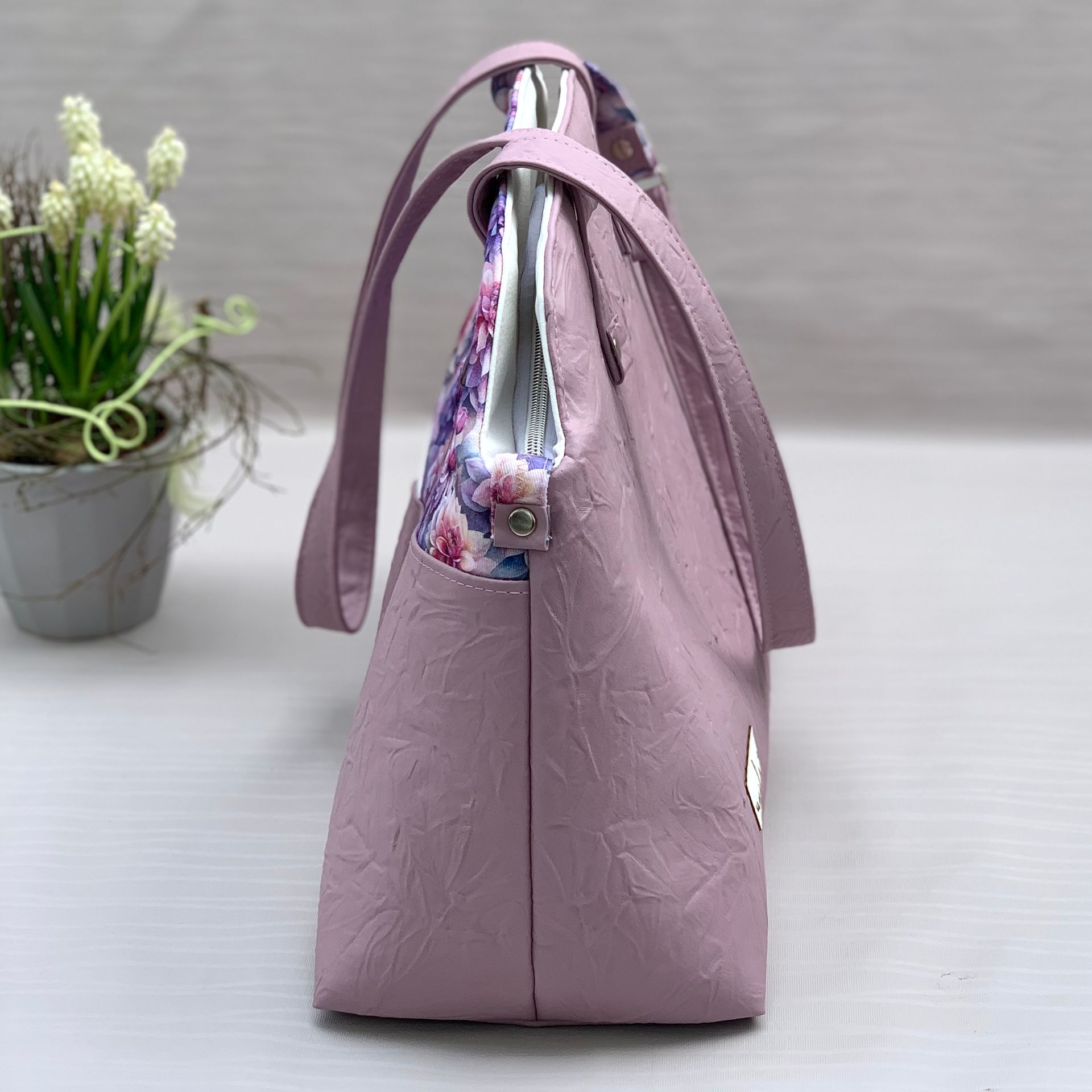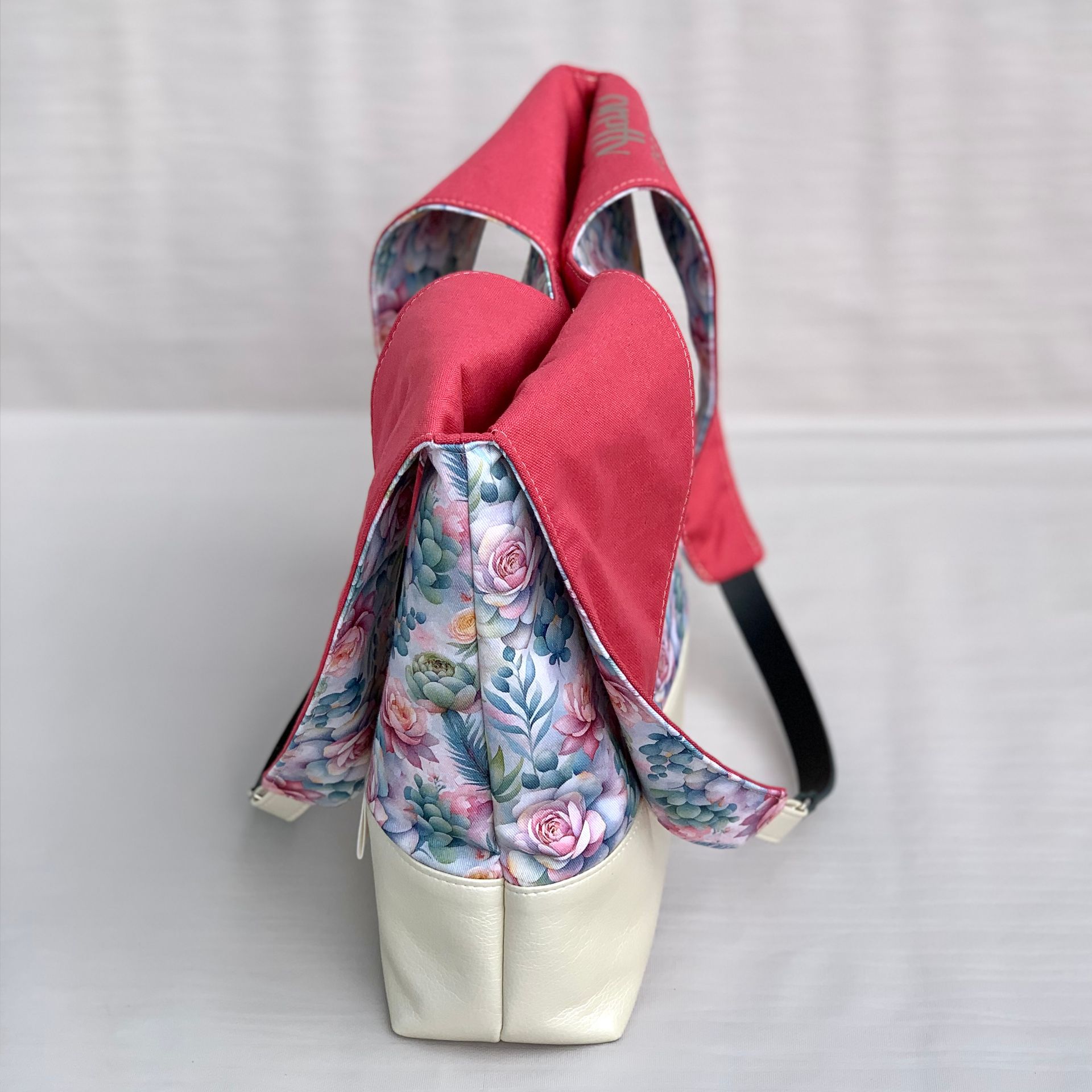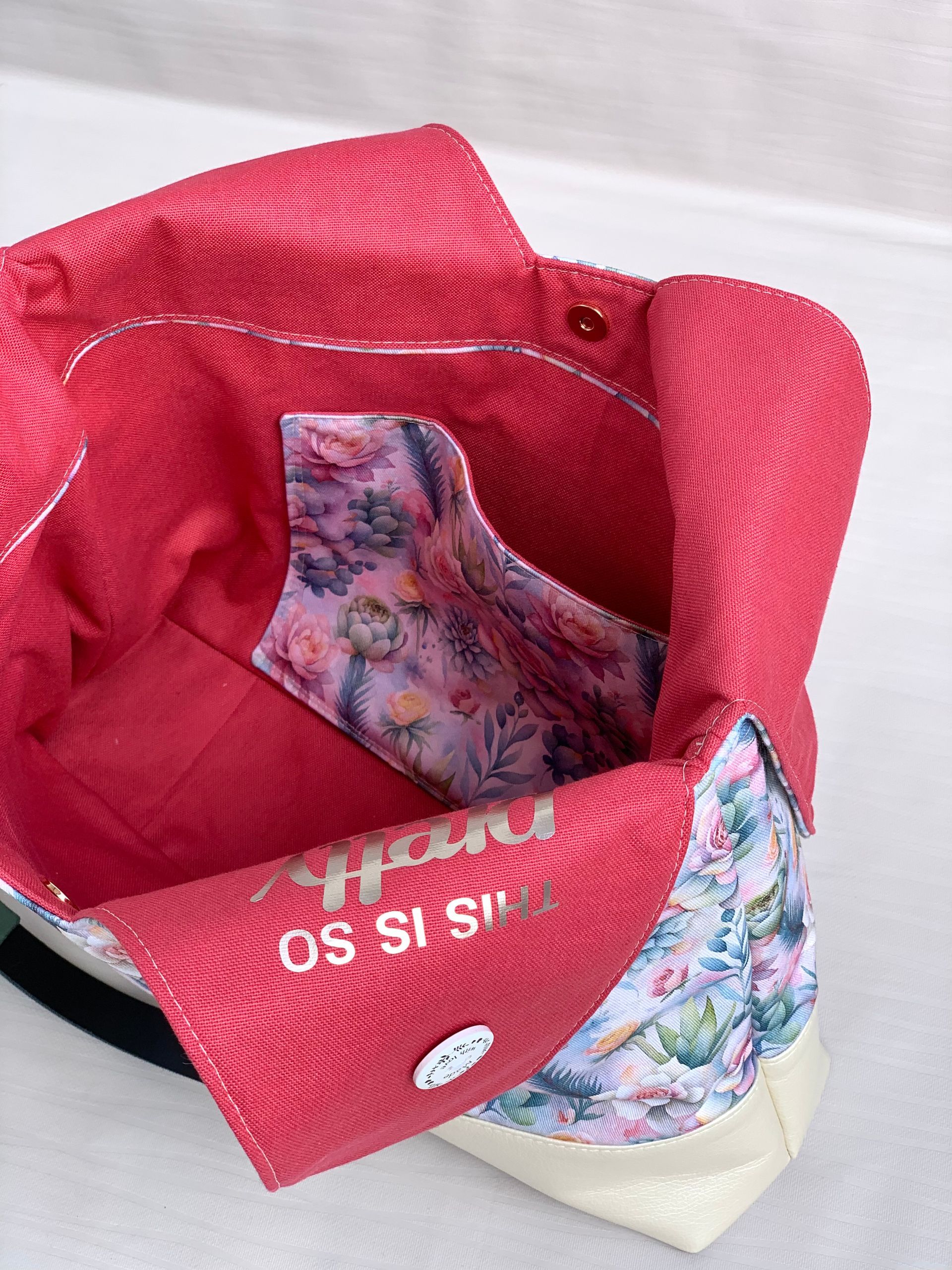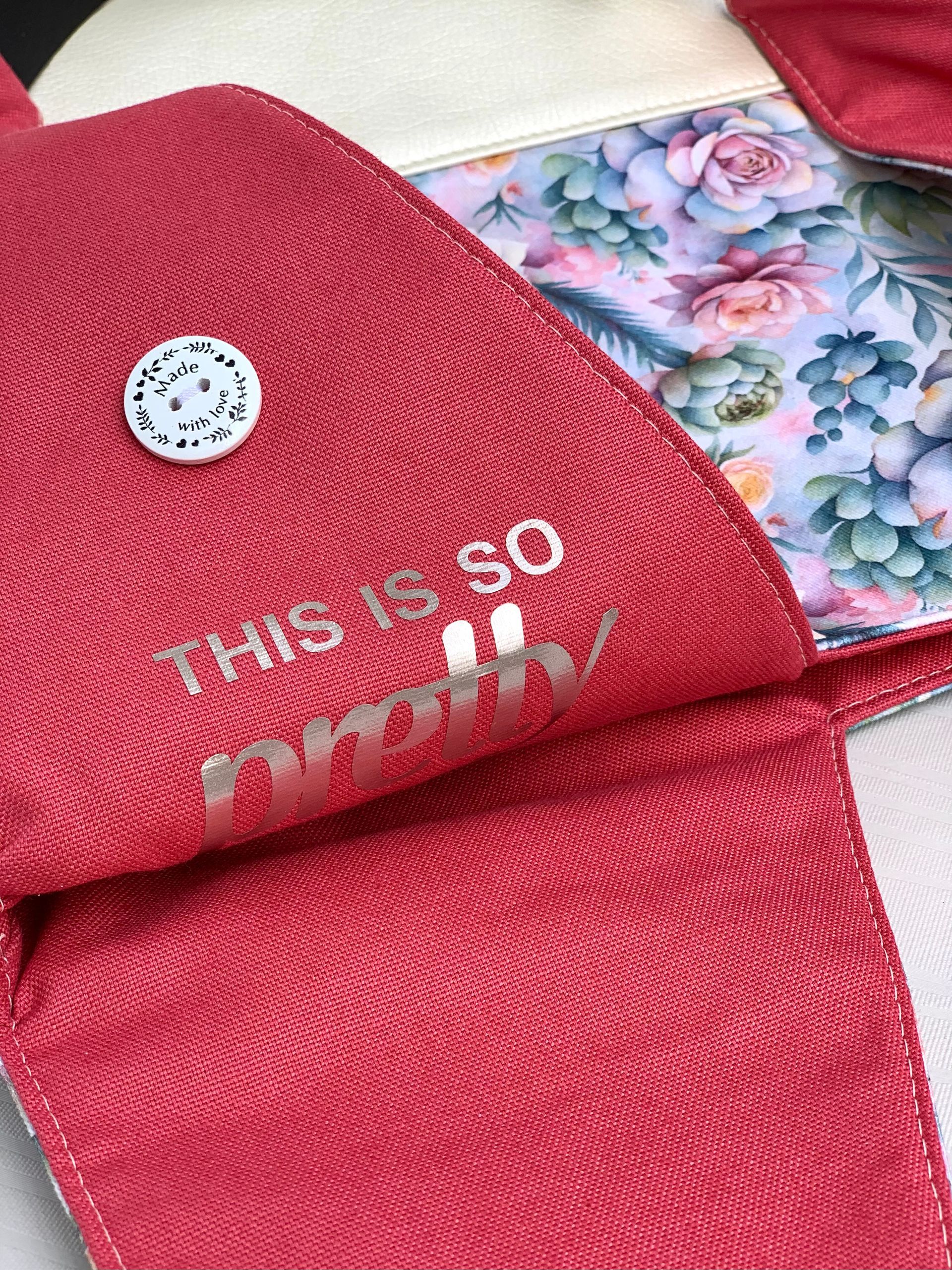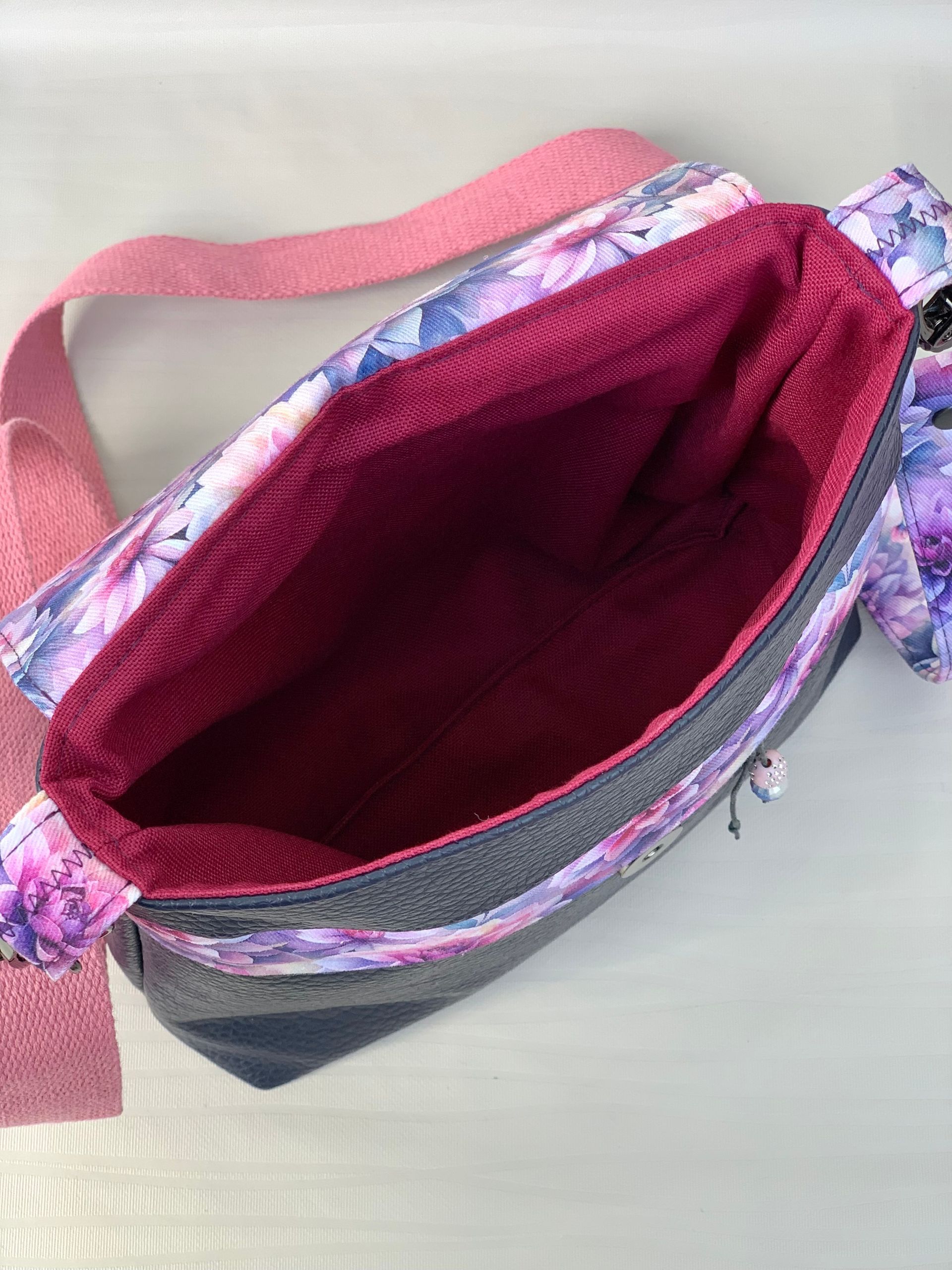 - Material: Kunstleder (Altrosa, Weiß), Canvas (Dahlien), Baumwollstoff (innen Rosa)