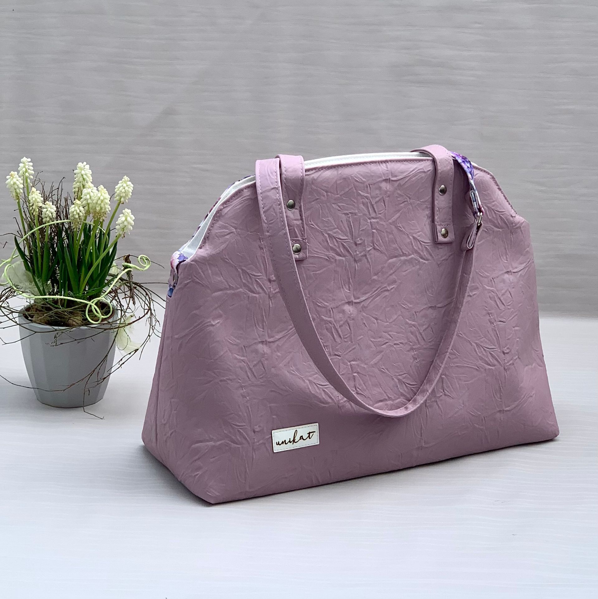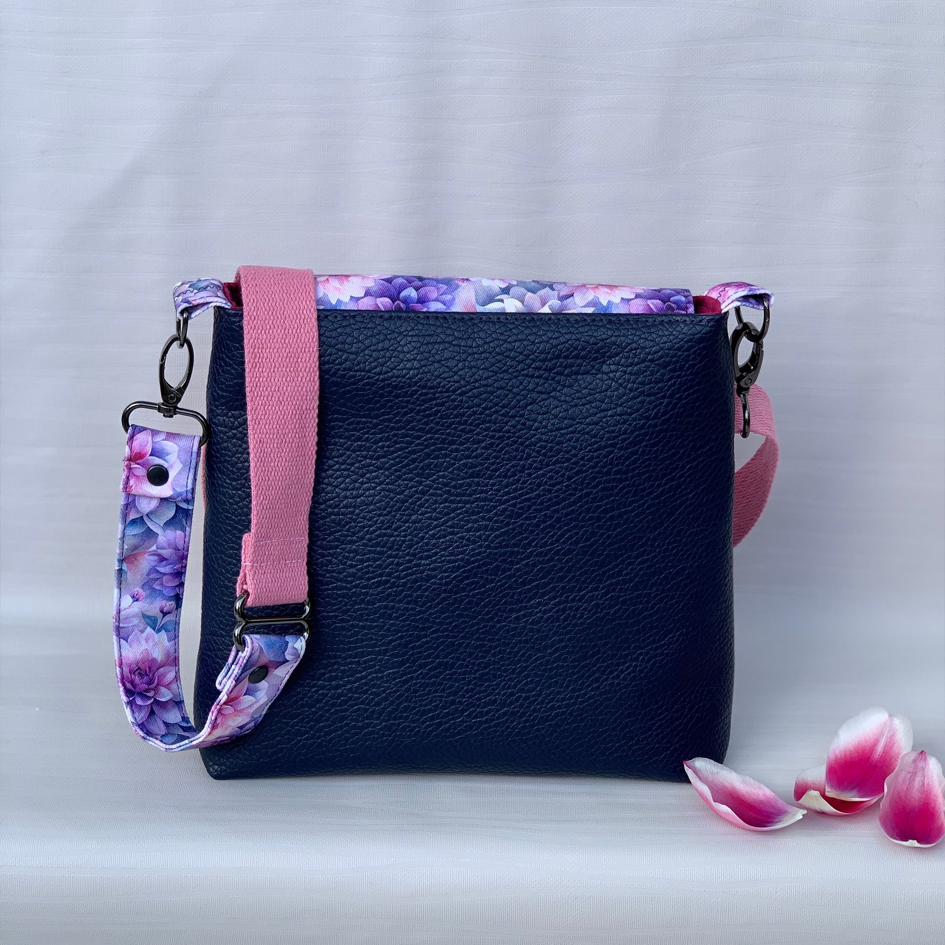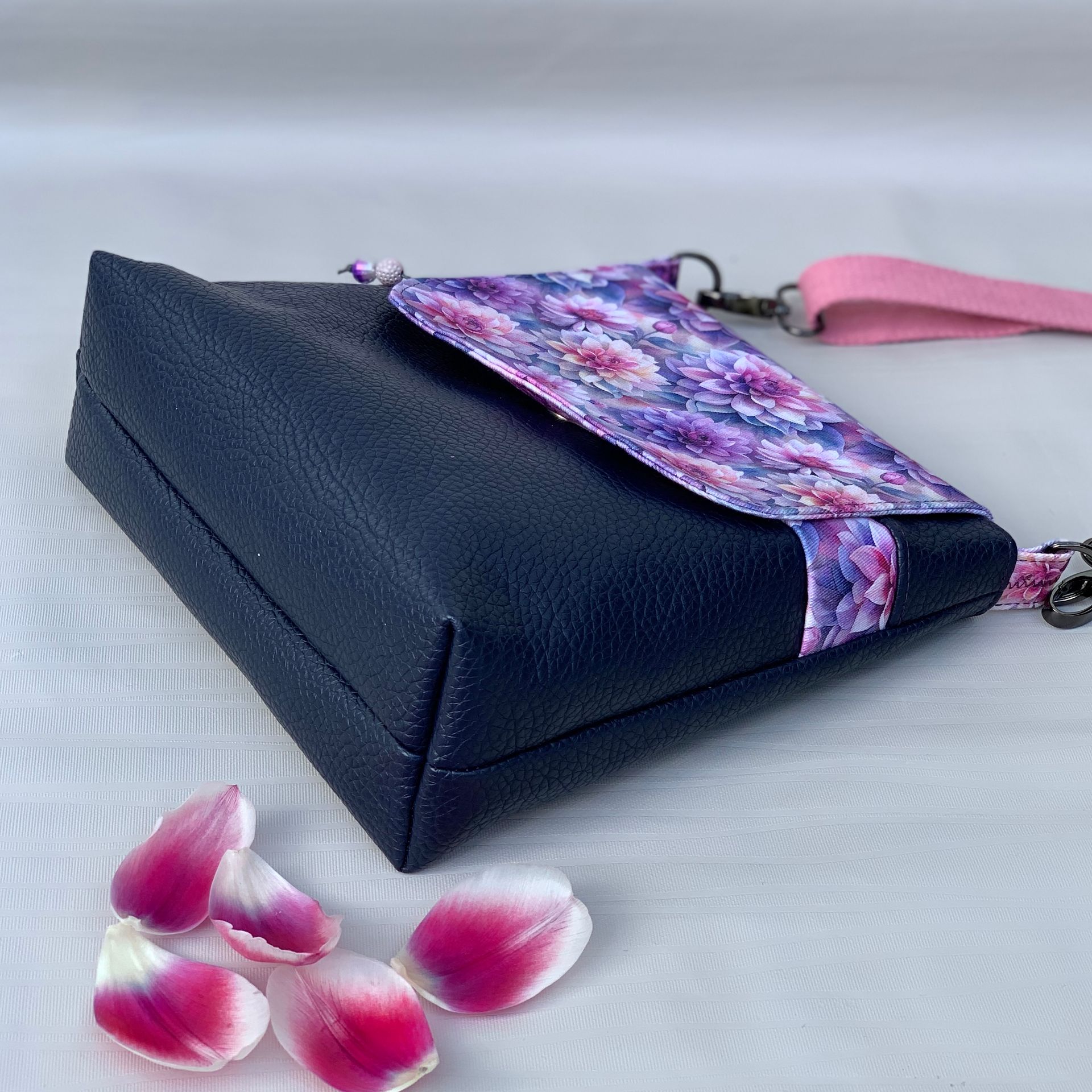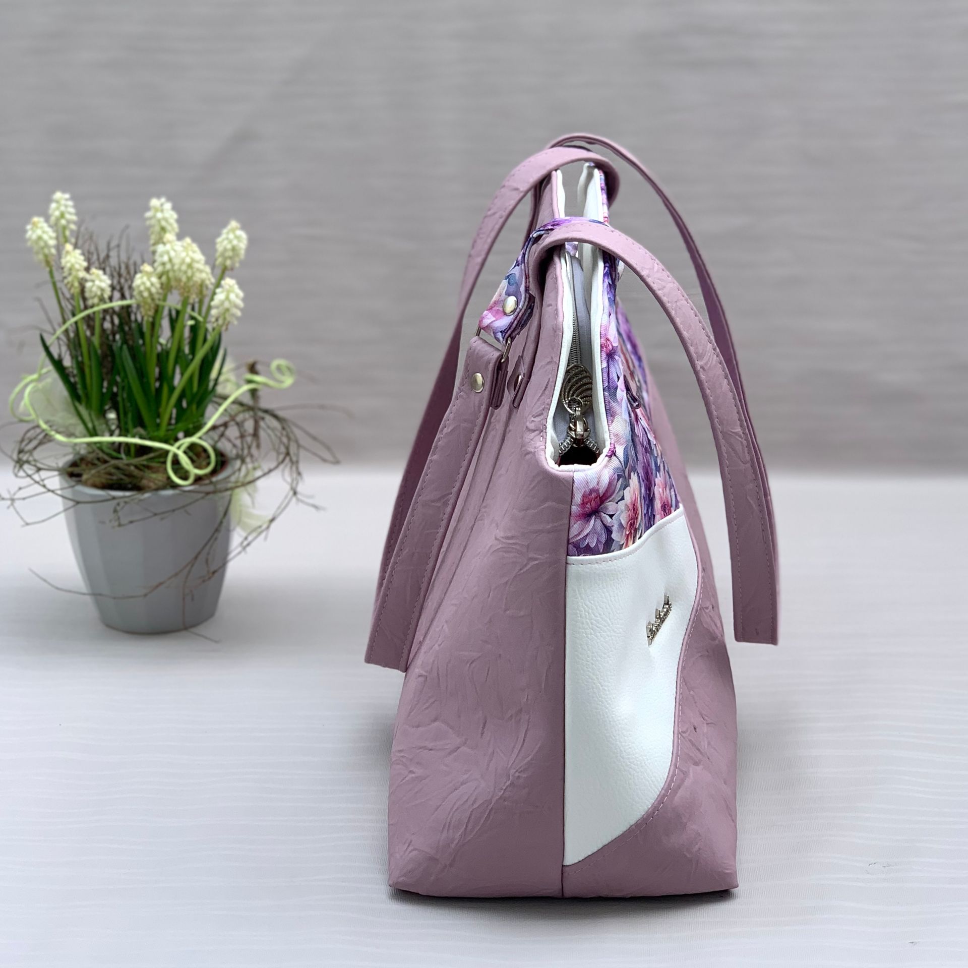 - Material: Kunstleder (Altrosa, Weiß), Canvas (Dahlien), Baumwollstoff (innen Rosa)