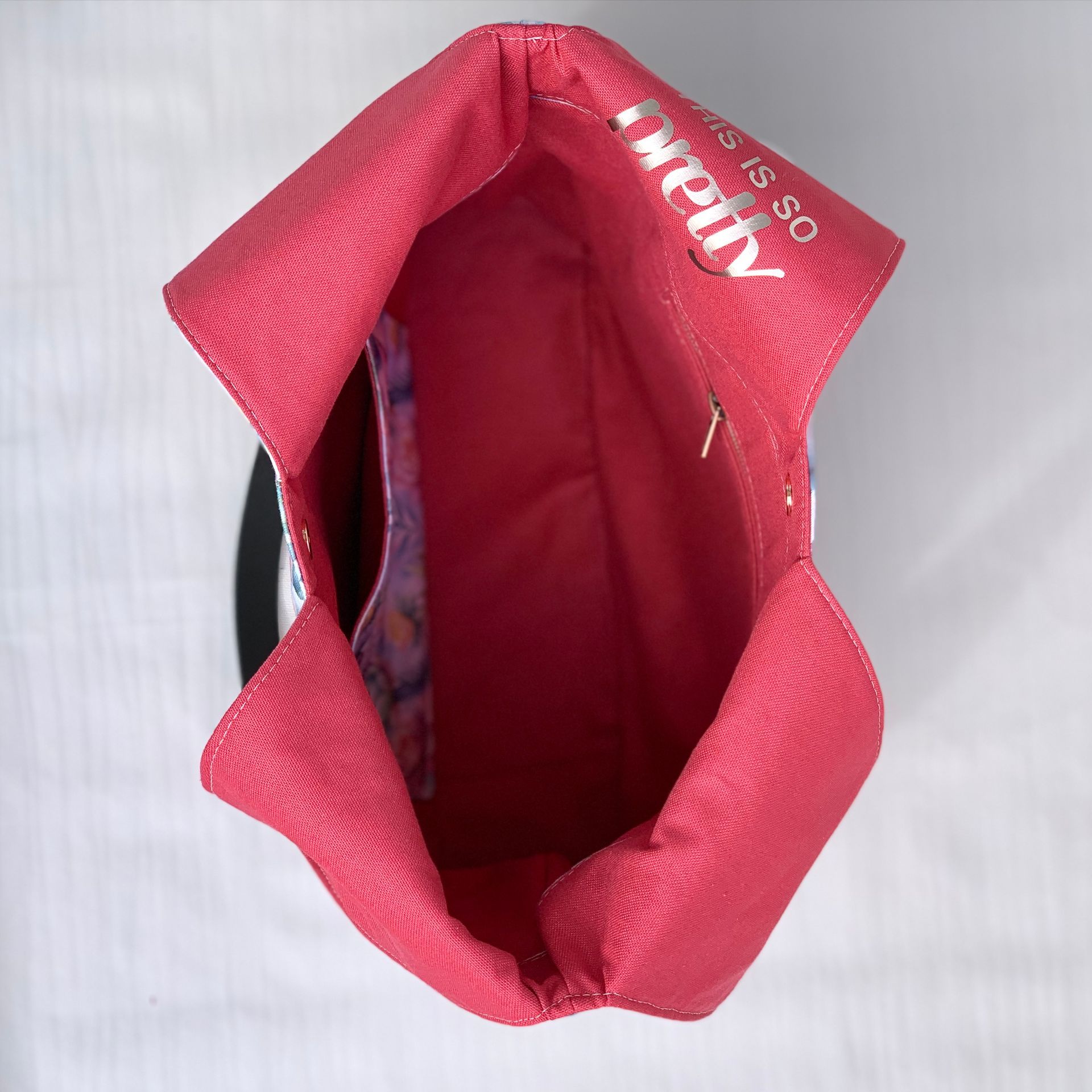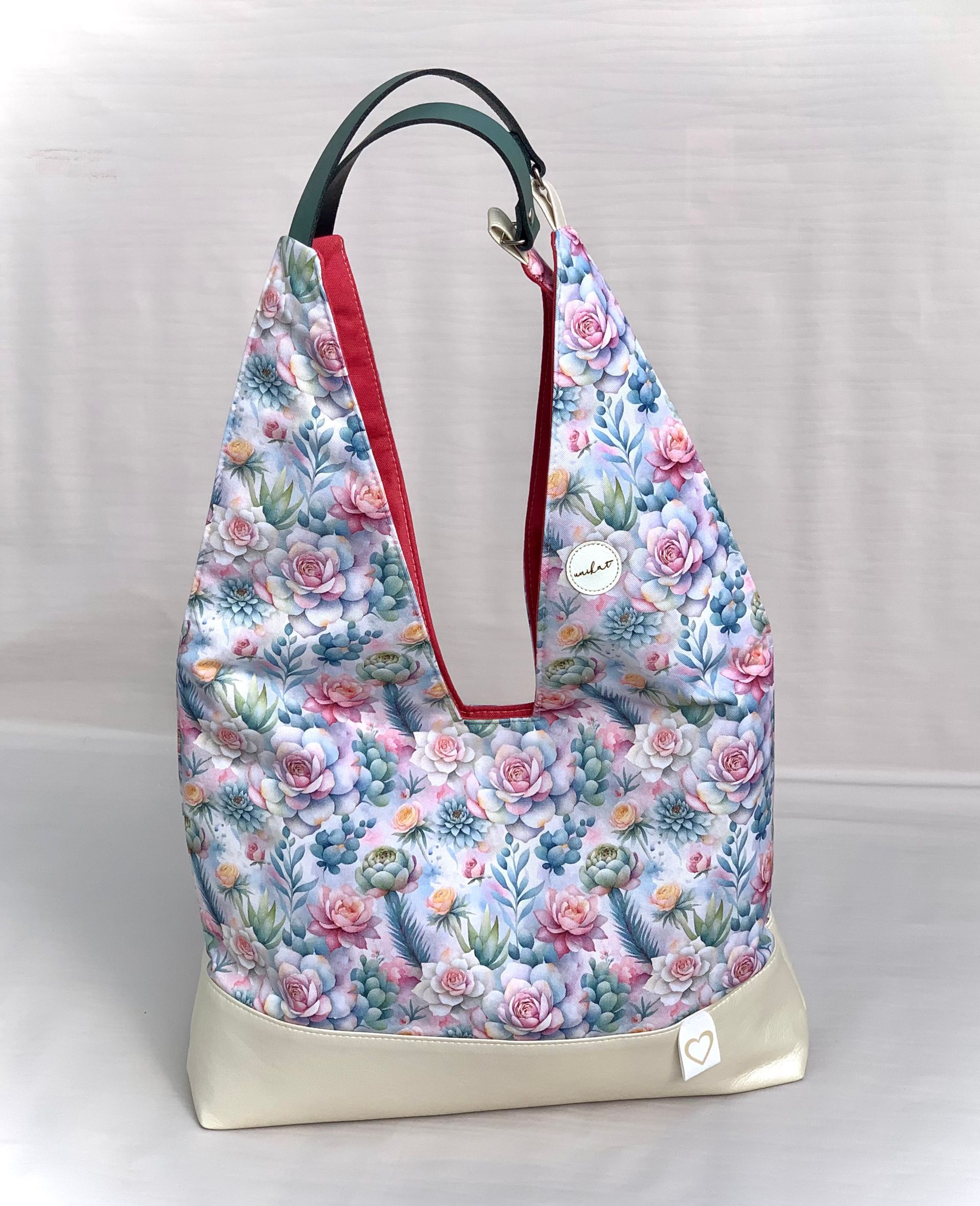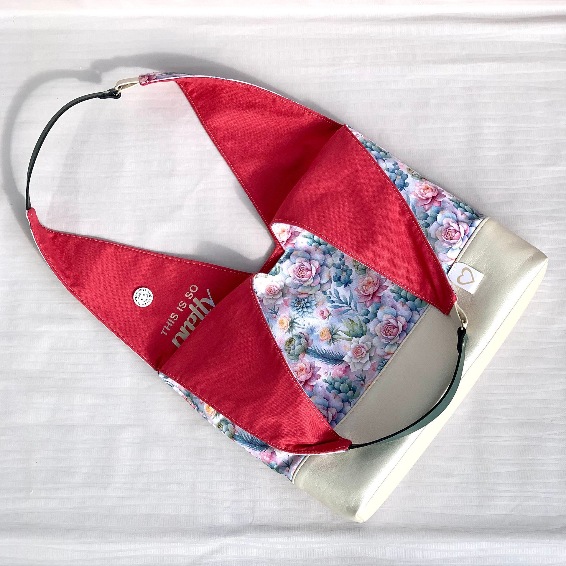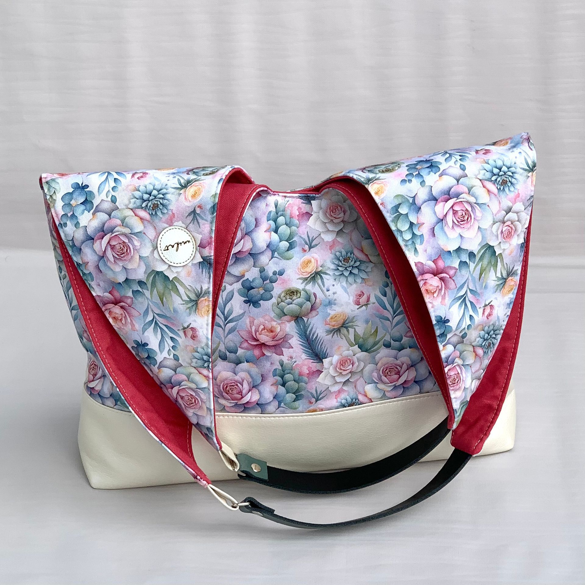 - Material: Kunstleder (Altrosa, Weiß), Canvas (Dahlien), Baumwollstoff (innen Rosa)