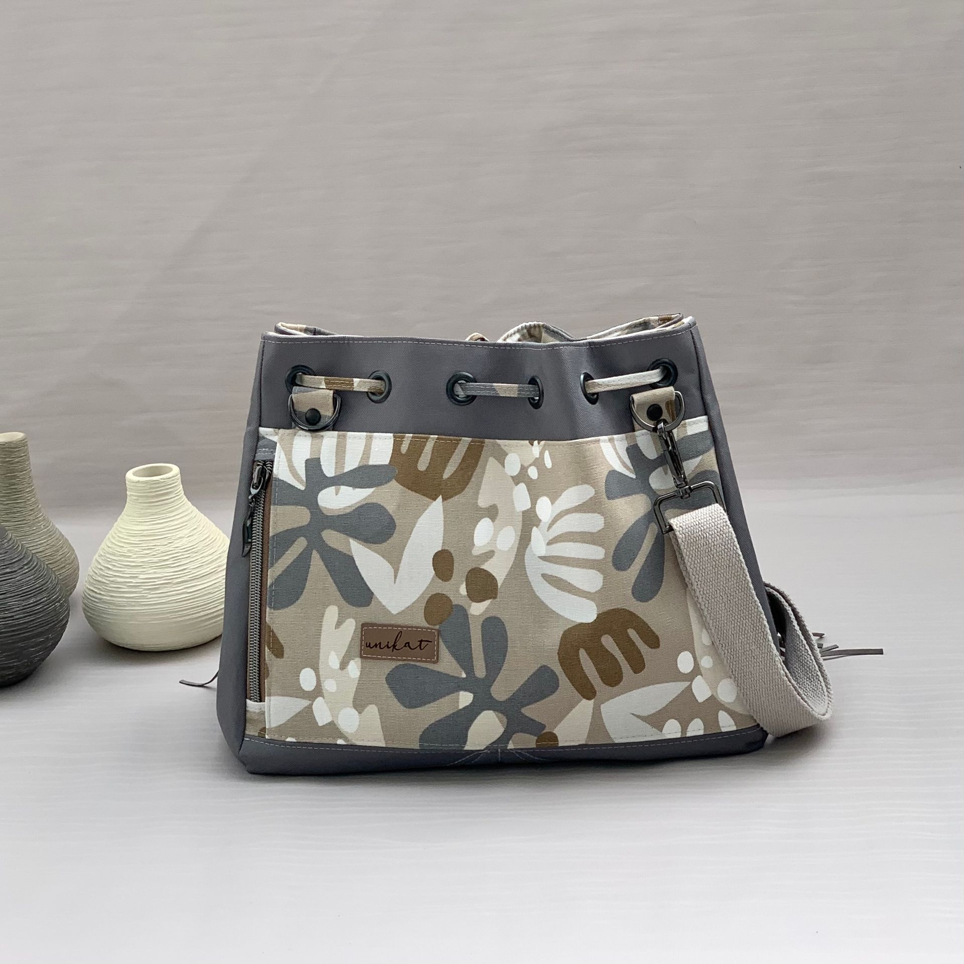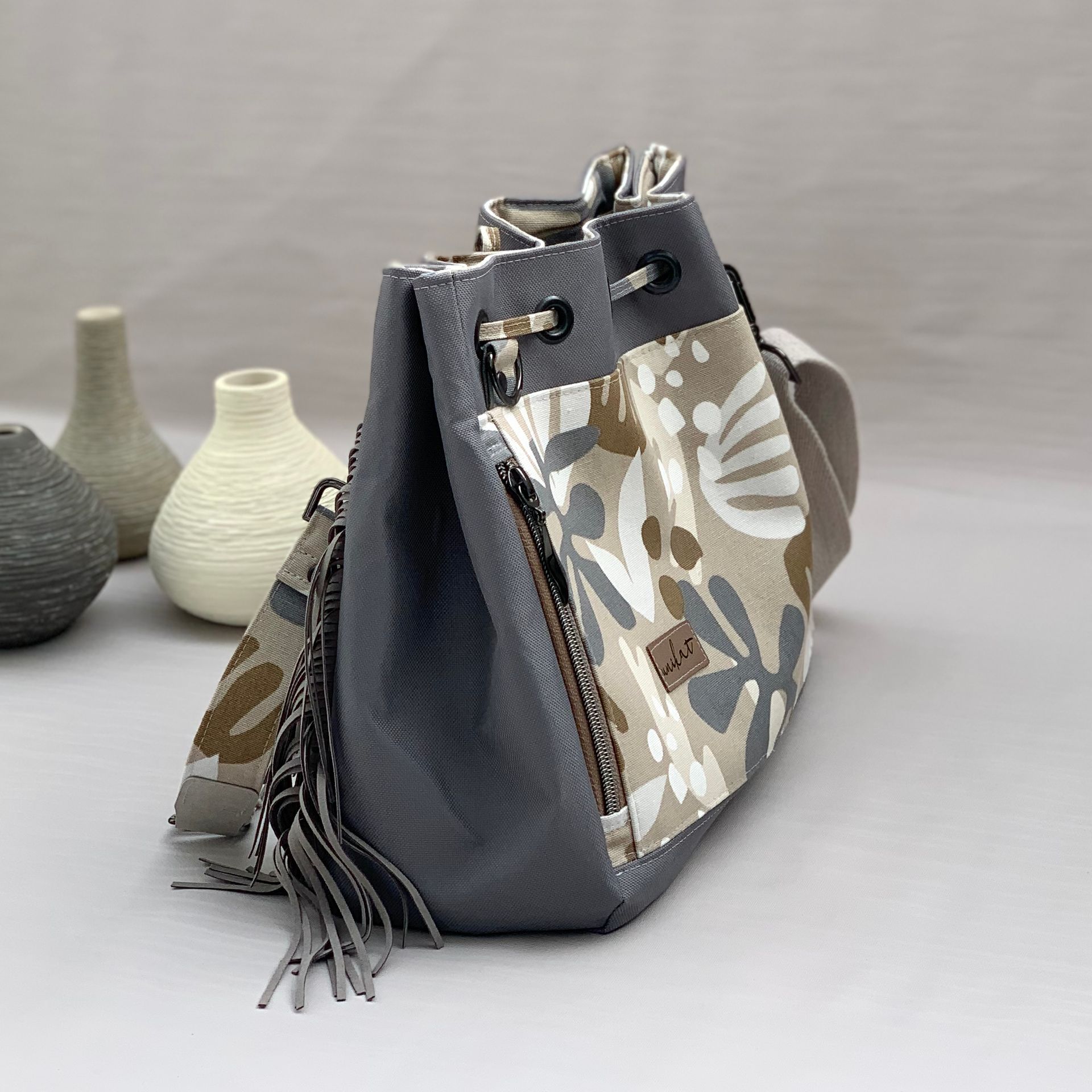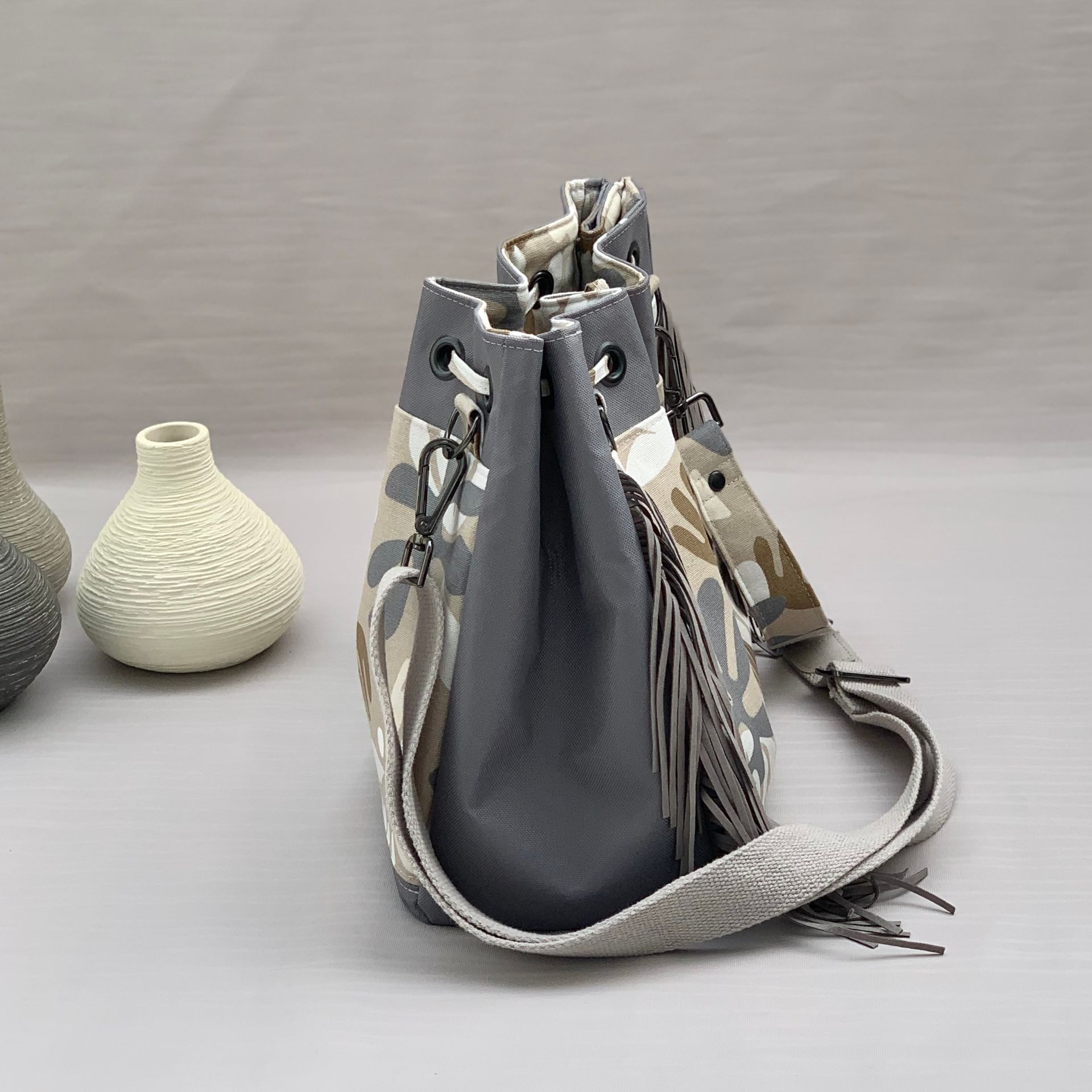 - Material: wasserabweisender Stoff (Uni-Grau), Canvas (gemustert)