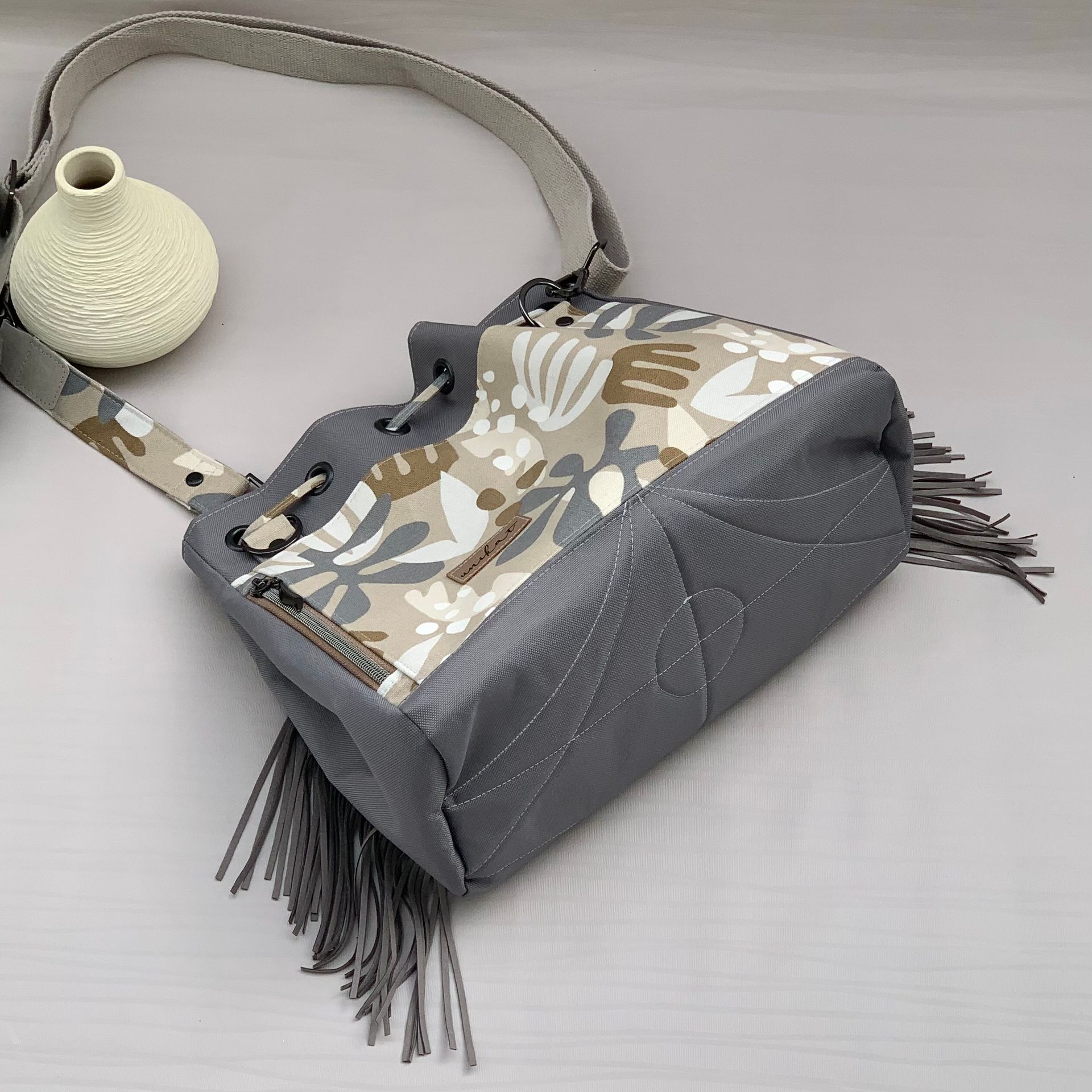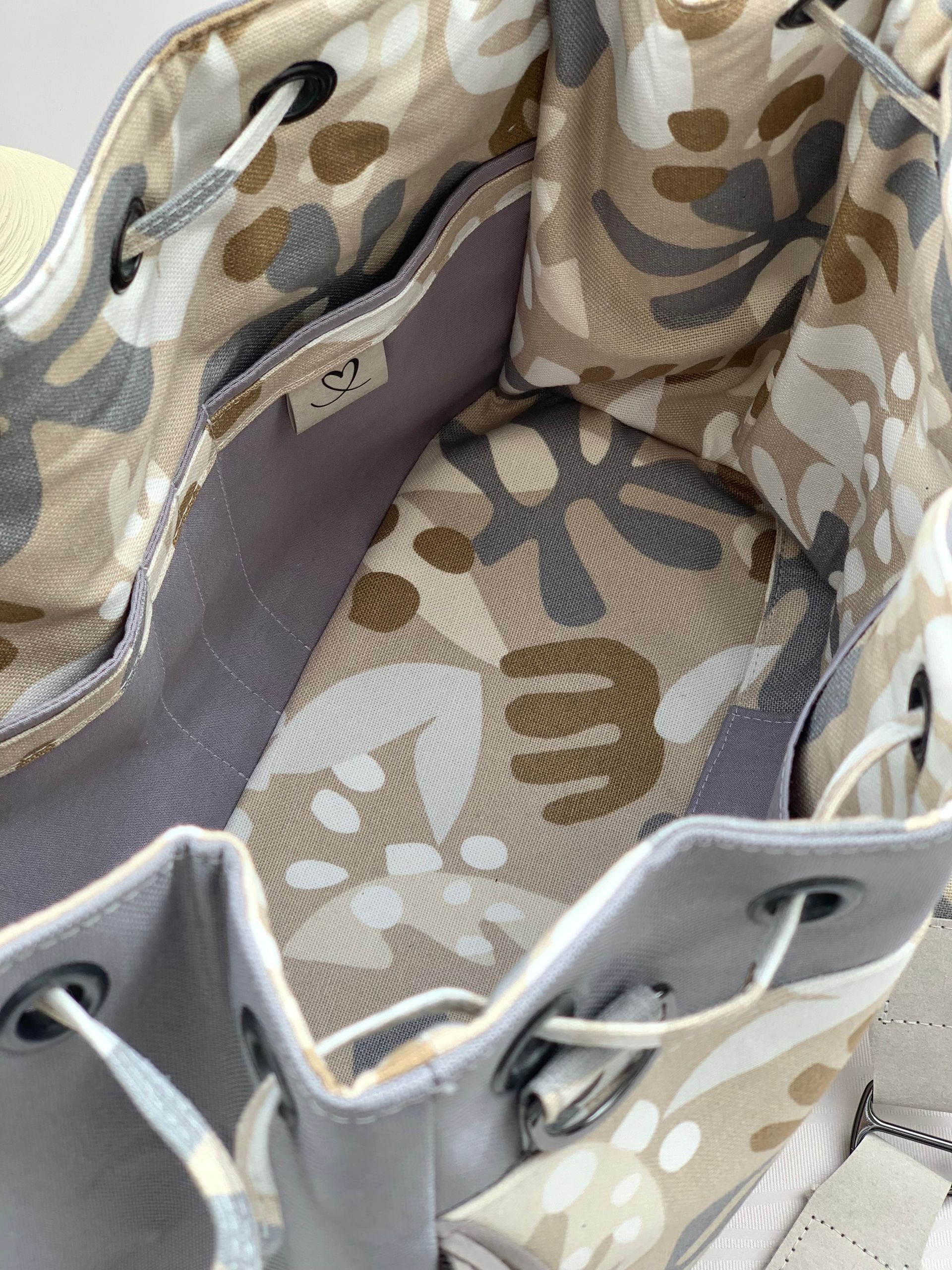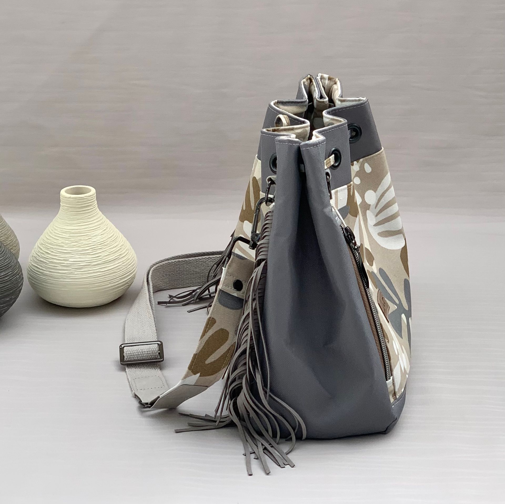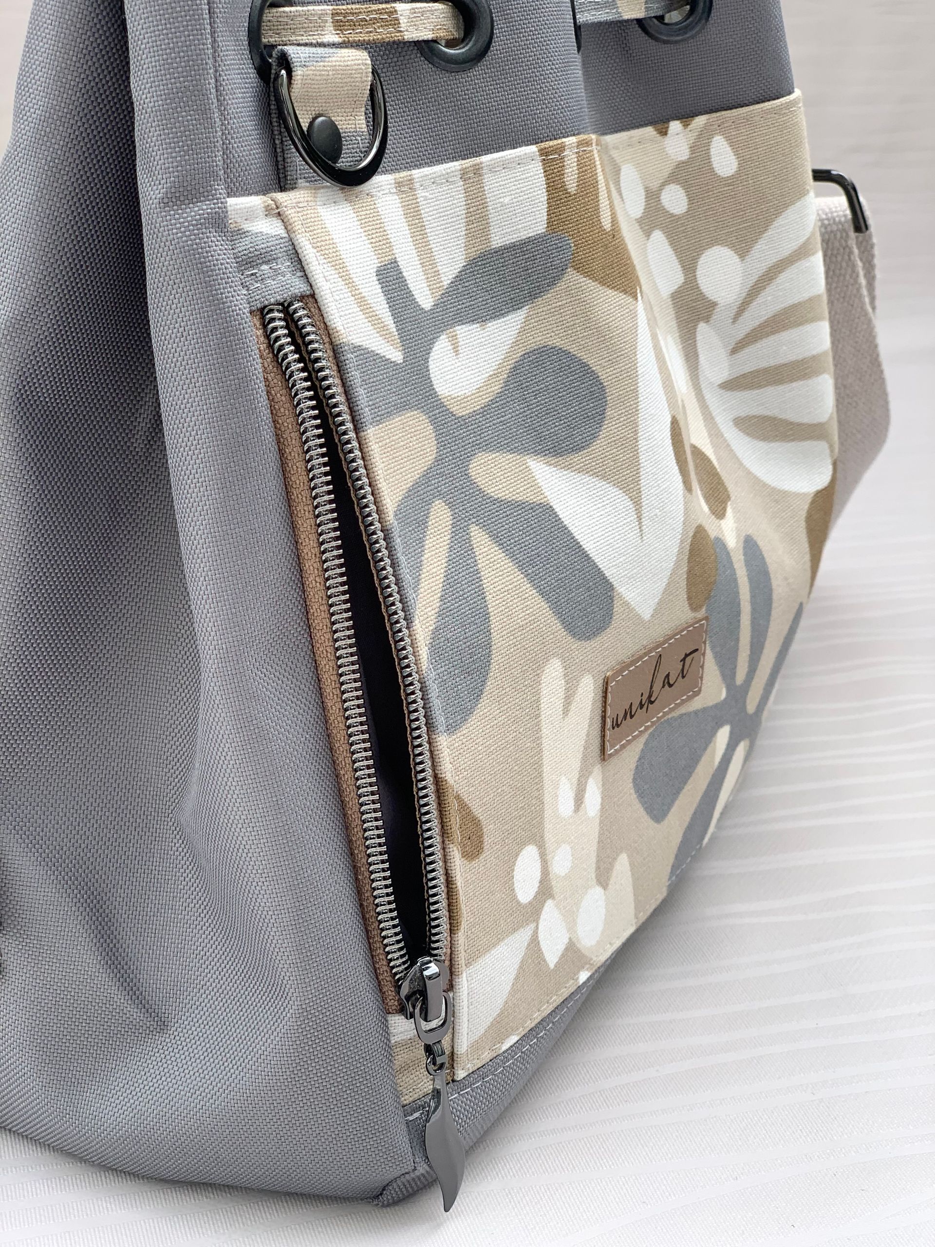 - Material: wasserabweisender Stoff (Uni-Grau), Canvas (gemustert)