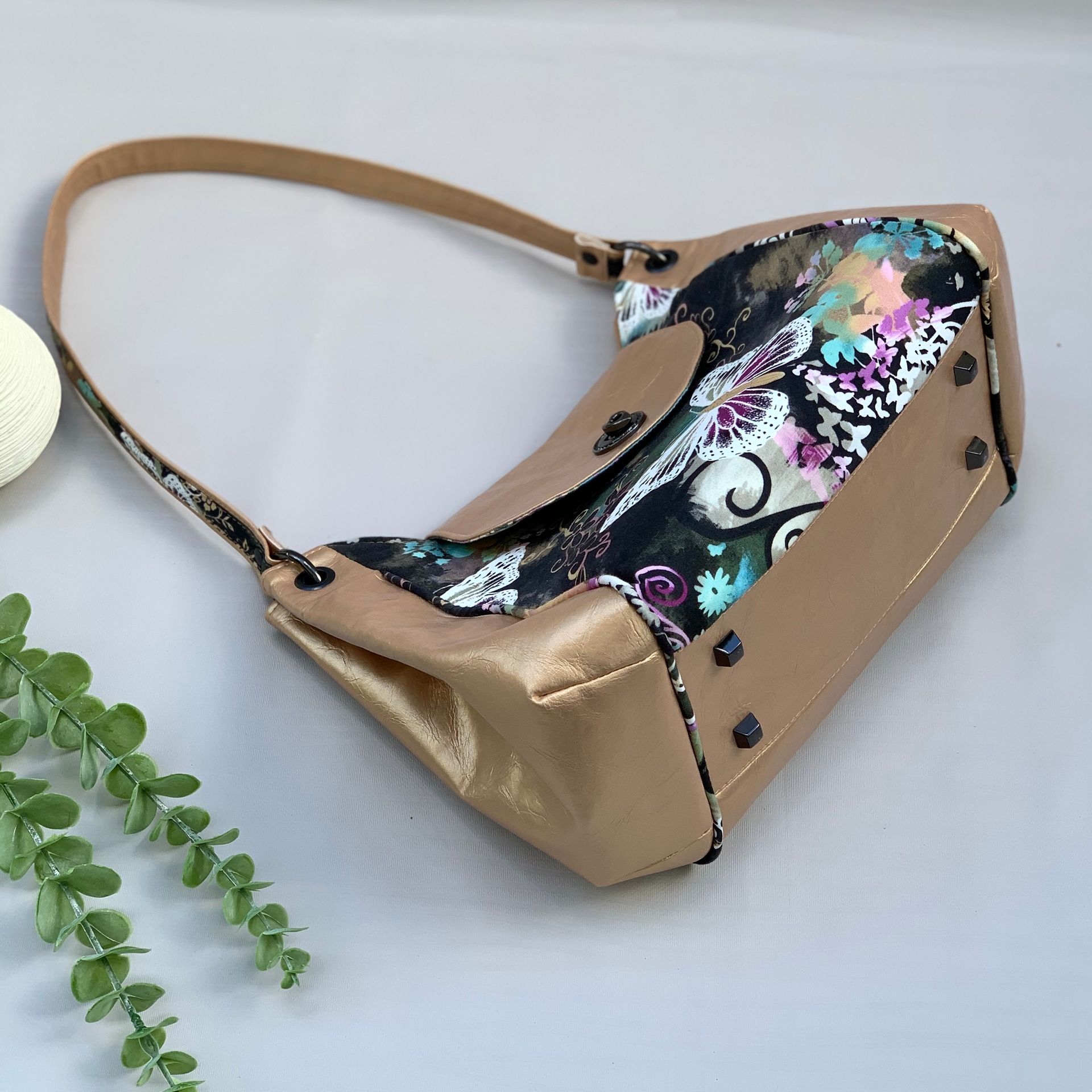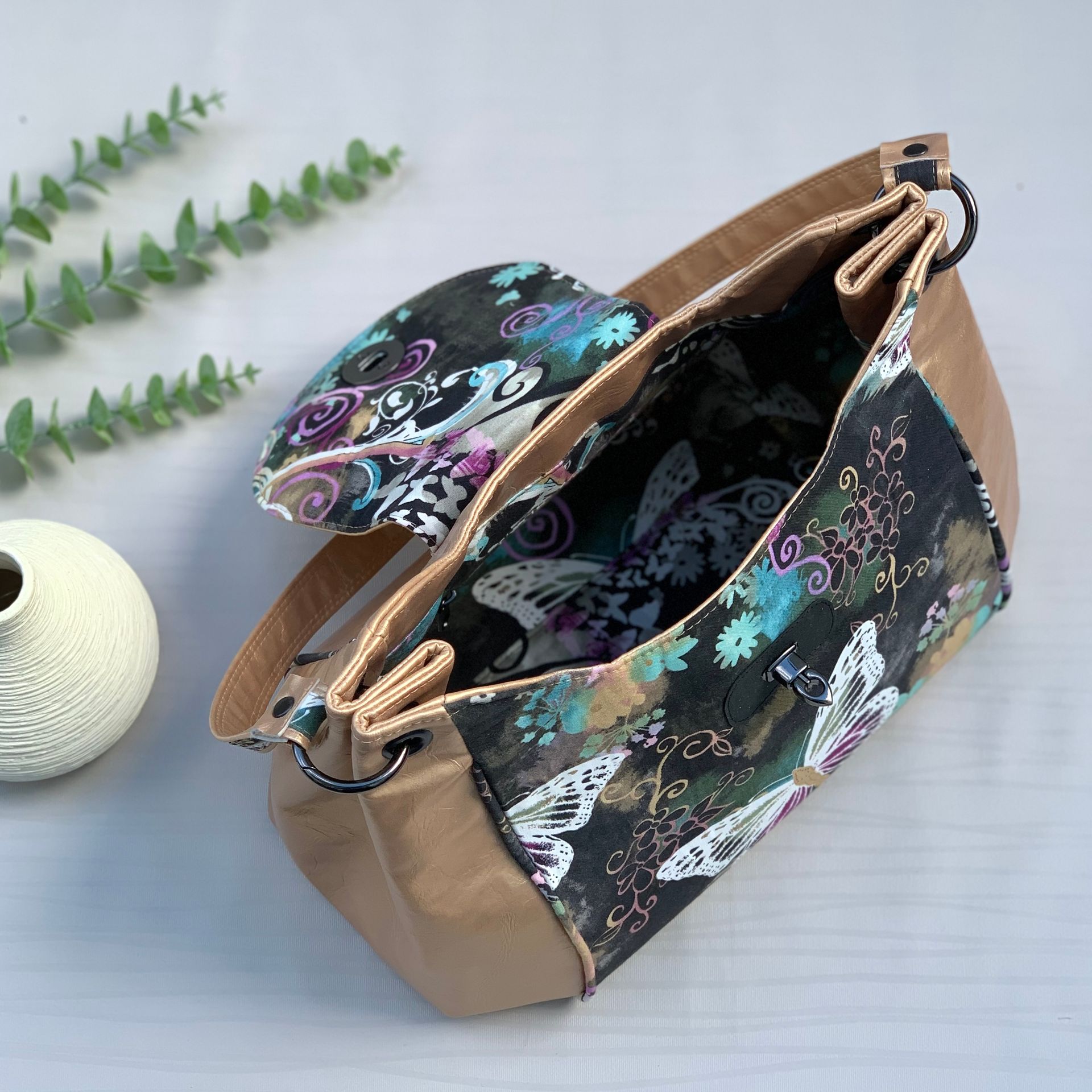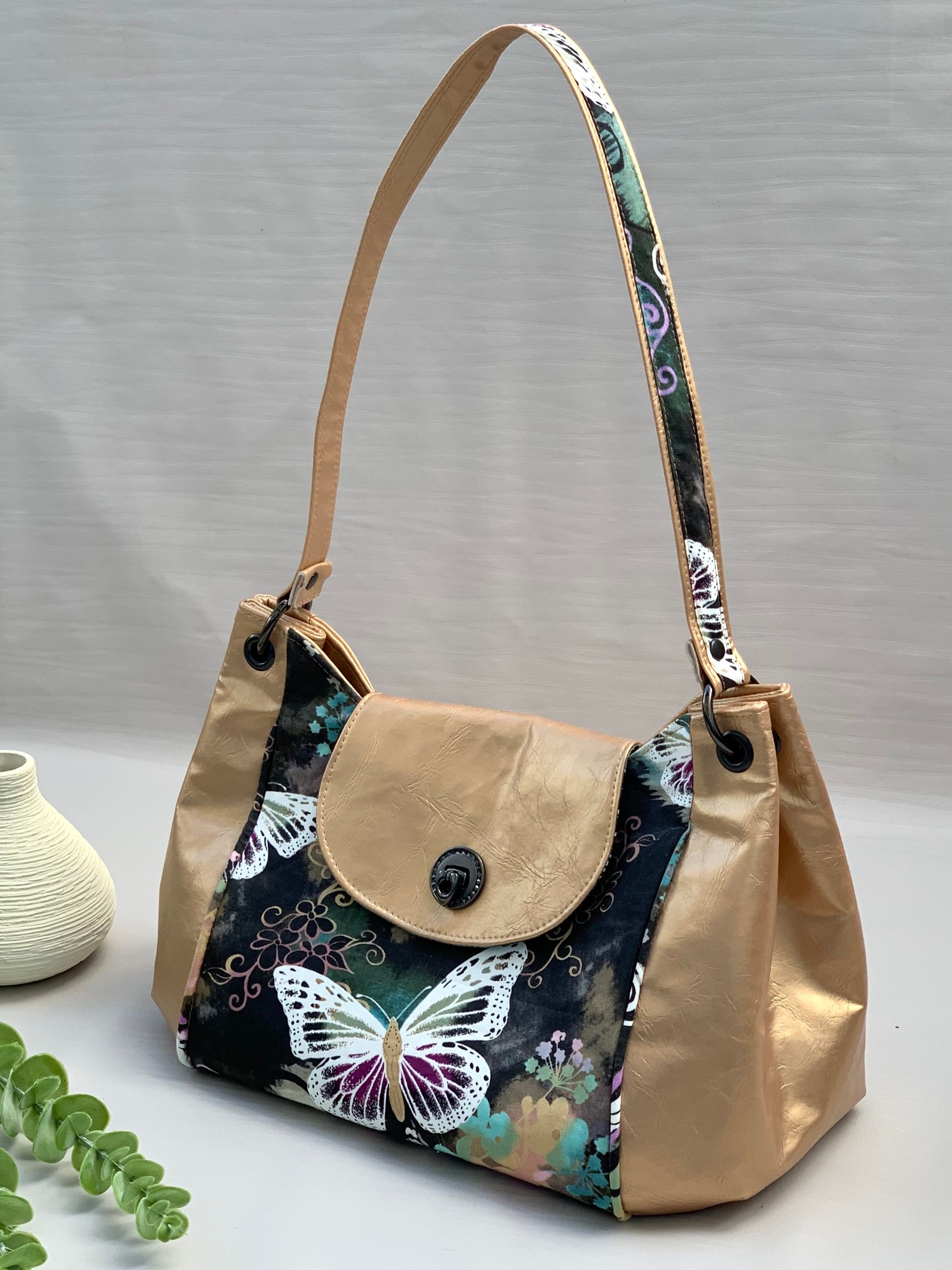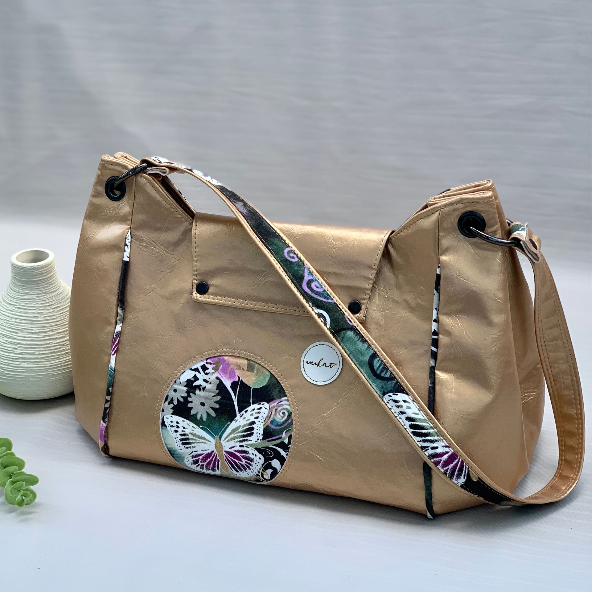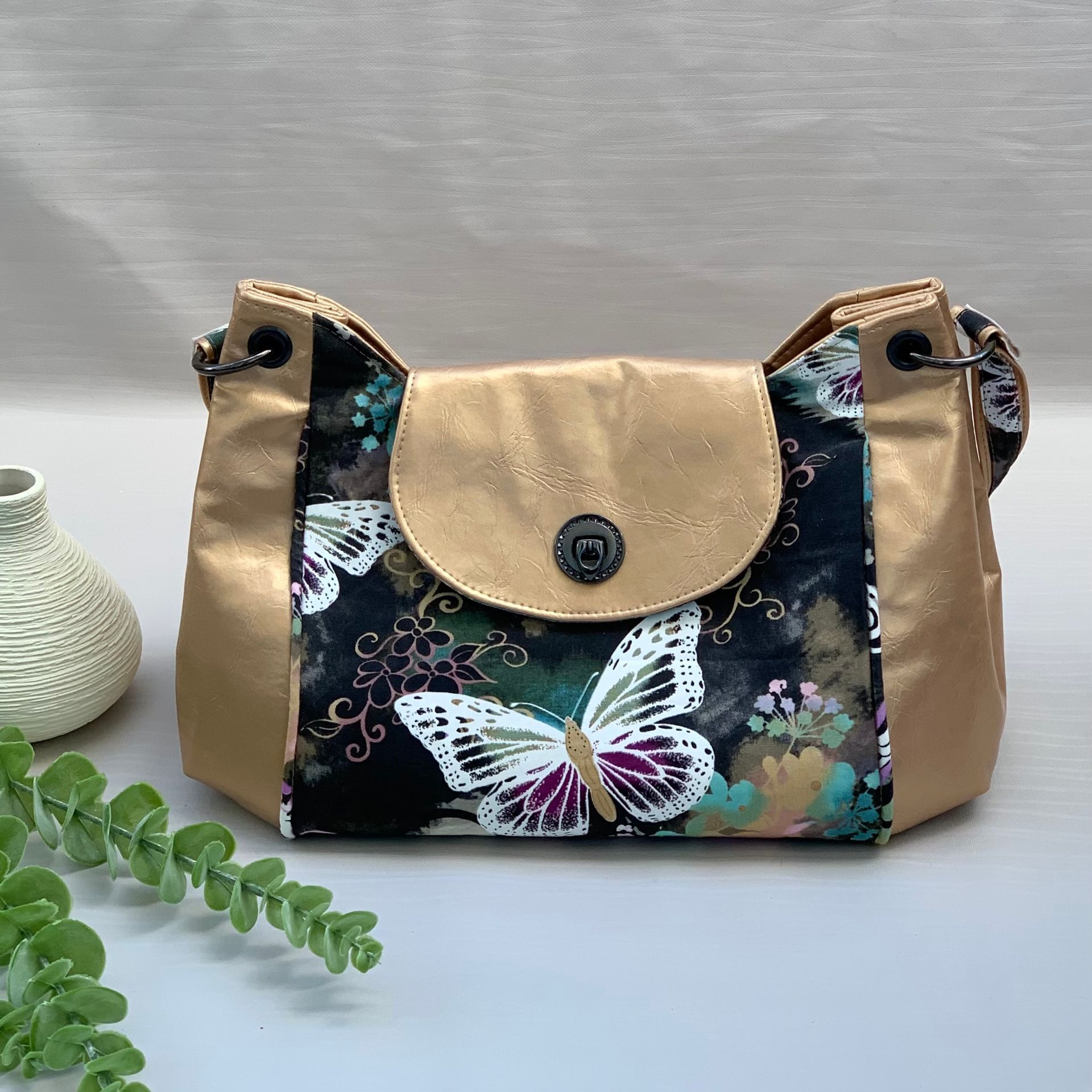- Material: Lederimitat Gold, Baumwollstoff mehrfarbig mit Schmetterlingen